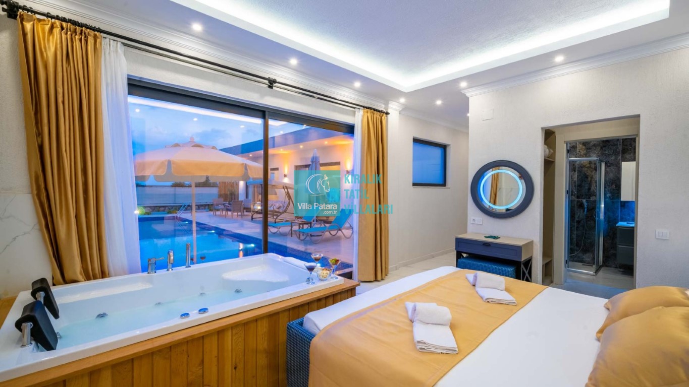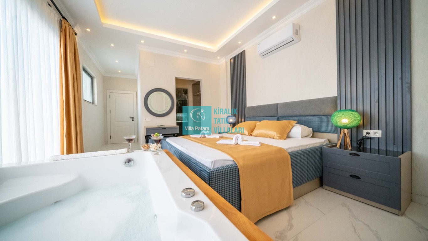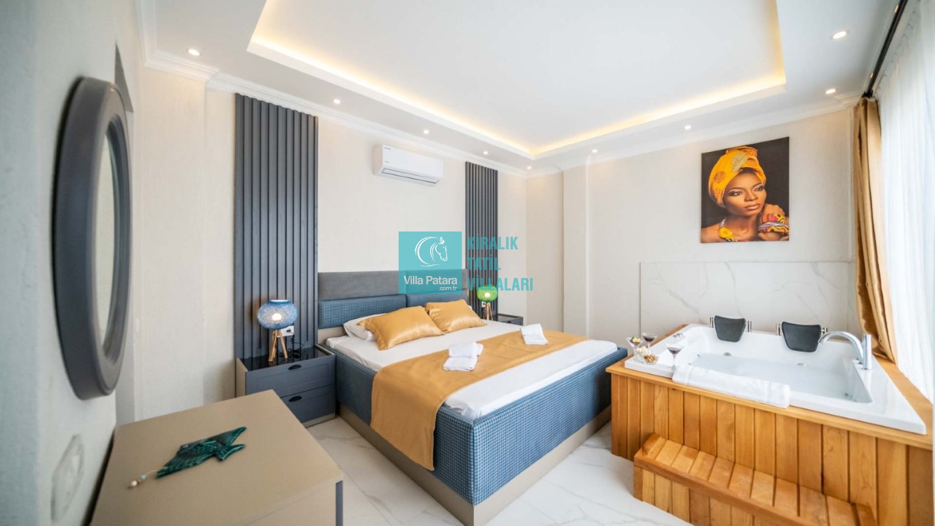 1.Yatak Odası: 1 adet çift kişilik yatak, elbise dolabı, komodin, makyaj masası , klima, jakuzi ve banyo-WC bulunmaktadır.