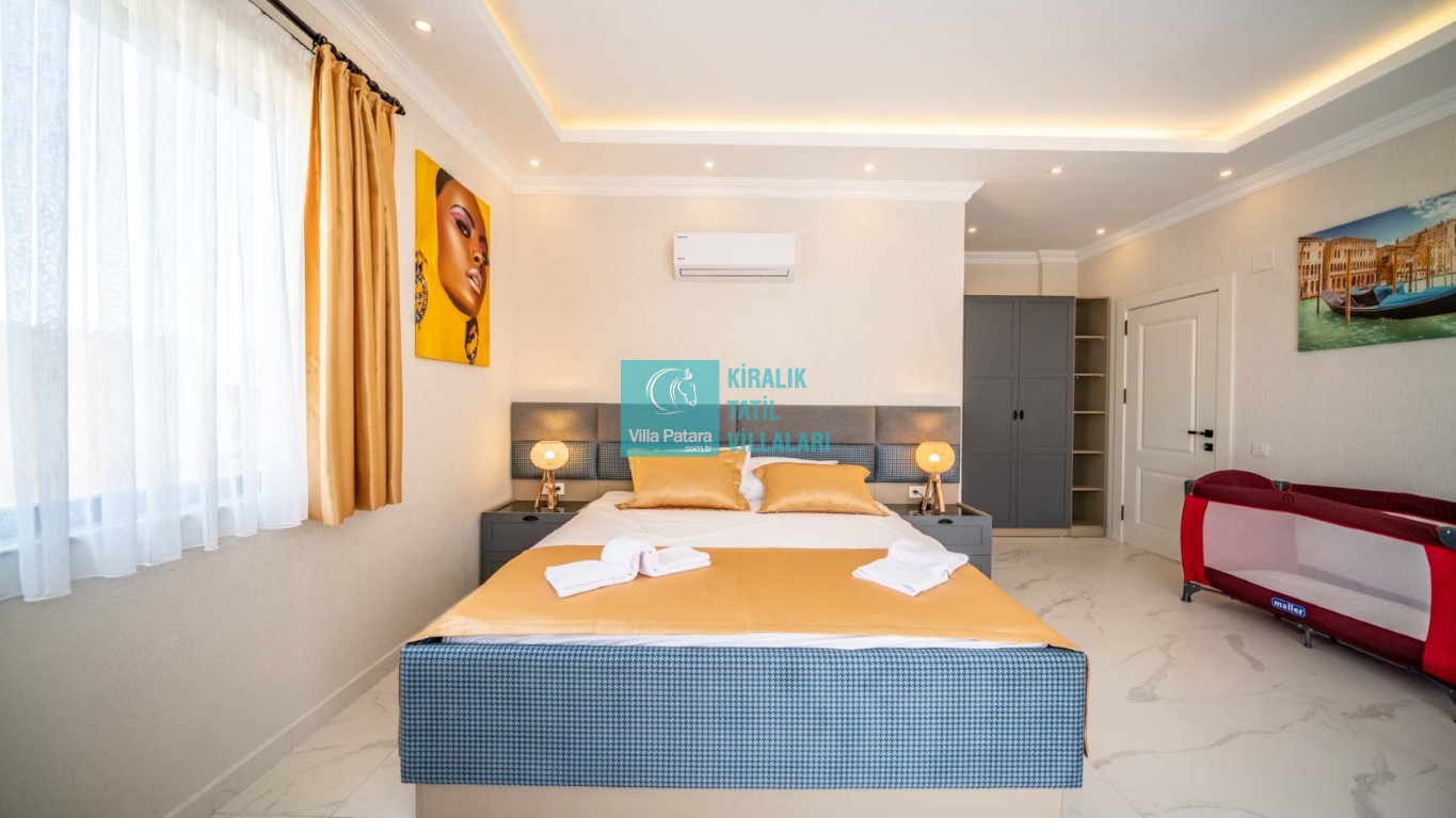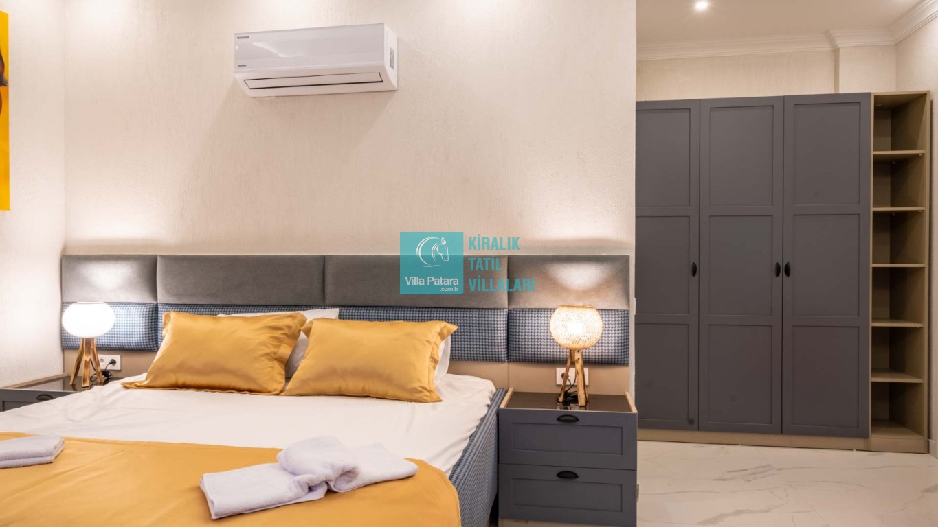2.Yatak Odası: 1 adet çift kişilik yatak, elbise dolabı, komodin, makyaj masası , klima ve banyo-WC bulunmaktadır.