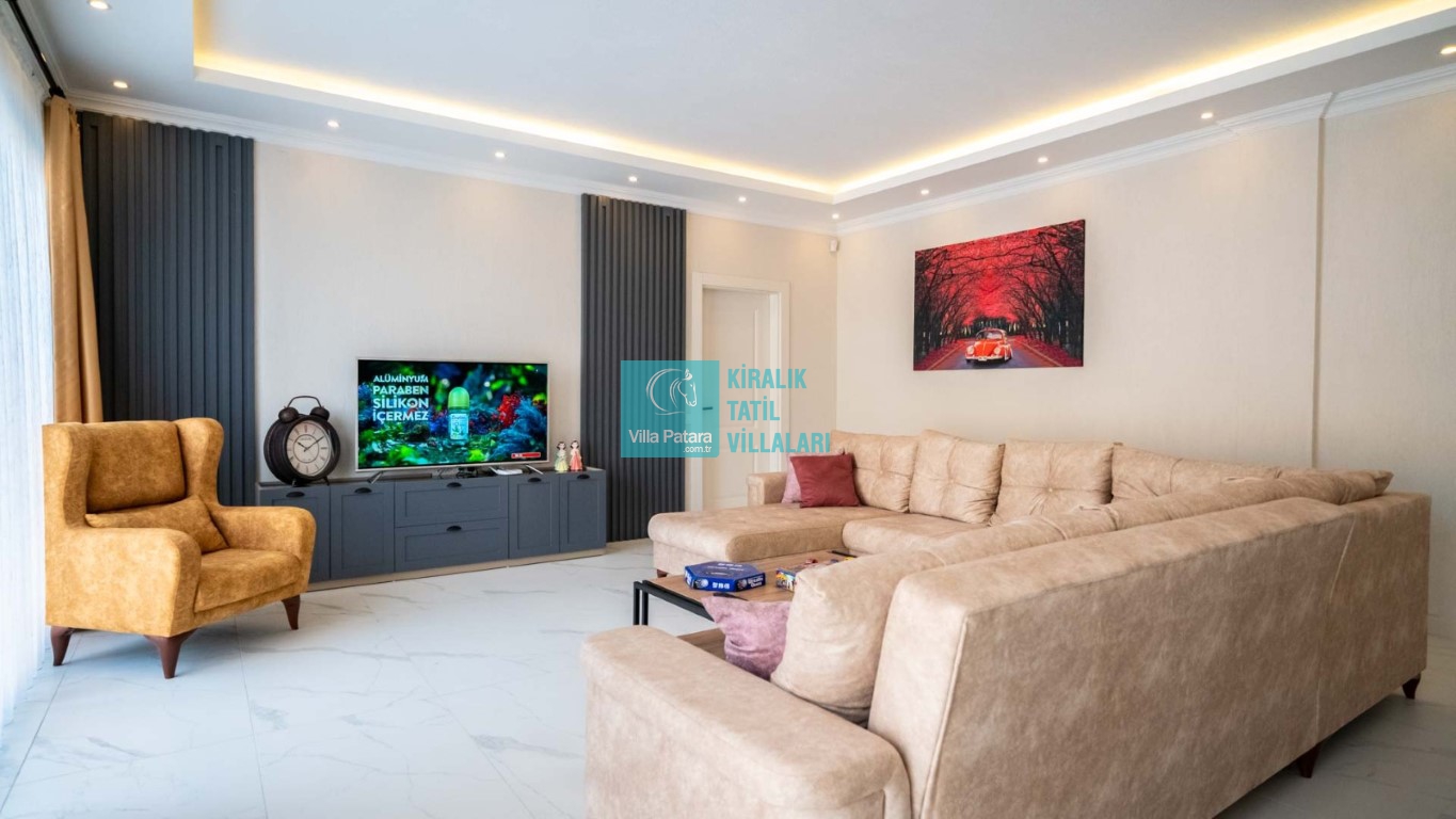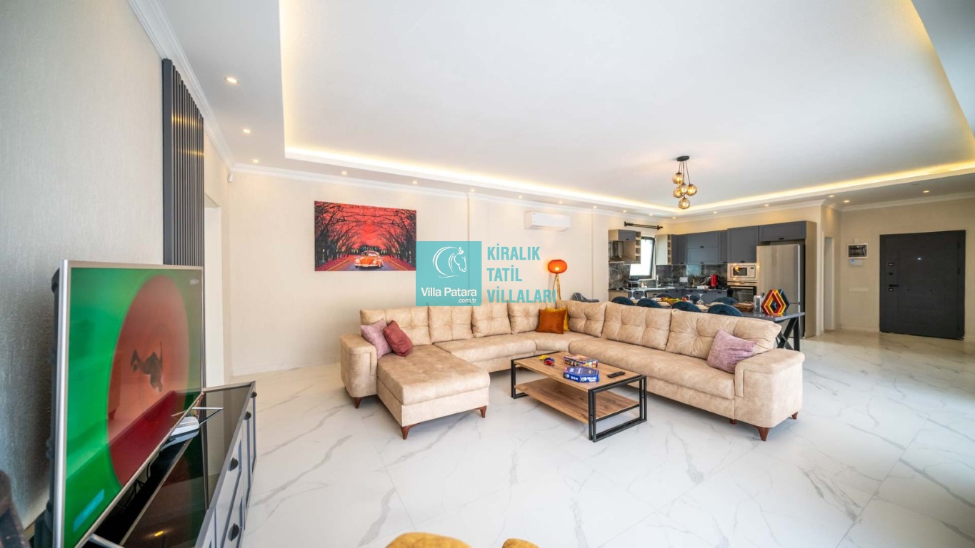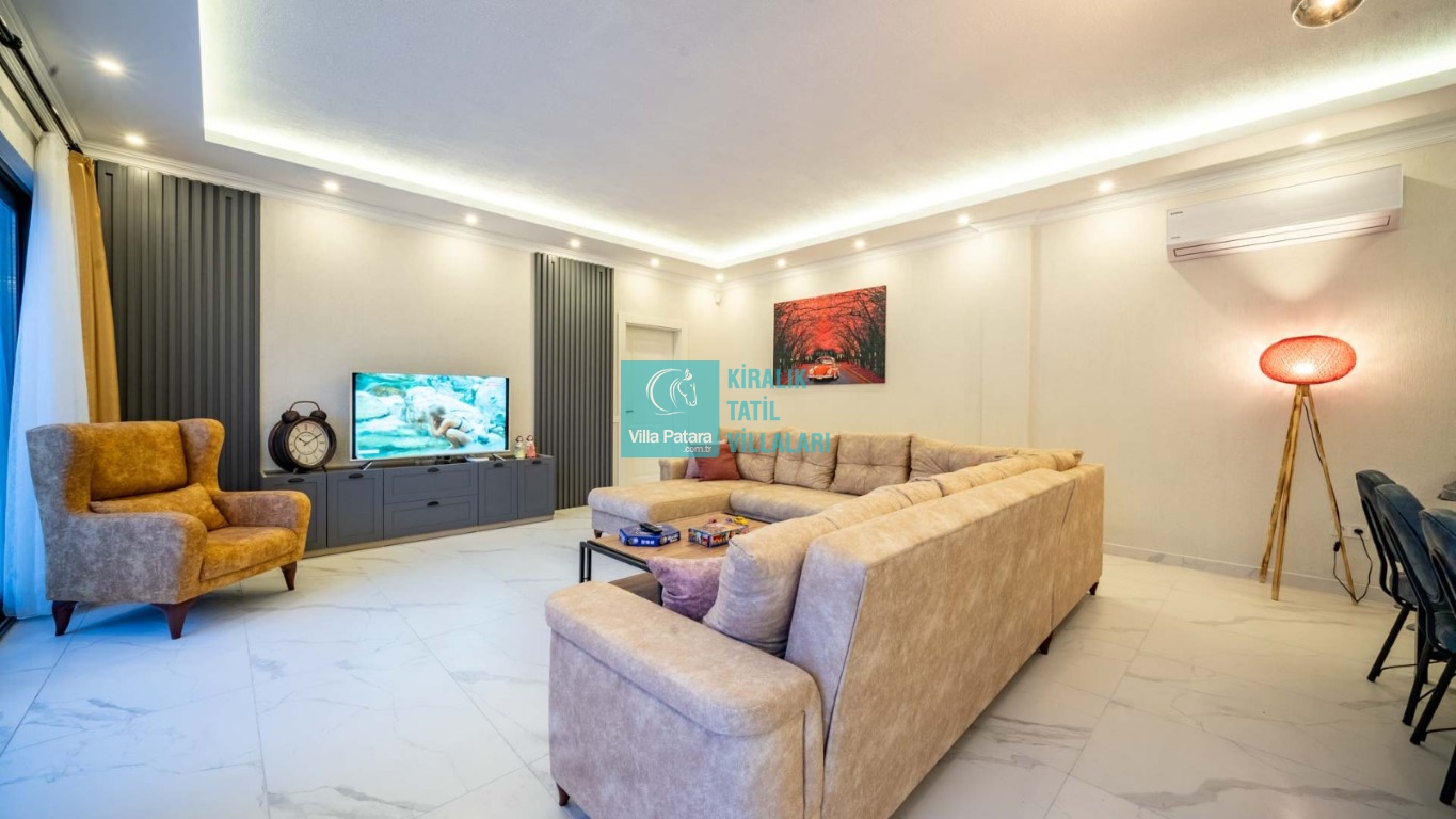 Konforlu koltuk takımı ile dizayn edilmiş geniş ferah ve modern bir salona sahiptir. Salonda televizyon, uydu alıcı, orta sehpa ve klima bulunmaktadır. Ayrıca salondan havuz terasına çıkış sağlanmaktadır.