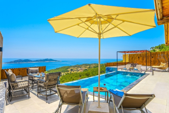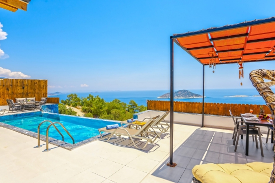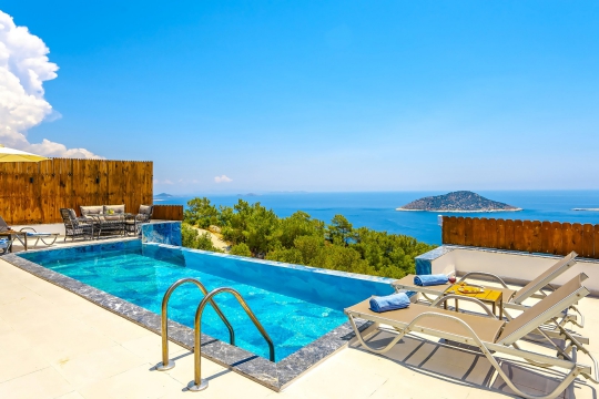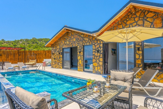 Villamızın havuz ve bahçe kısmı korunaklı olup deniz manzaralı dır.Muhafazakar çiftlerin havuz keyfini rahatça çıkarması için dizayn edilmiş olan villamız dışarıdan görünmemektedir, ayrıca villamızda bulunan jakuzi sayesinde ruhunuzu ve bedeninizi dinlendirme fırsatı bulacaksınız.