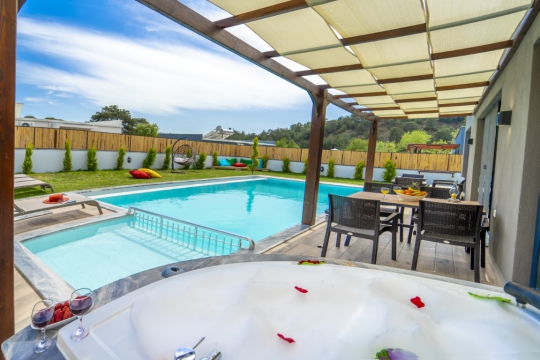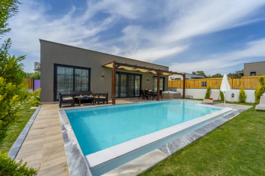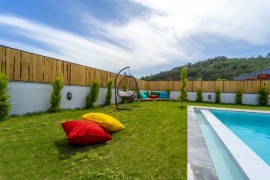 Havuz : Villamıza ait ebatları; 4 X 8 metre ve derinliği 1.50 metre olmak üzere özel yüzme havuzu bulunmaktadır. Havuz ve bahçe bakımı günde 1 kez sabah veya akşam yapılmaktadır. Havuz kenarında ise şezlong, bahçe oturma grubu, yemek masası, salıncak ve çocuk parkı bulunmaktadır.