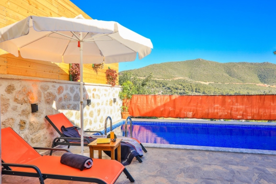Havuz ve Bahçe: Havuz terası doğa manzaralı olup özel yüzme havuzu, şezlonglar, güneş şemsiyesi bulunmaktadır.