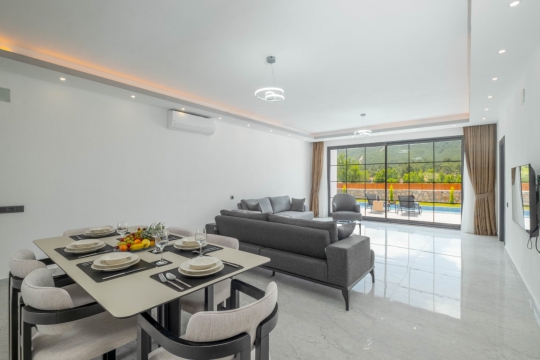 Salon : Şık mobilyalar ile dizayn edilmiş olan salonumuzda; modern oturma grubu, sehpa, tv, klima, uydu alıcısı ve kablosuz modem bulunmaktadır. Havuz terasına çıkış yapılabilmektedir.