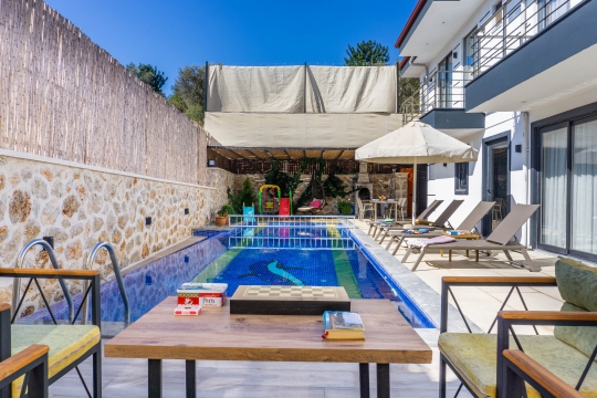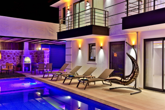 Kalkan Patara mevkisinde bulunan kiralık balayı villası, merkeze yürüme mesafesinde bir tatil isteyen çiftlerimiz için oldukça uygun bir seçenektir. Muhafazakar villalar ve balayı villaları kategorisinde yer alan villamız, 2 yatak odası ile 4 kişilik konaklama kapasitesine sahiptir. Havuzu korunaklı ve bahçesi dışarıdan görünmeyen Villa Hanedan Uno, mahremiyete önem veren ailelerimiz için huzur dolu bir tatil fırsatı sunuyor. Ayrıca her iki yatak odasında misafirlerimizin rahatlaması için 2 kişilik jakuzi konforu da sağlamaktadır.