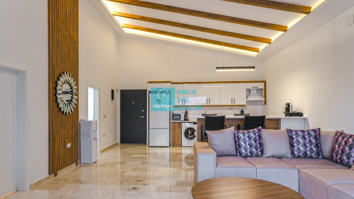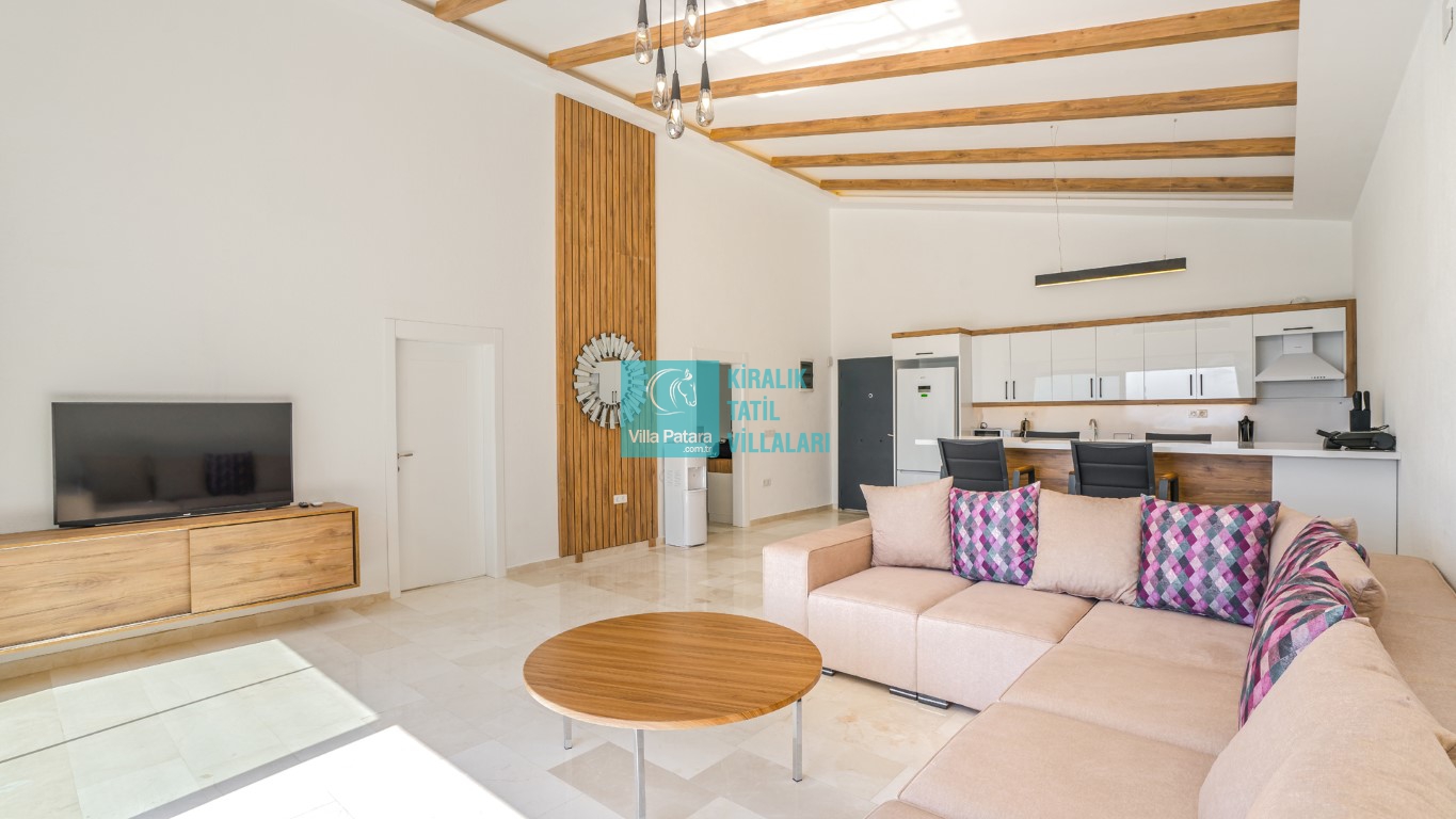 Salon: Amerikan mutfak olarak dizayn edilmiştir, oturma grubu, TV, yemek masası ve klima bulunmaktadır.