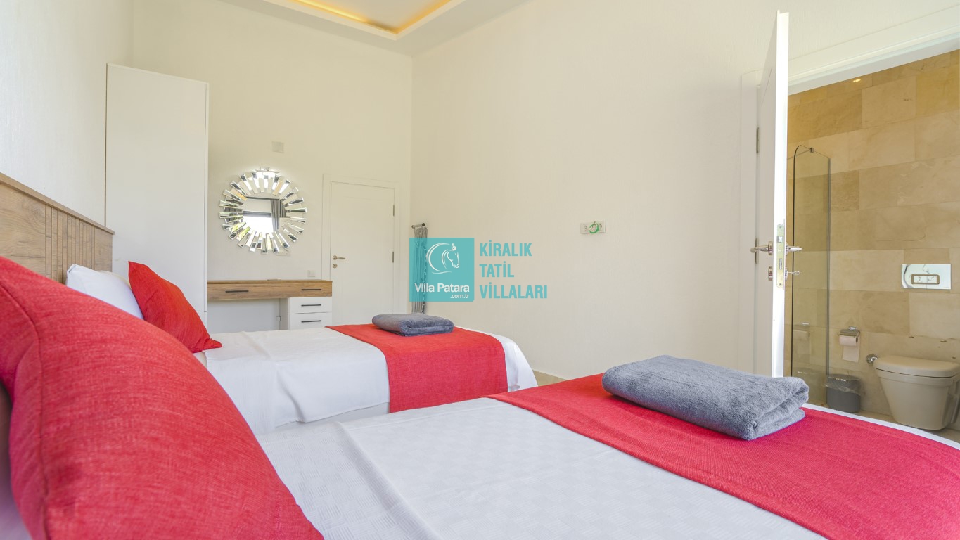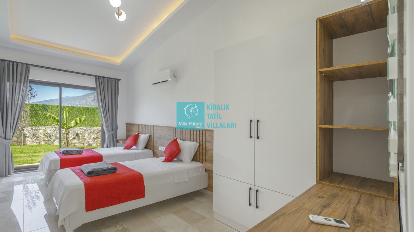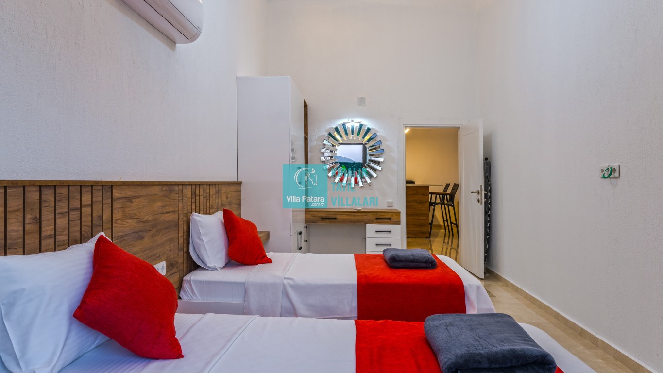 2. Yatak Odası : 2 adet tek kişilik yatak, klima, komodin, makyaj masası, elbise dolabı ve banyo tuvalet bulunmaktadır.