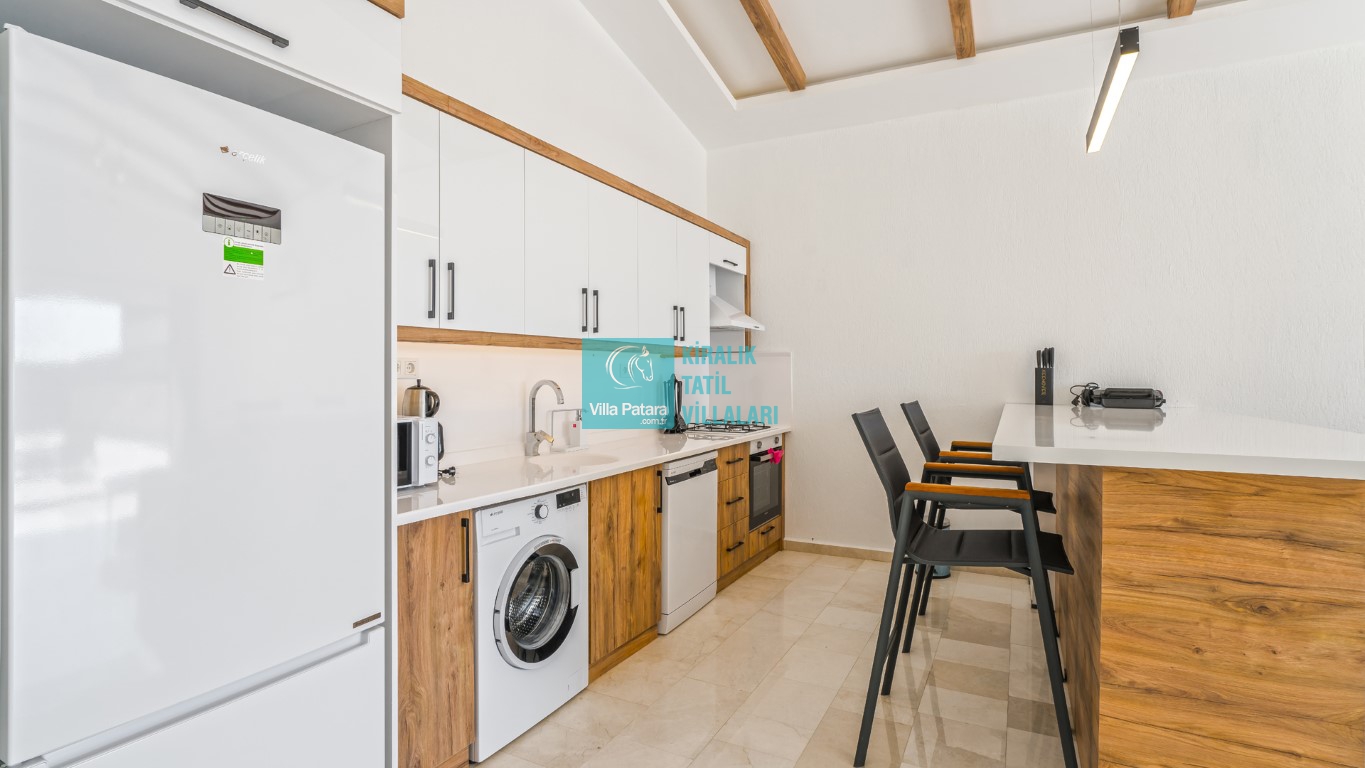Mutfak: Modern Amerikan mutfakta ; buzdolabı, bulaşık makinesi, çamaşır makinesi, ankastre fırın, mikrodalga fırın, 4'lü ocak, tencereler, tavalar, bardaklar, elektrikli su ısıtıcısı, yemek takımı, çatal - kaşık takımı, yemek masası ve sandalyeler bulunmaktadır.