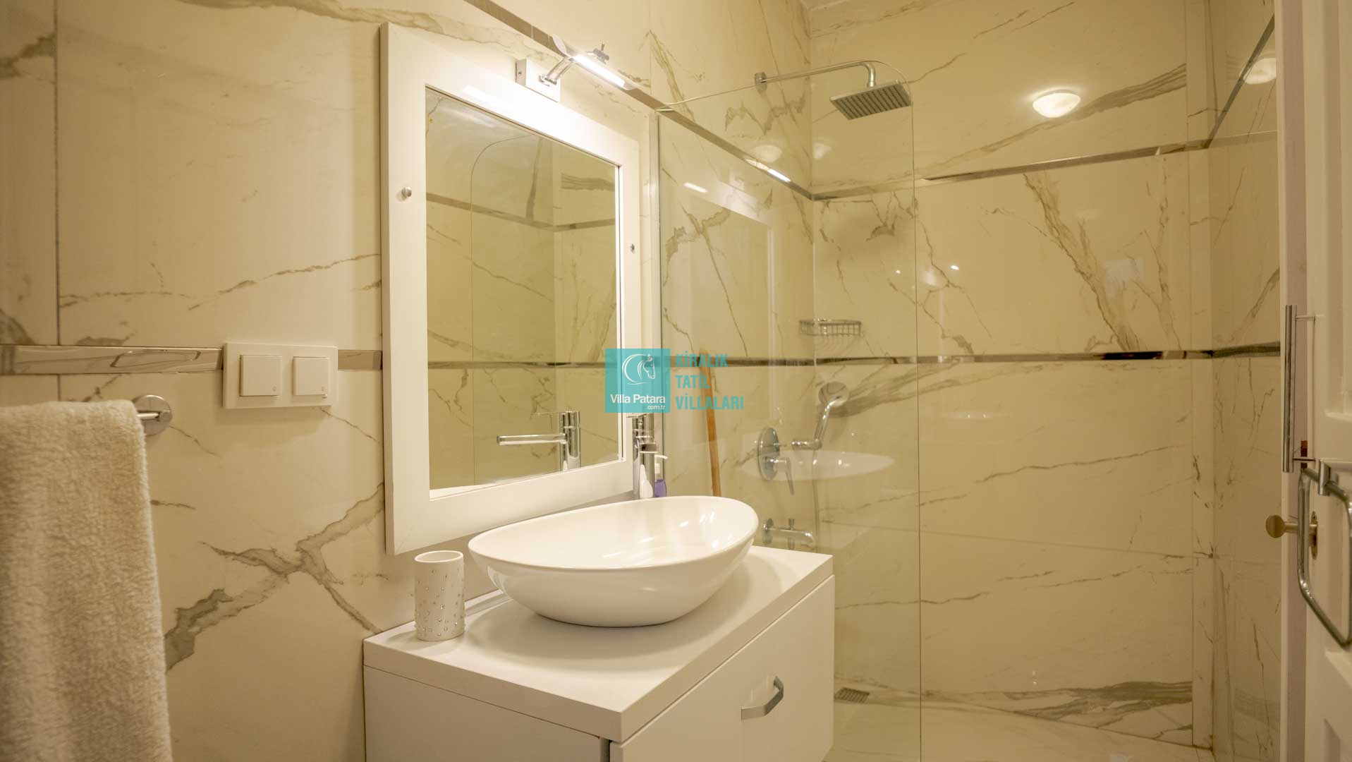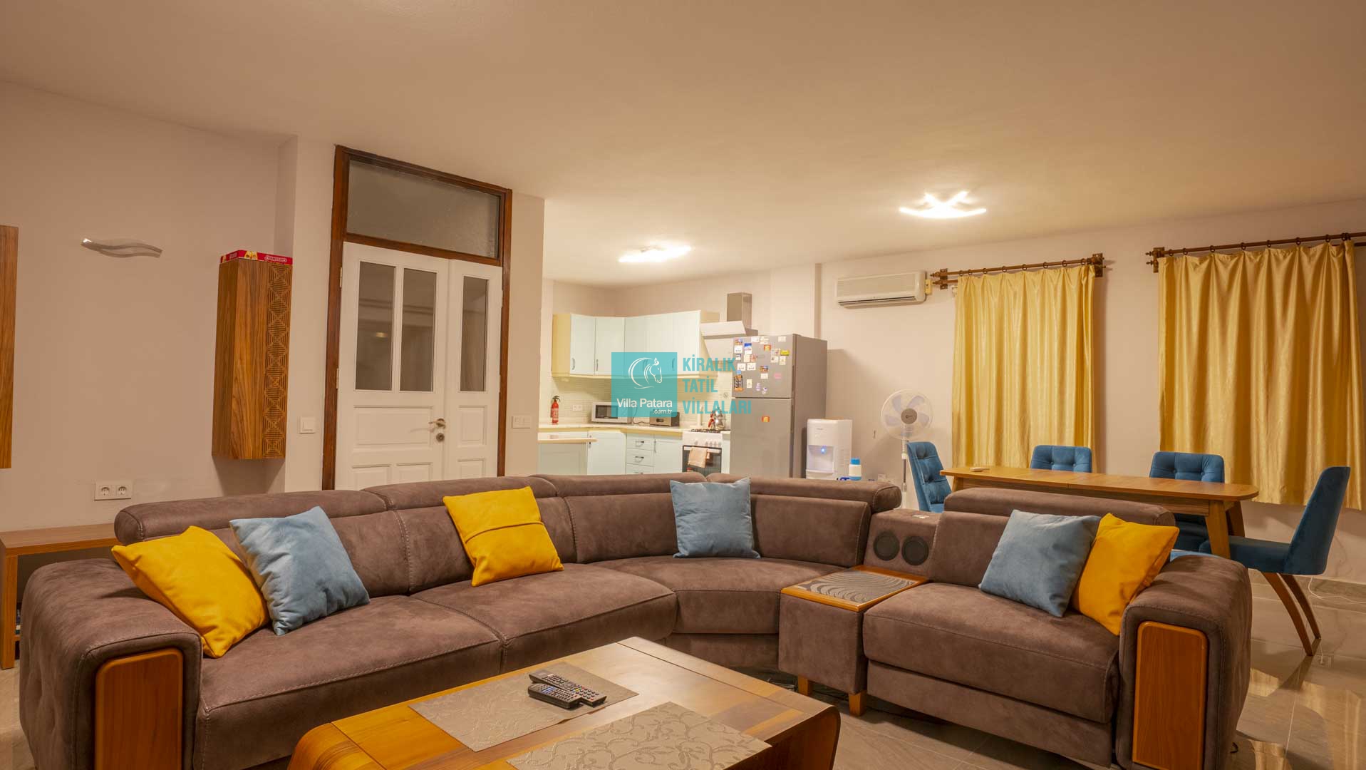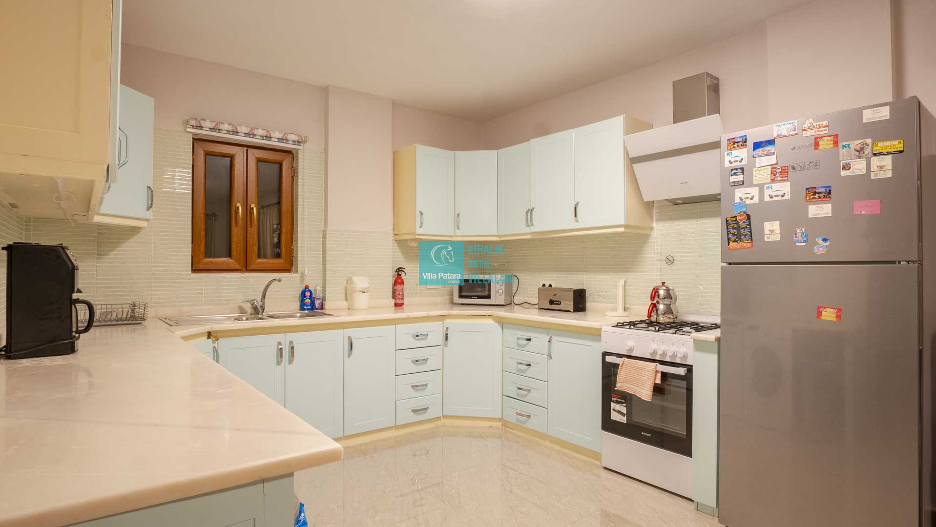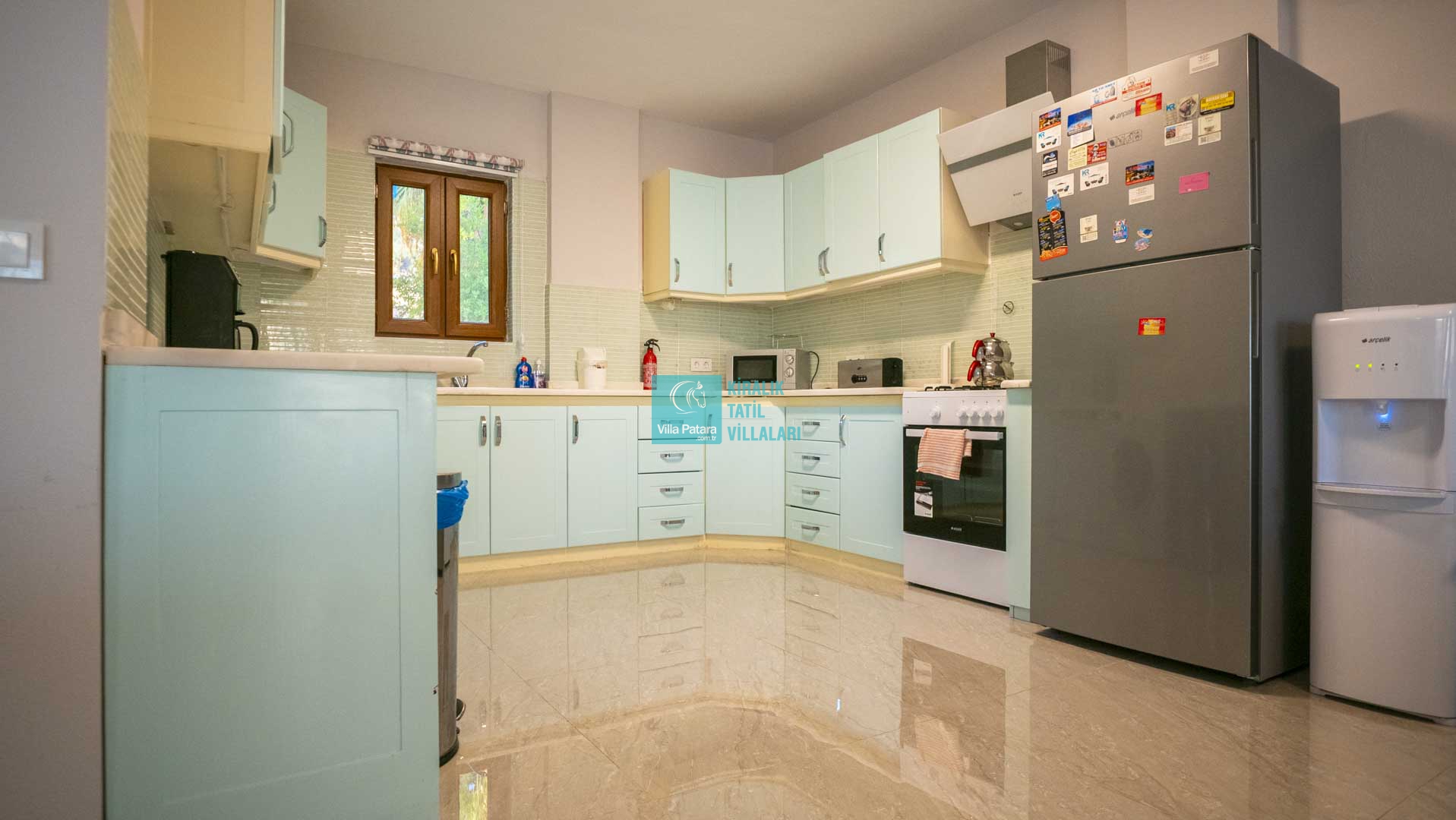 Mutfak: Villamızın modern amerikan mutfağı içerisinde buzdolabı, çamaşır ve bulaşık makinesi, 4lü ocak, mikrodalga fırın, kettle, tost makinesi, yemek masası, yemek takımı, çatal bıçak takımı, tava ve tencereler bulunmaktadır.