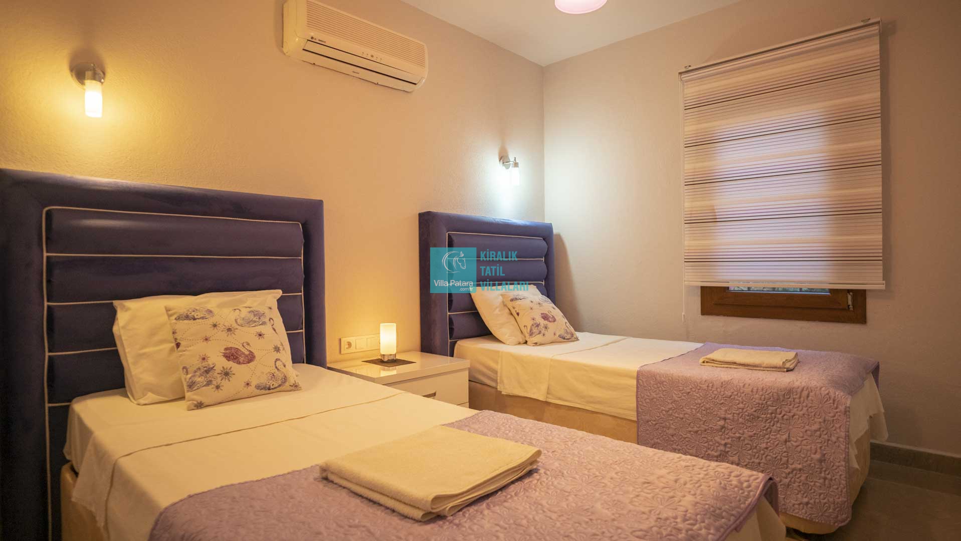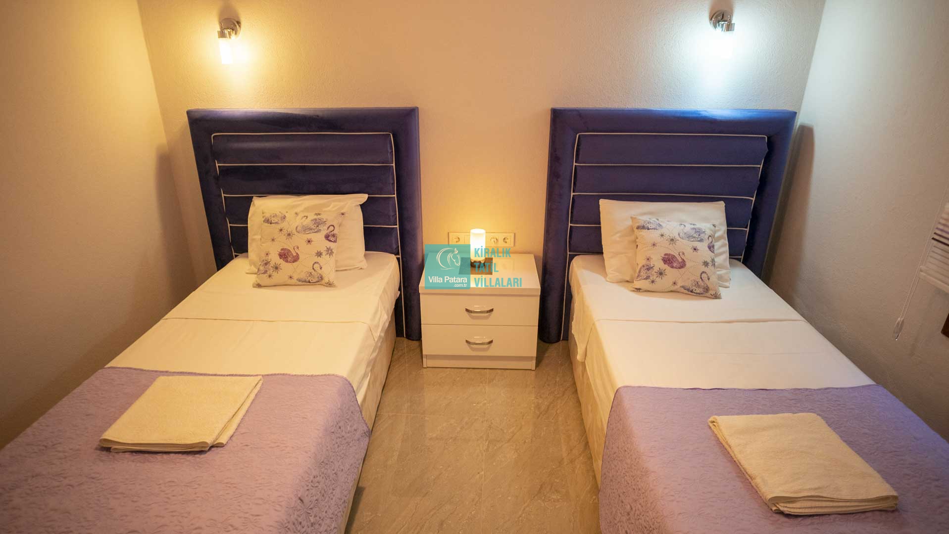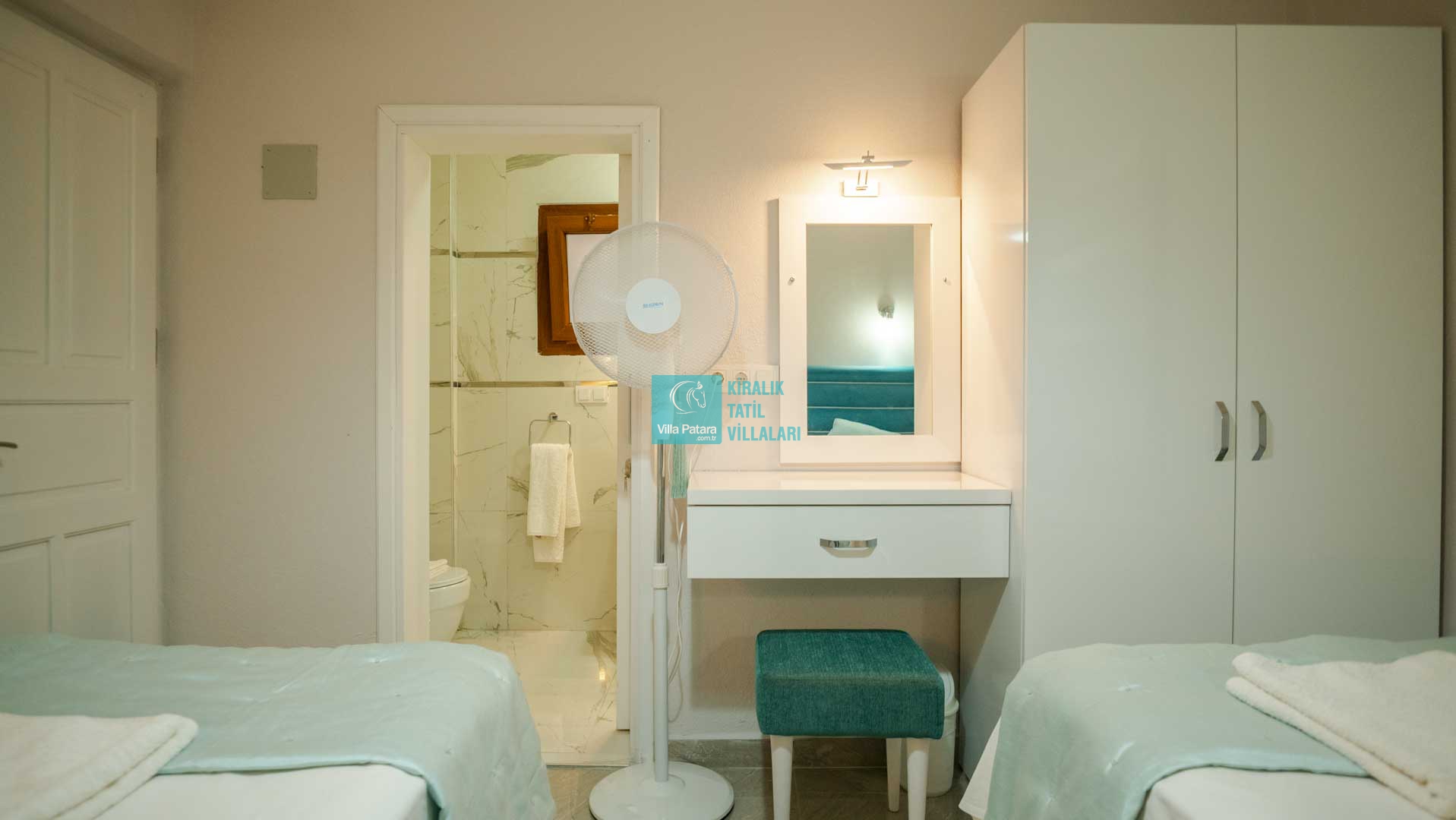 3. Yatak Odası: 2 adet tek kişilik yatak, komodin, elbise dolabı, makyaj masası, puf, klima, banyo ve wc bulunmaktadır.