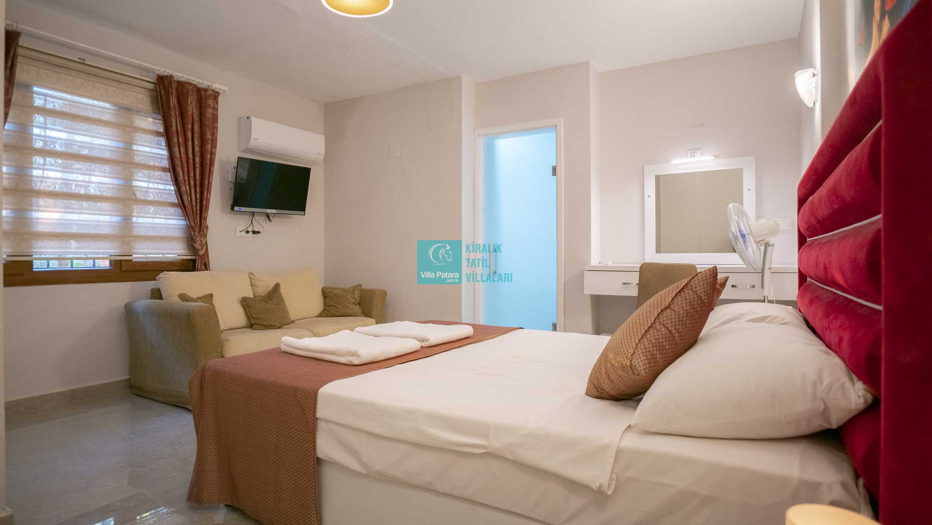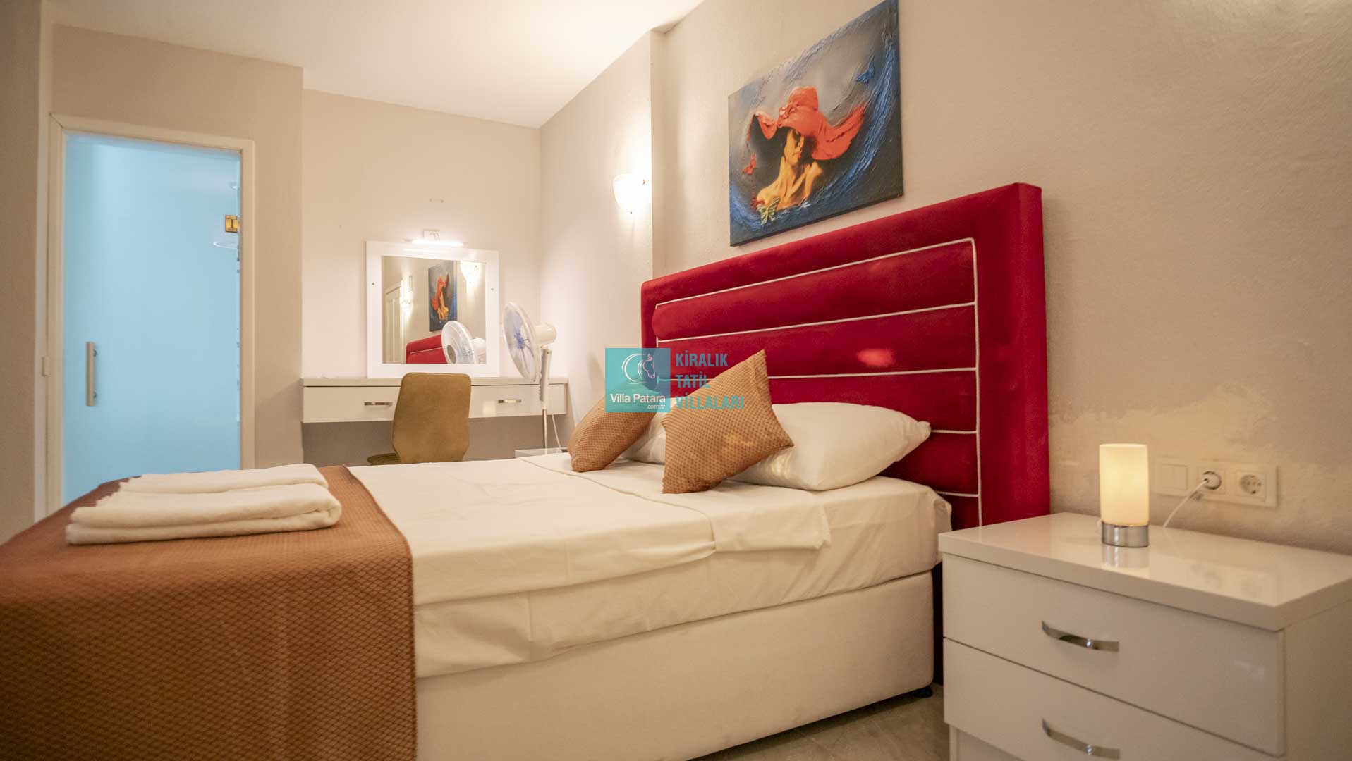 1. Yatak Odası:Çift kişilik yatak, komodin, elbise dolabı, makyaj masası, puf, tv, klima, jakuzi, banyo ve wc bulunmaktadır.
