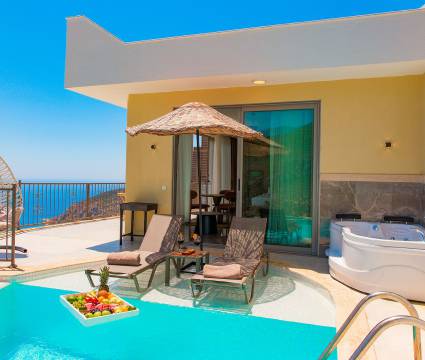 Villa Sunrise eşsiz deniz manzarasıyla nefeslerinizi kesecek ve siz değerli misafirlerimiz manzara ile lüksün keyfini sürerken tüm senenin yorgunluğunu atacaksınız. Villa Sunrise konum olarak Kaputaş Kanyonunun yanında yer alıyor ulaşım olarak biraz köy yollarına maruz kalmanız gerekse de her güzelin bir kusuru vardır diyip manzarayı görünce herşeyi unutacaksınız. Villa Sunrise suit oda olarak tasarlandı ve 2 kişilik kapasitesiyle siz değerli misafirlerimizin ihtiyaç duyacağın herşeyi içinde barındırıyor. Benzersiz bir tatil fırsatı için de Villa SUNRISE sizleri ağırlamak için bekliyor.