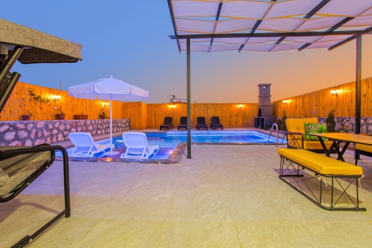 Ebeveyn odasındaki iki kişilik jakuzisi de misafirlerimize ekstra rahatlama imkanı sunuyor. Villamız Havuzu korunaklı (Havuzun dışarıdan gözükmediği anlamına gelir) özelliği ile mahremiyete önem veren misafirlerimiz için de tatil imkanı sunmaktadır.