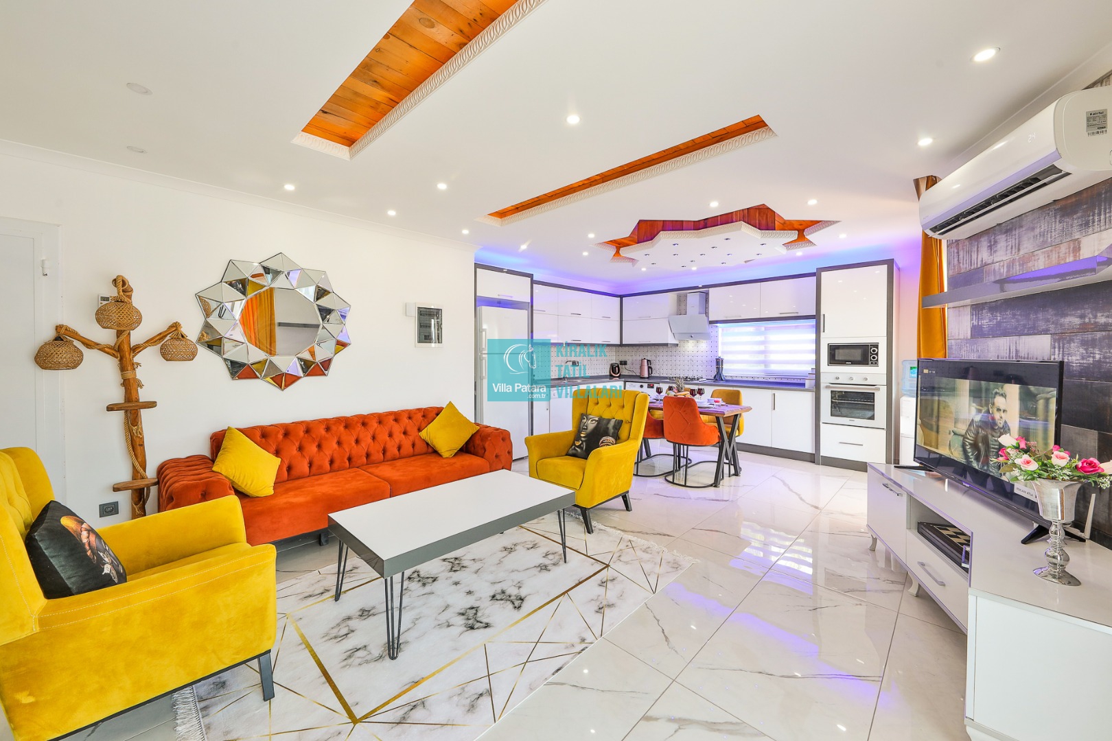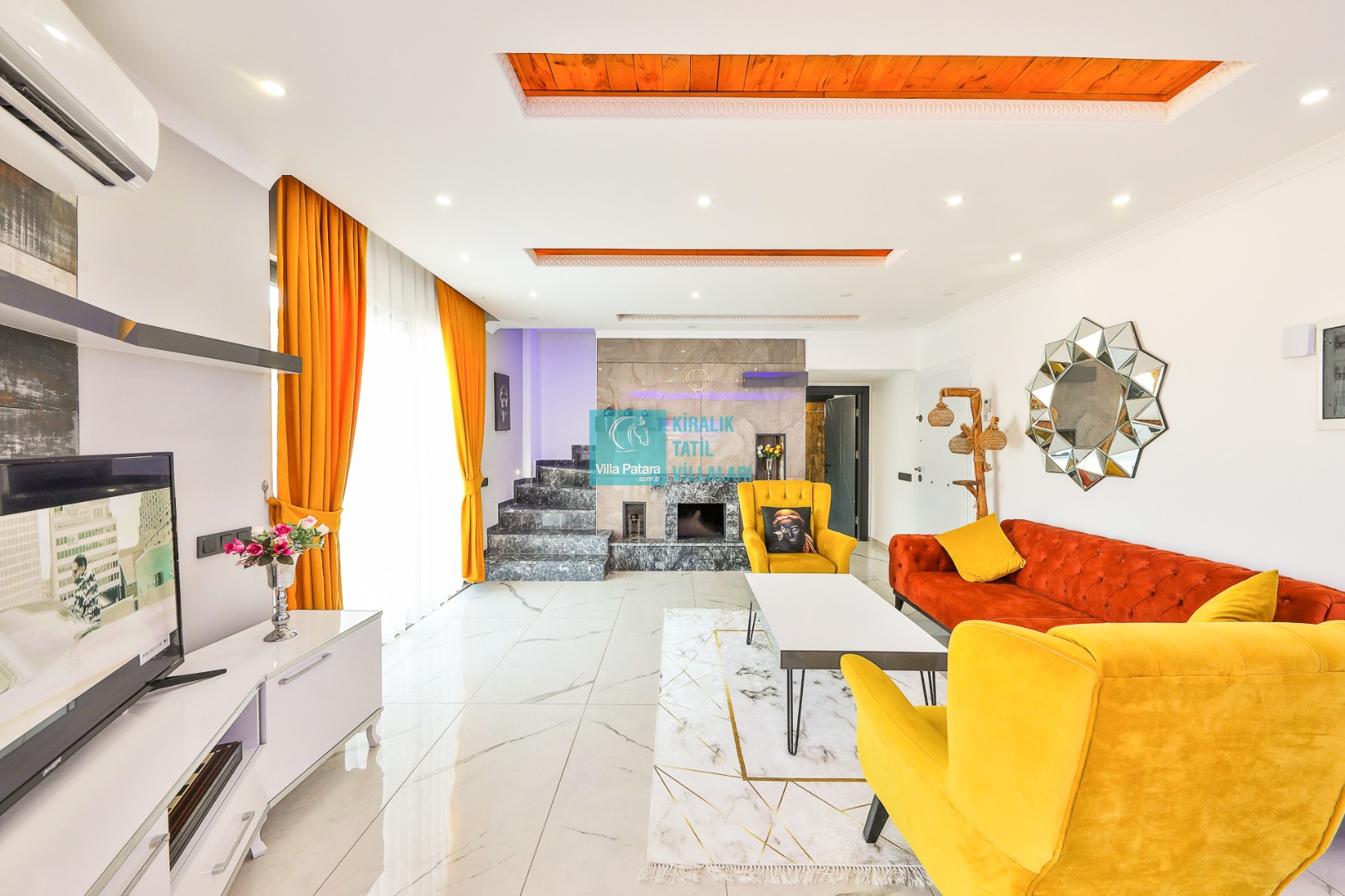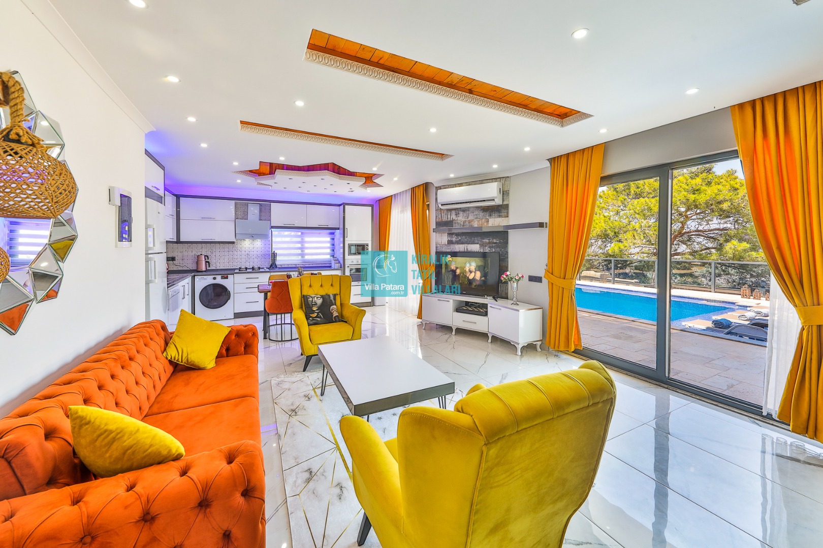 Salon: Villa salonunda konforlu oturma grubu, klima, TV, internet, uydu alıcı, yemek masası, sehpa bulunmaktadır.