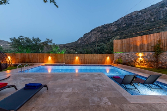 Kalkan Ulugöl Mevkiinde bulunan sessizliğin, huzurun hakim olduğu bir villada tatil isteyen çiftler ve aileler için oldukça uygun bir seçenektir. Muhafazakar villalar ve Doğa Manzaralı Villalar kategorisinde yer alan villamız, 2 yatak odası ile 4 kişilik konaklama kapasitesine sahiptir. Havuzu korunaklı ve bahçesi dışarıdan görünmeyen villamız mahremiyete önem veren çiftlerimiz için huzur dolu bir tatil fırsatı sunuyor. Ayrıca Villamızda 2 kişilik jakuzi konforuda yer almaktadır.