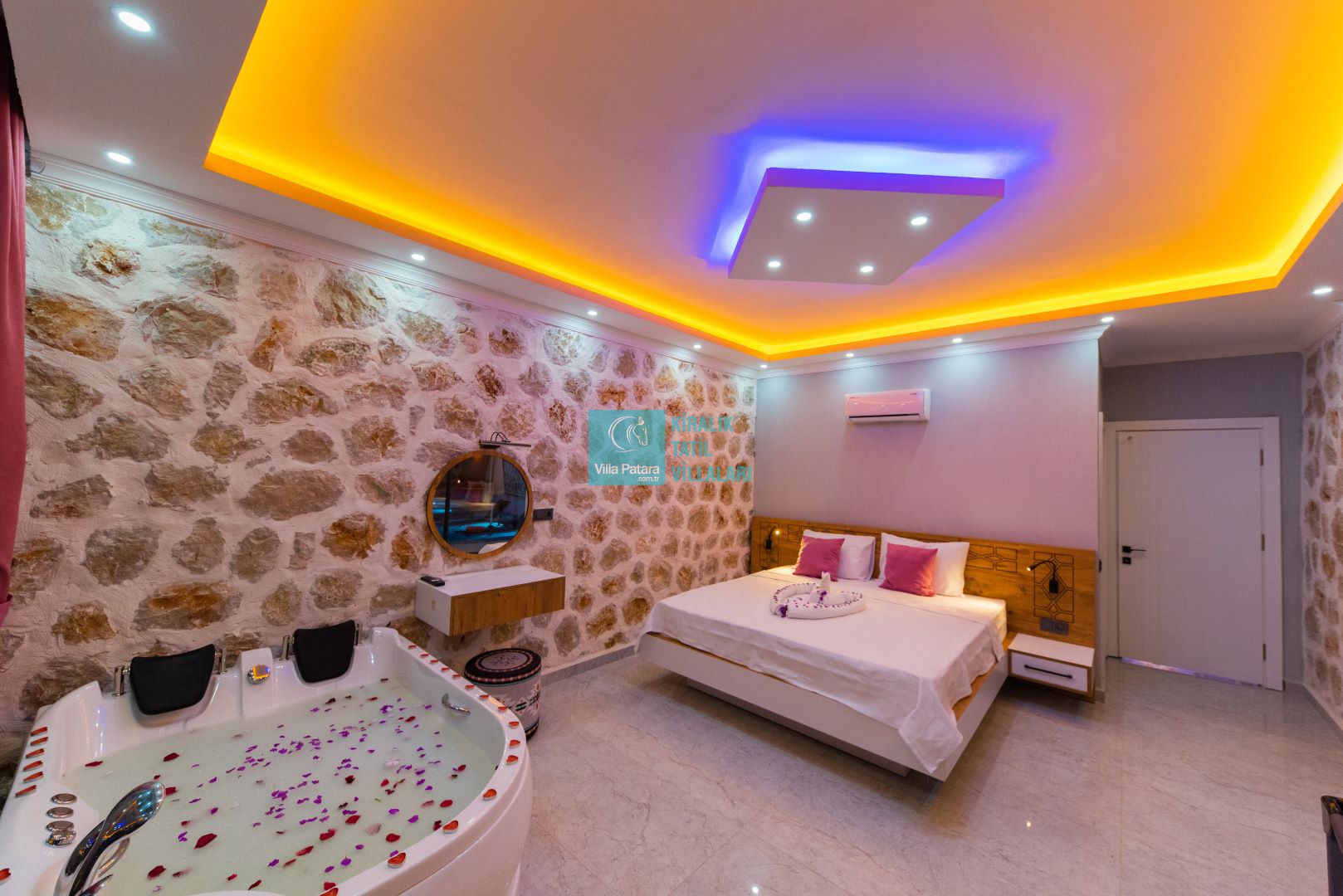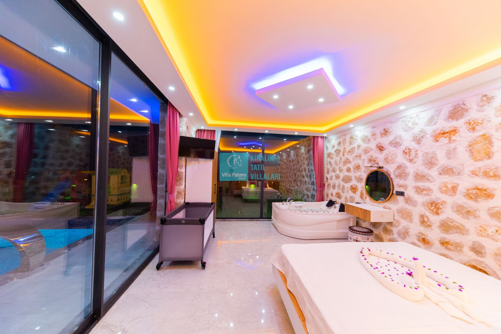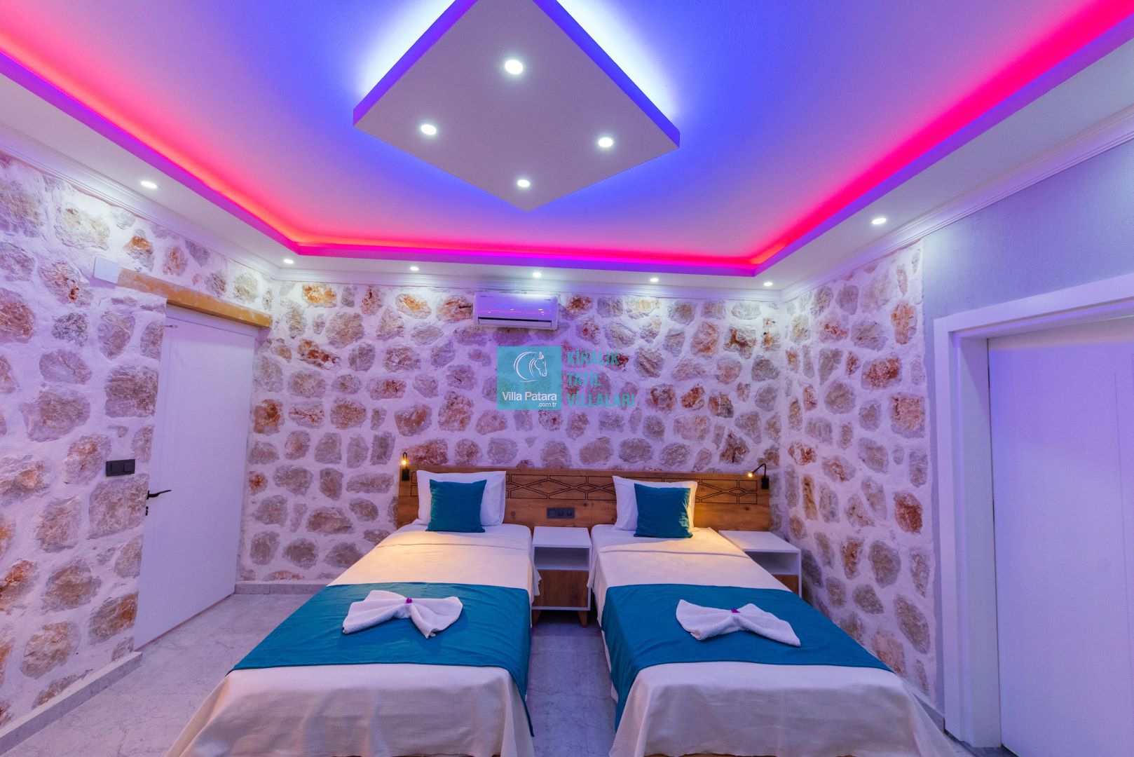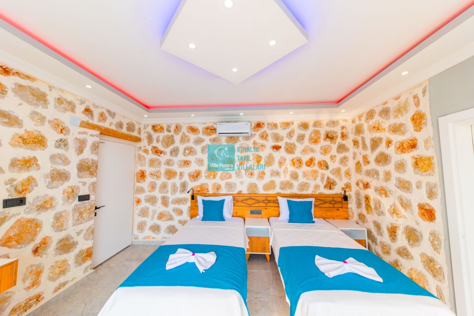 Villamızın iki adet yatak odası ve iki adet banyosu bulunmaktadır. Birinci yatak odası içerisinde bir adet çift kişilik yatak, banyo, jakuzi, klima ve televizyon; ikinci yatak odası içerisinde iki adet tek kişilik yatak, banyo ve klima yer almaktadır. Salon içerisinde mutfak, oturma grubu, televizyon ve klima yer almaktadır.