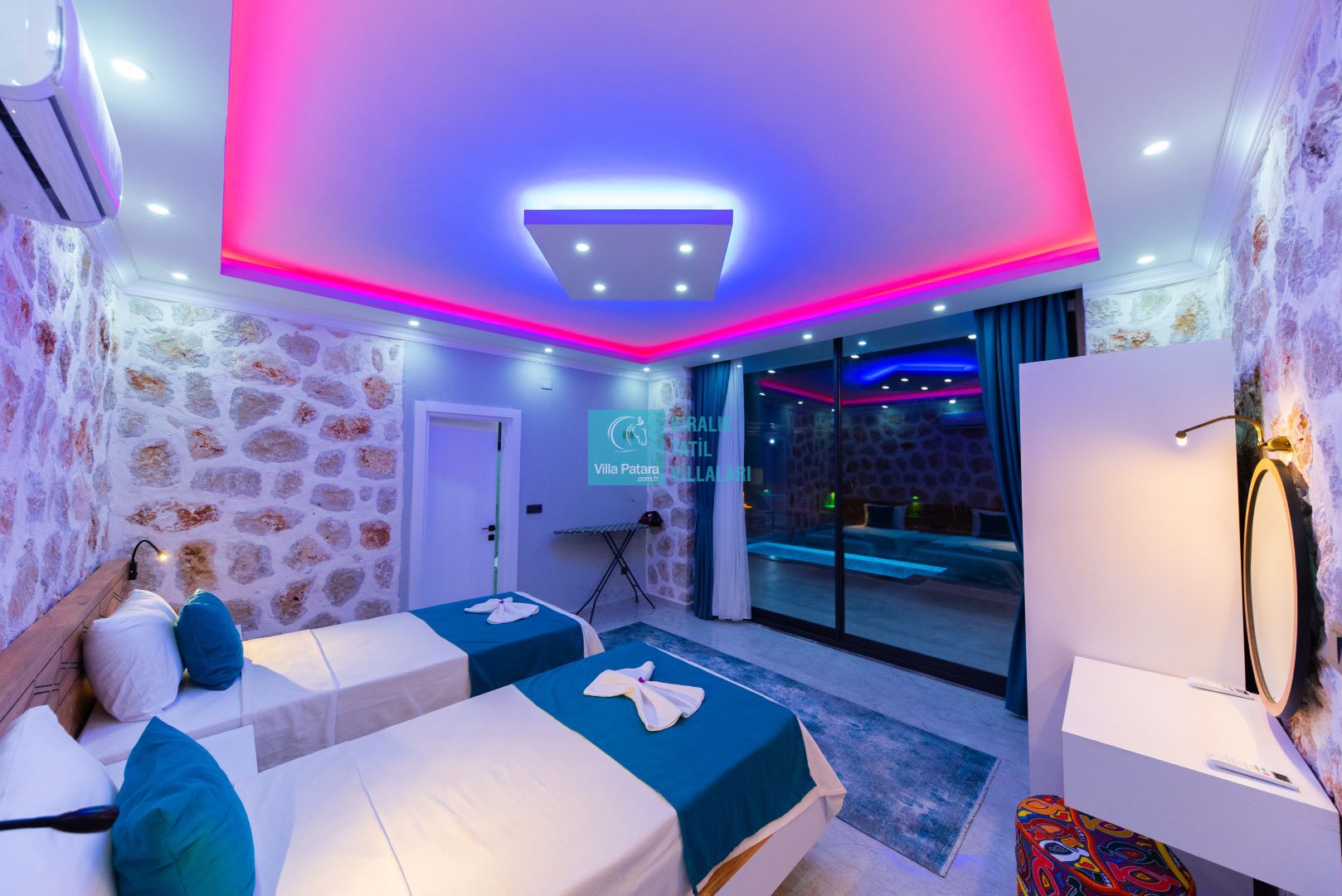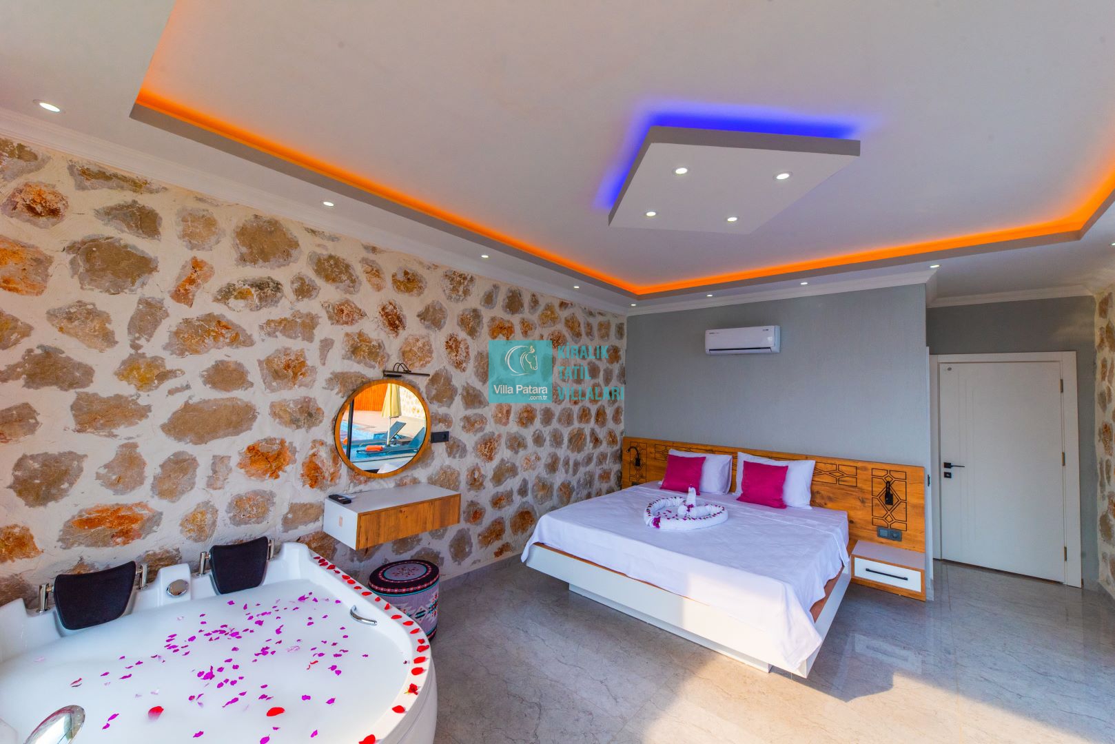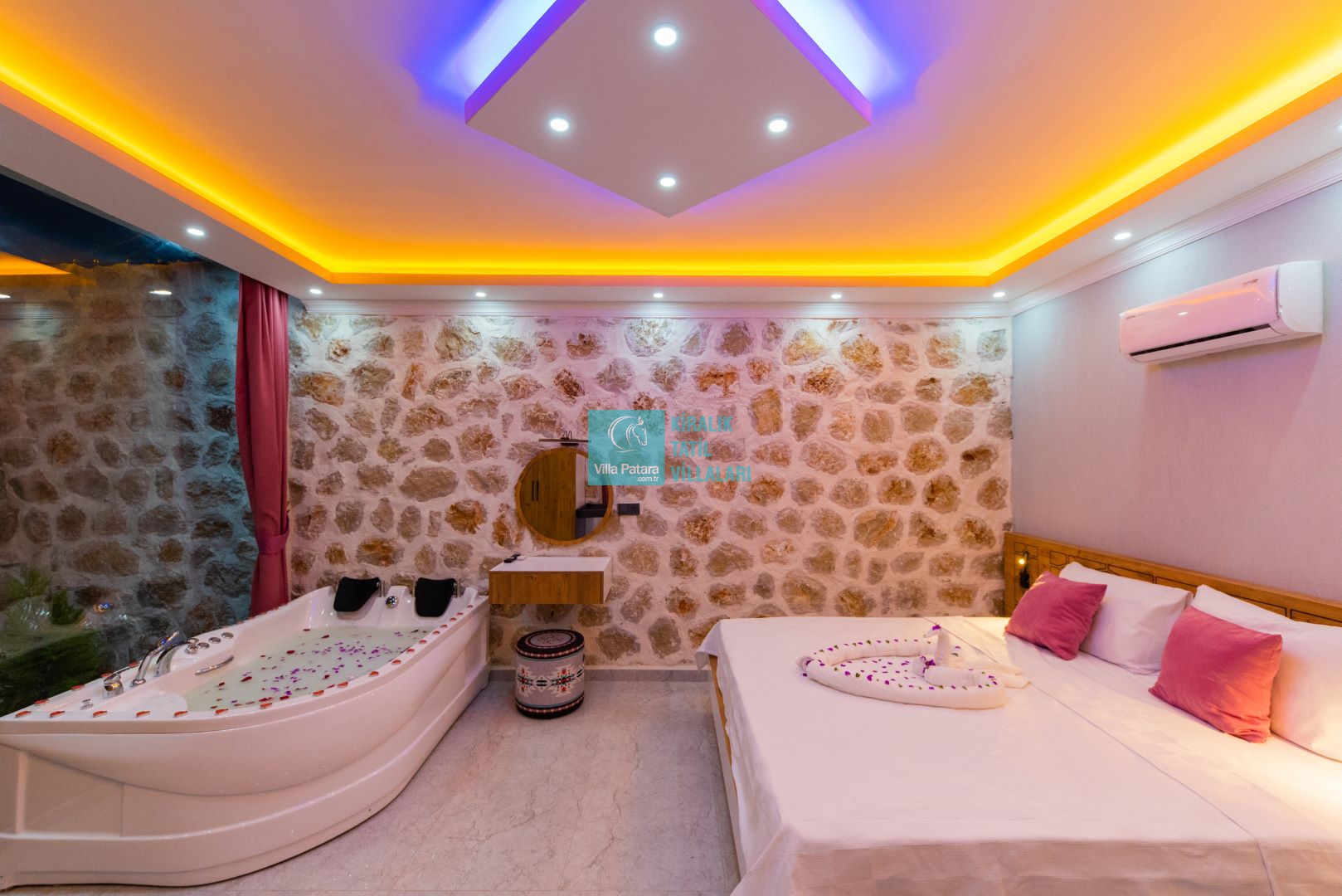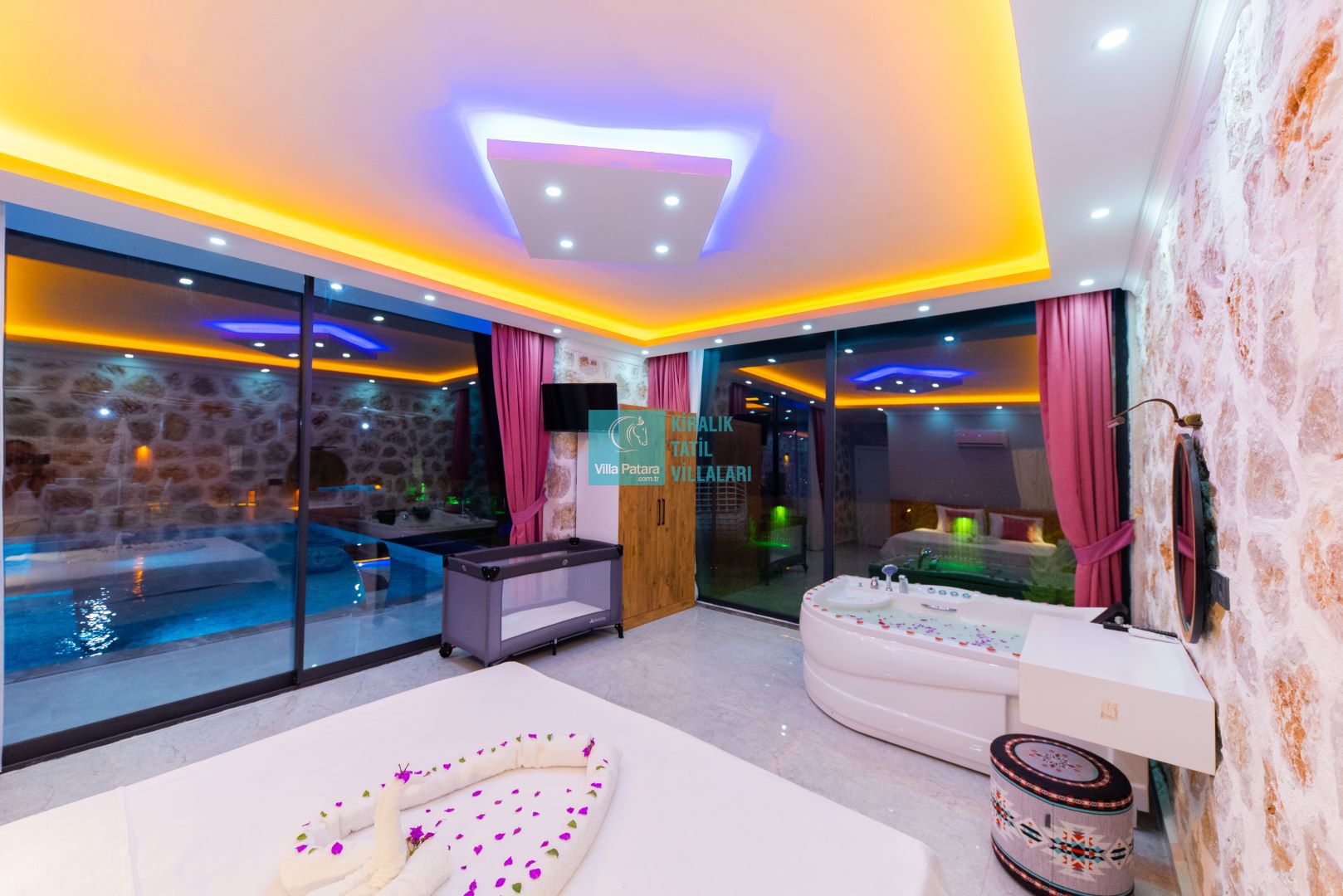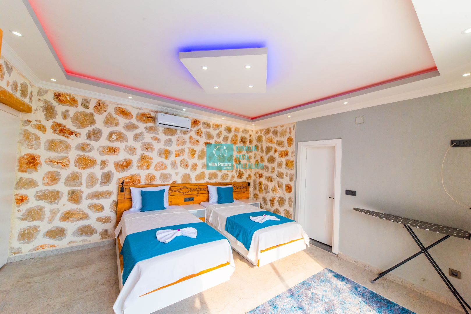 Villamızın iki adet yatak odası ve iki adet banyosu bulunmaktadır. Birinci yatak odası içerisinde bir adet çift kişilik yatak, banyo, jakuzi, klima ve televizyon; ikinci yatak odası içerisinde iki adet tek kişilik yatak, banyo ve klima yer almaktadır. Salon içerisinde mutfak, oturma grubu, televizyon ve klima yer almaktadır.