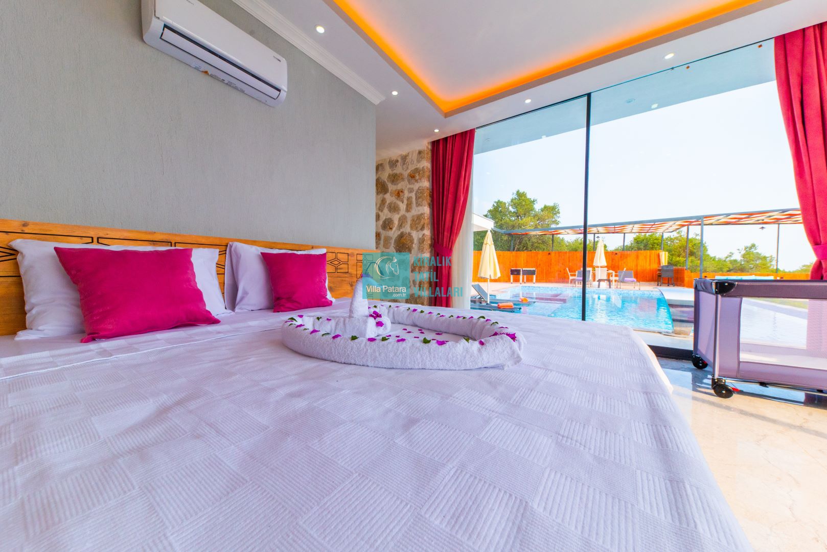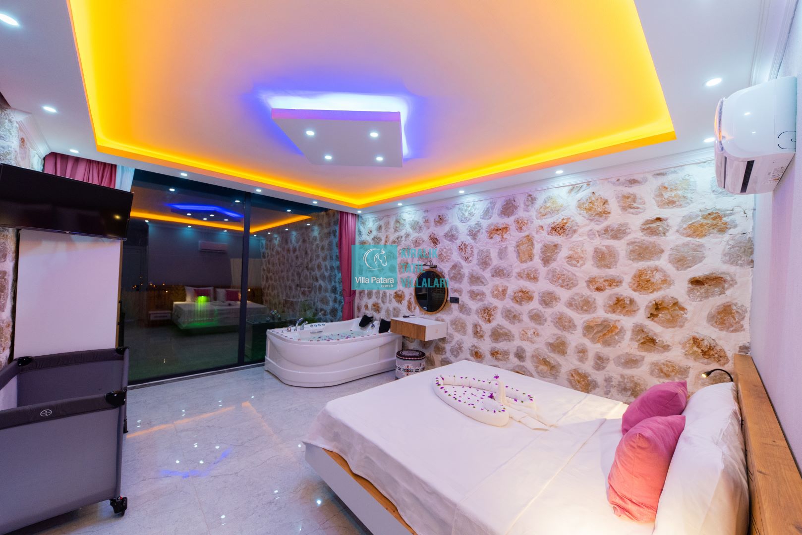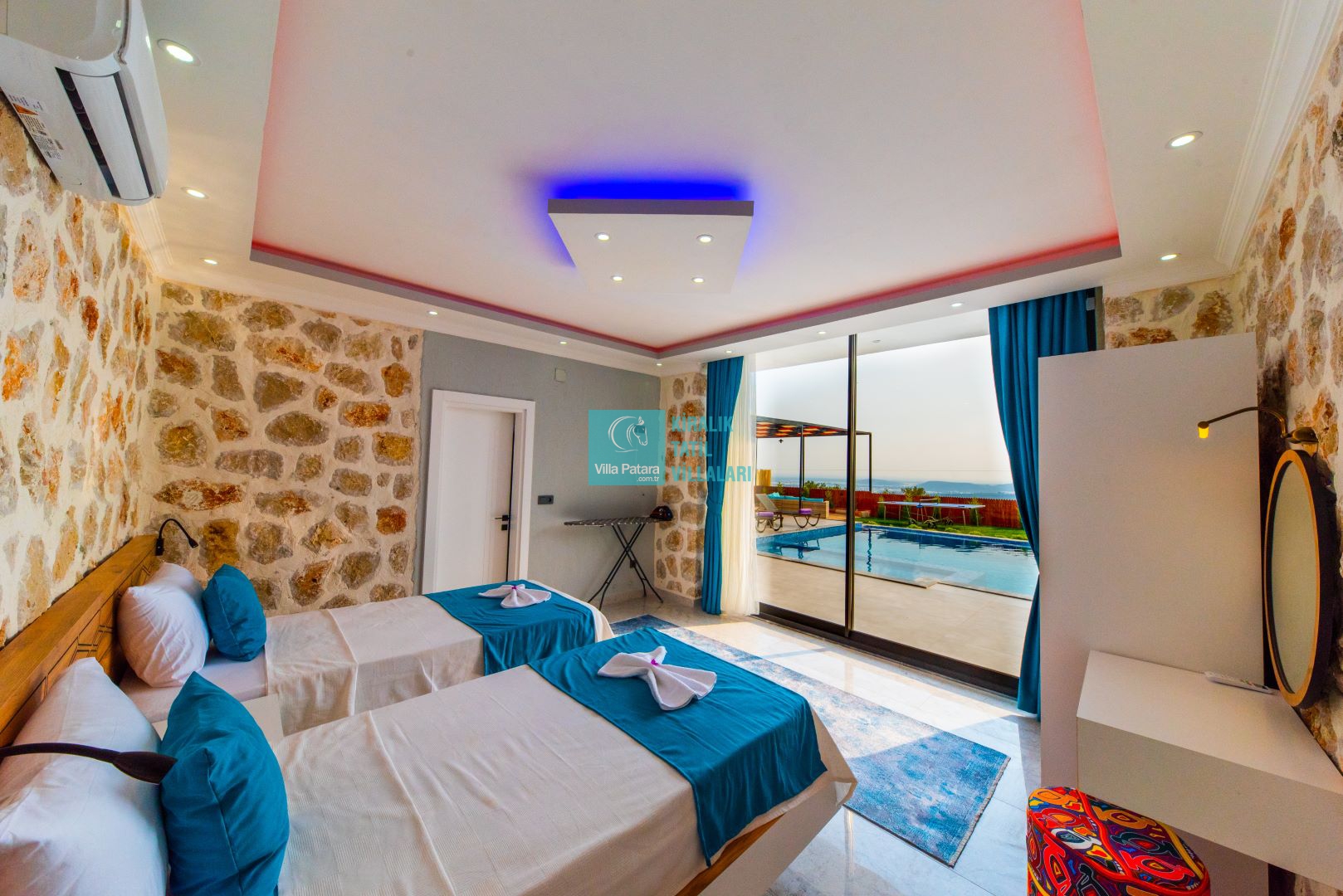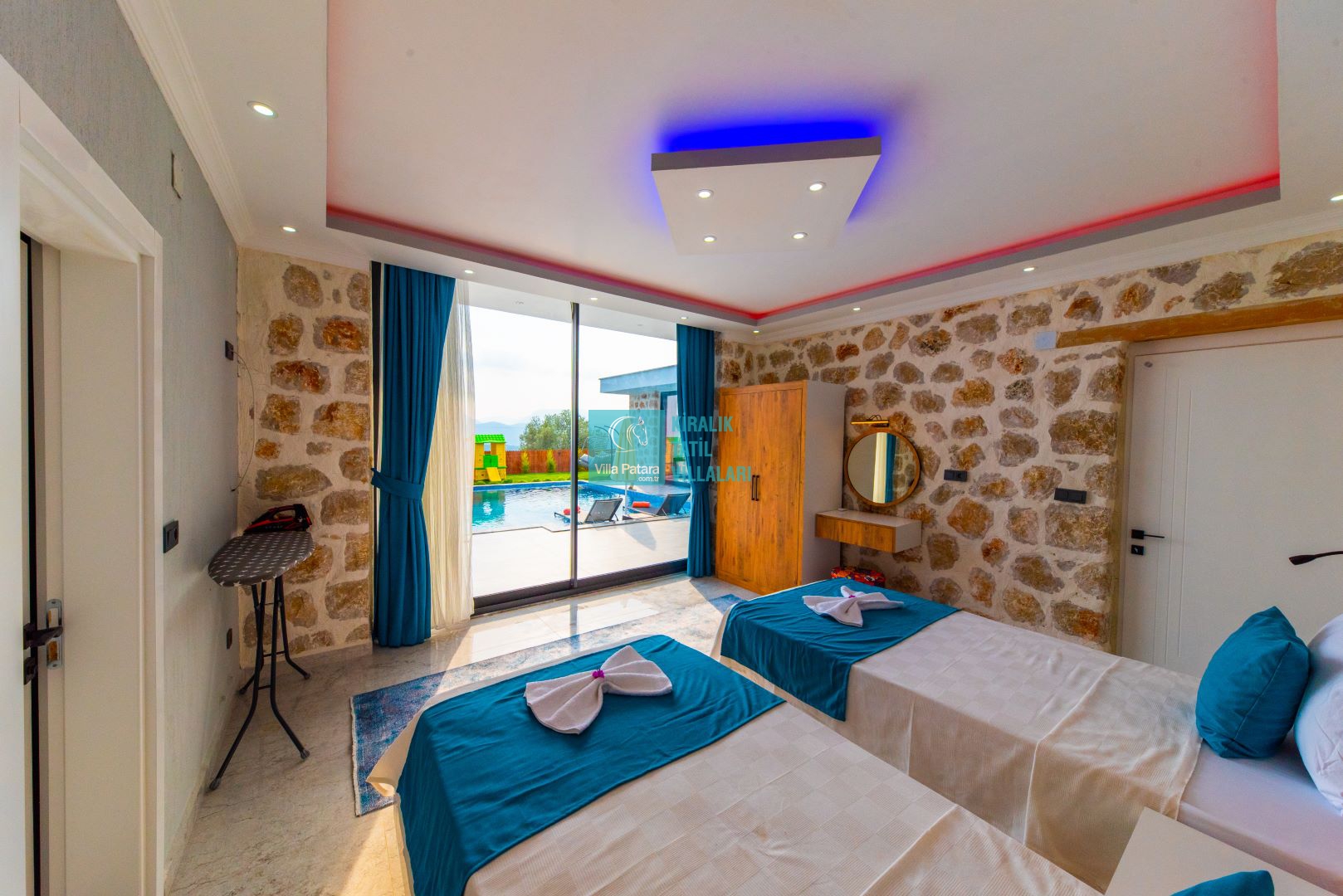 Villamızın iki adet yatak odası ve iki adet banyosu bulunmaktadır. Birinci yatak odası içerisinde bir adet çift kişilik yatak, banyo, jakuzi, klima ve televizyon; ikinci yatak odası içerisinde iki adet tek kişilik yatak, banyo ve klima yer almaktadır. Salon içerisinde mutfak, oturma grubu, televizyon ve klima yer almaktadır.