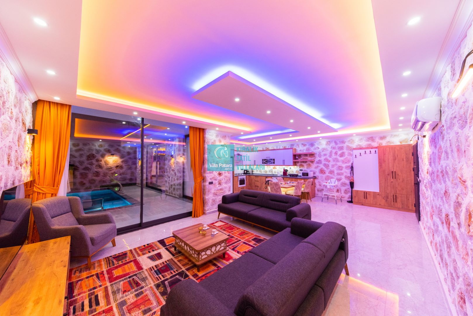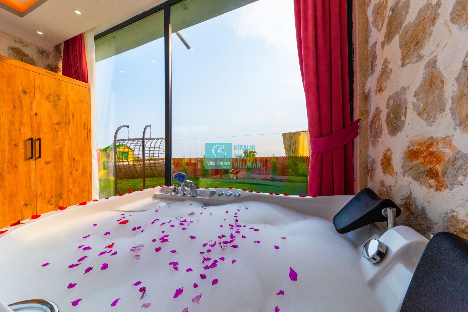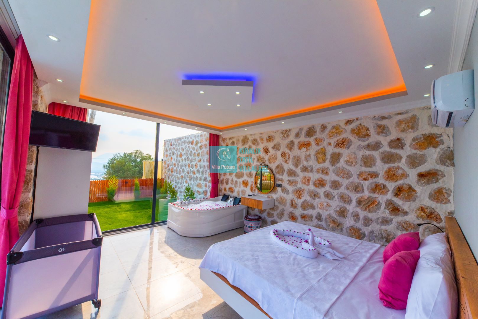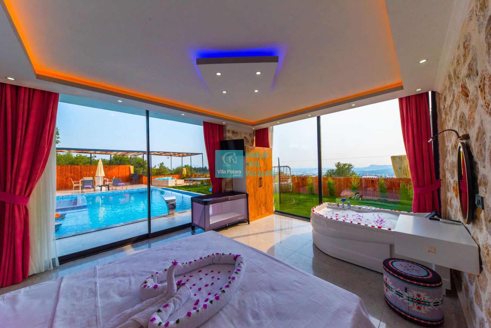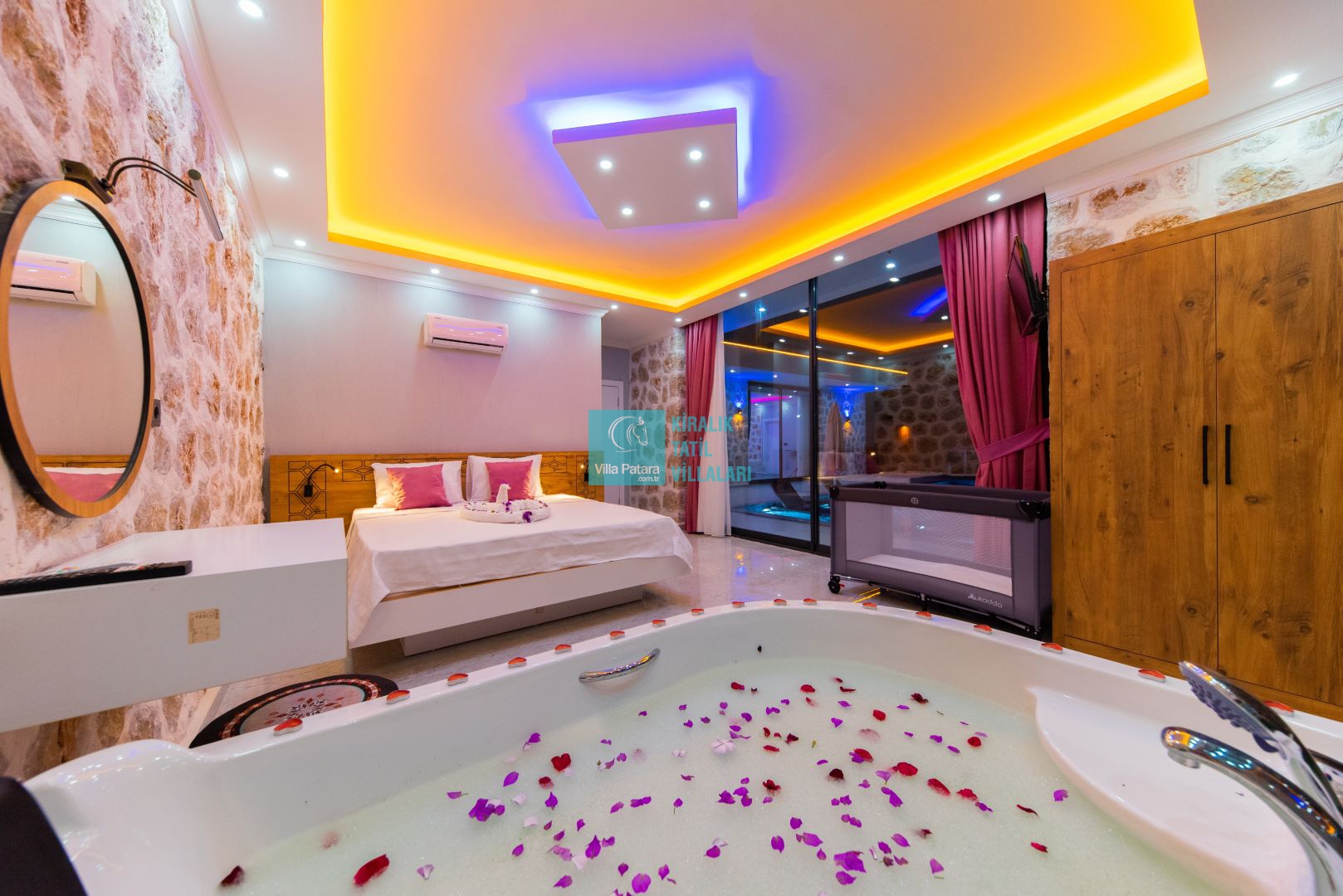 Villamızın iki adet yatak odası ve iki adet banyosu bulunmaktadır. Birinci yatak odası içerisinde bir adet çift kişilik yatak, banyo, jakuzi, klima ve televizyon; ikinci yatak odası içerisinde iki adet tek kişilik yatak, banyo ve klima yer almaktadır. Salon içerisinde mutfak, oturma grubu, televizyon ve klima yer almaktadır.
