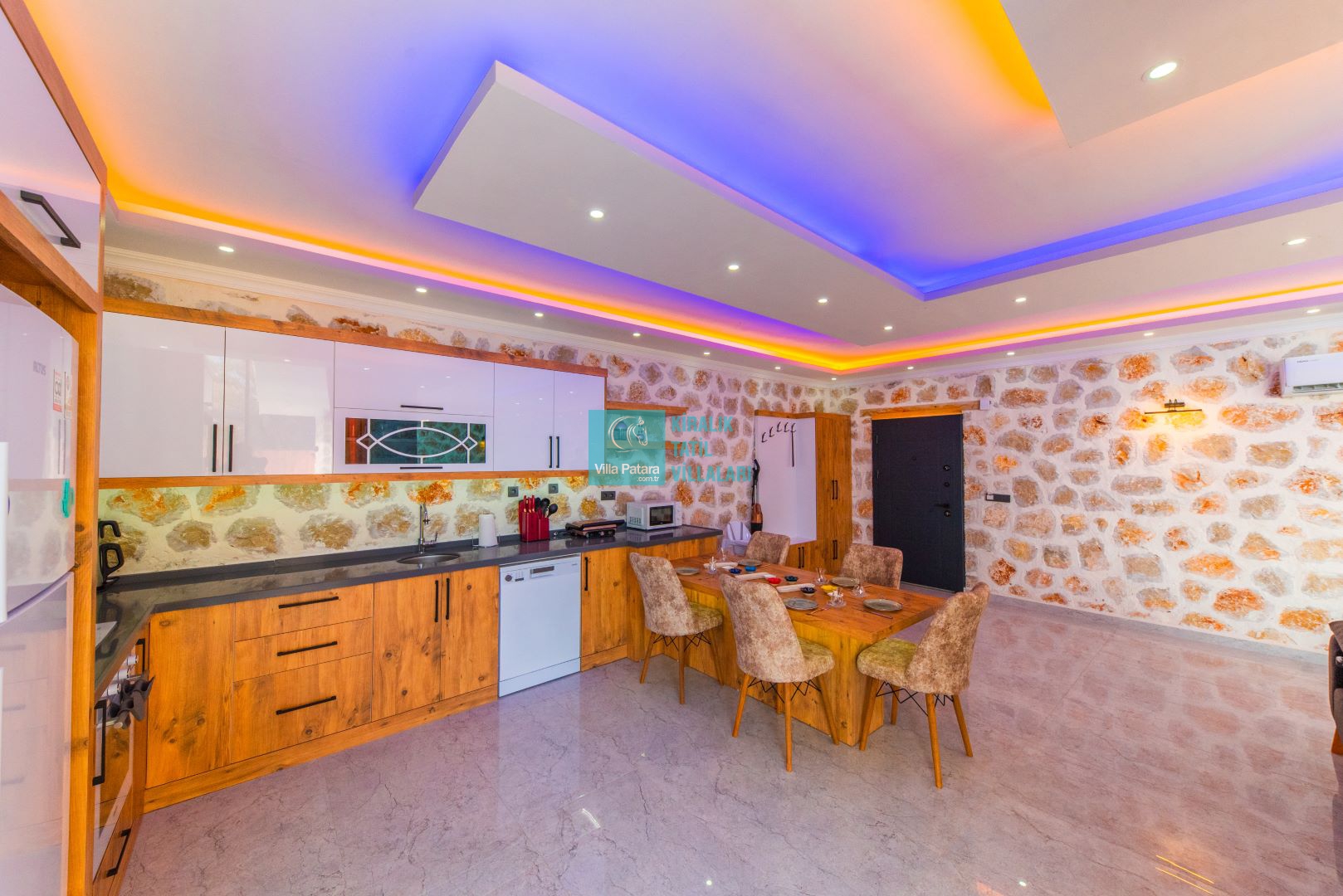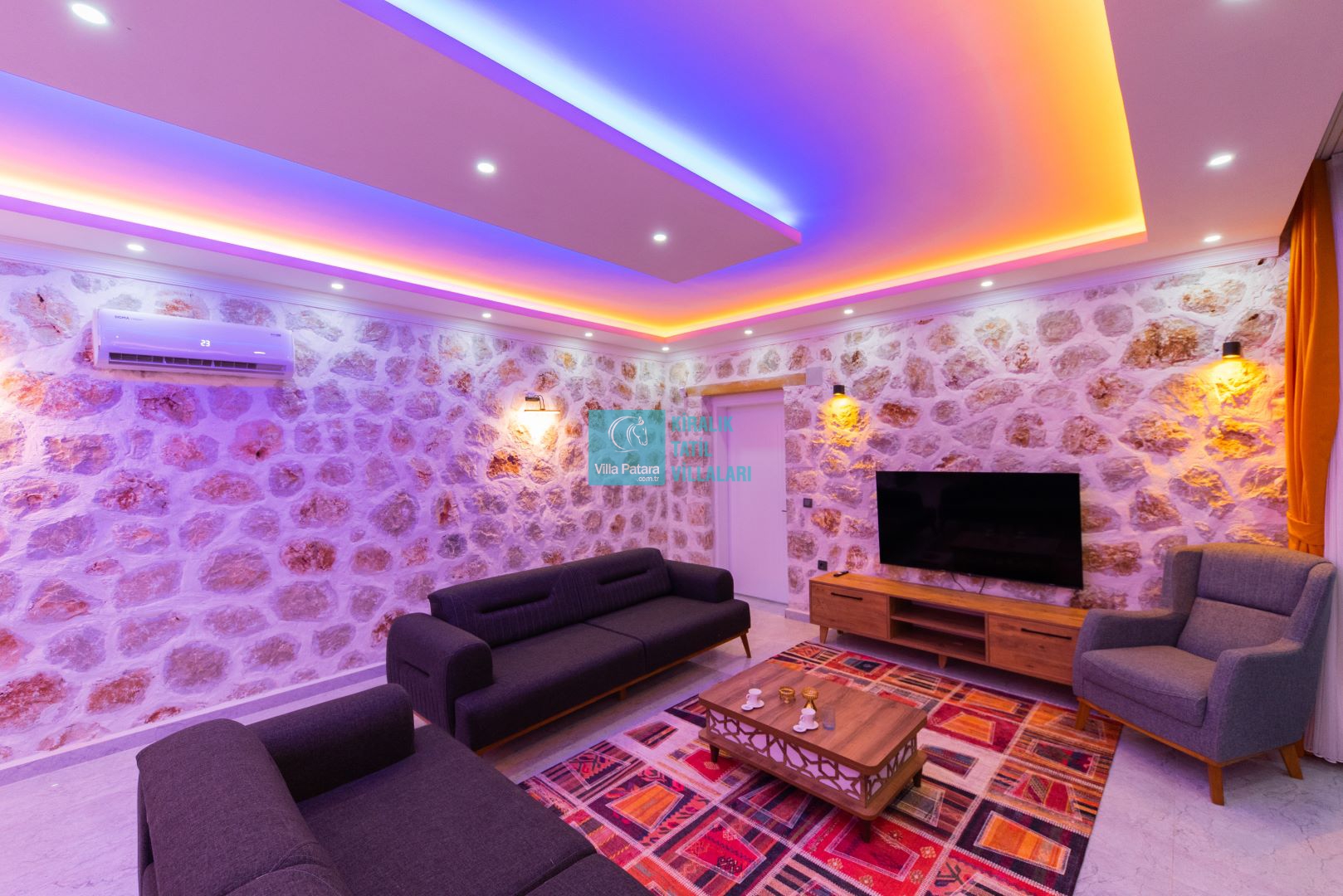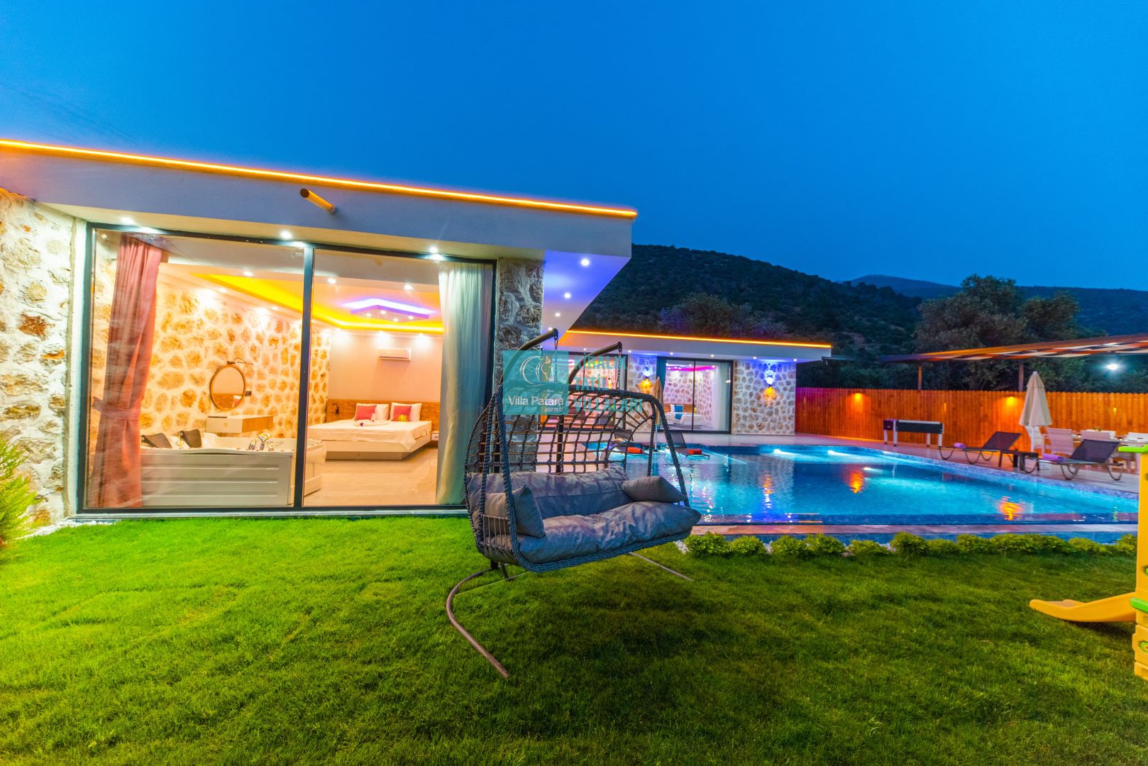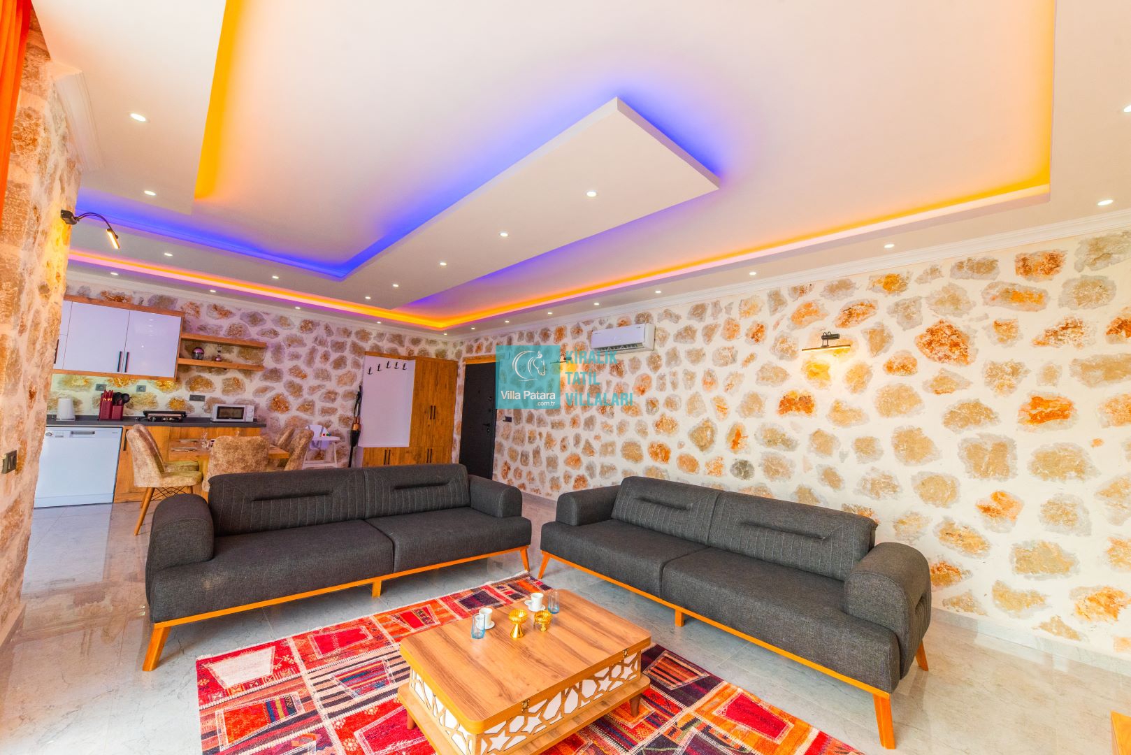 Villamızın iki adet yatak odası ve iki adet banyosu bulunmaktadır. Birinci yatak odası içerisinde bir adet çift kişilik yatak, banyo, jakuzi, klima ve televizyon; ikinci yatak odası içerisinde iki adet tek kişilik yatak, banyo ve klima yer almaktadır. Salon içerisinde mutfak, oturma grubu, televizyon ve klima yer almaktadır.