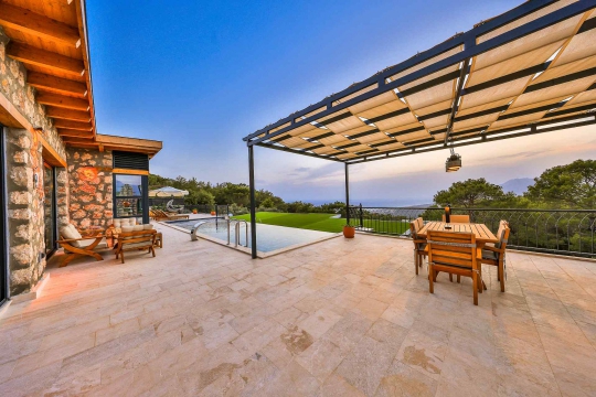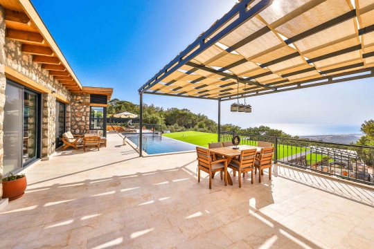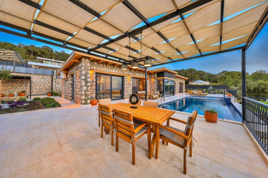 HAVUZ TERASI: Geniş havuz terası ve özel yüzme havuzunun bulunduğu bahçede; muhteşem Patara manzarasına karşı jakuzi, şezlonglar, güneş şemsiyesi,6 kişilik yemek masası, mangal yeri ve salıncak bulunmaktadır.