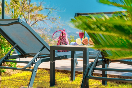 Şezlong, şemsiye, mangal, masa ve sandalyeler bulunmaktadır.