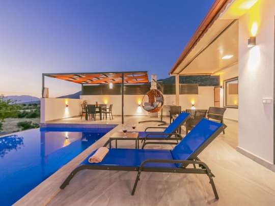 Villa Derin, Kalkan Üzümlü köyünde konumlanmakta olan, yeşilliklerin arasında doğa manzaralı kiralık bir villadır. Modern ve konforlu bir şekilde dizayn edilen yazlık villamızda 1 adet yatak odası bulunmakta olup, 2 kişiye konaklama imkanı sağlamaktadır. Yatak odasının içerisinde tüm yorgunluğunuzu atabileceğiniz jakuzi yer almaktadır. Özellikle balayı çiftlerimize hitap eden yazlık villamızın havuz ve havuz terası korunaklı hale getirilmiştir. Kiralık villamız dışarıdan gözükmemektedir. Ayrıca villamızda bebek yatağı ve mama sandalyeside mevcuttur. Muhafazakar çiftlerimiz de gönül rahatlığı ile tercih edebilirler. Sessizlik ve sakinlik içerisinde huzur dolu bir balayı tatili için Villa Derin' i tercih edebilirsiniz.