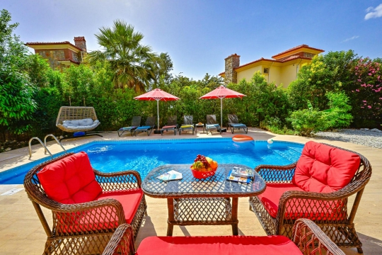 Villamız Fethiye- Ovacık mevkiinde yer almaktadır. Yeni yapılan Babadağ teleferik hattına, Ölüdeniz plajı ve turistik alanlara oldukça yakındır. Şehrin gürültüsünden uzak doğa içinde, sakin ve dingin bir tatil imkanı sunmaktadır. 5 yatak odası, 3 banyo-tuvaleti bulunan villamız 10 kişilik konaklama imkanı sunmaktadır. Salonda şömine, verandasında 6 kişilik yemek masası ve geniş bir bahçesi bulunmaktadır. Bahçesinde 70m2 dikdörtgen özel havuz, oturma takımı, 8 adet şezlong ve 4 adet şemsiye bulunan villamız geniş ailelerimizin konforlu ve bütçe dostu bir tatil geçirmeleri için tasarlandı.