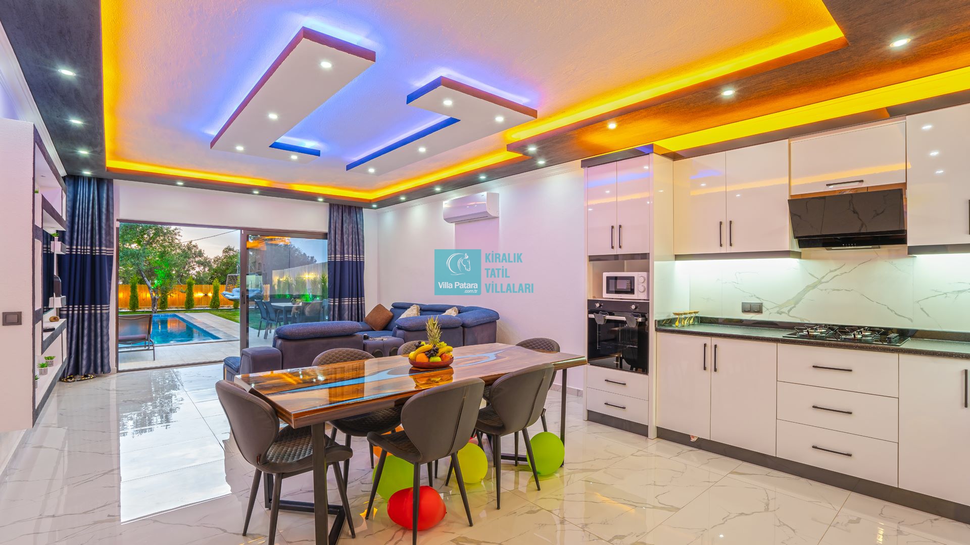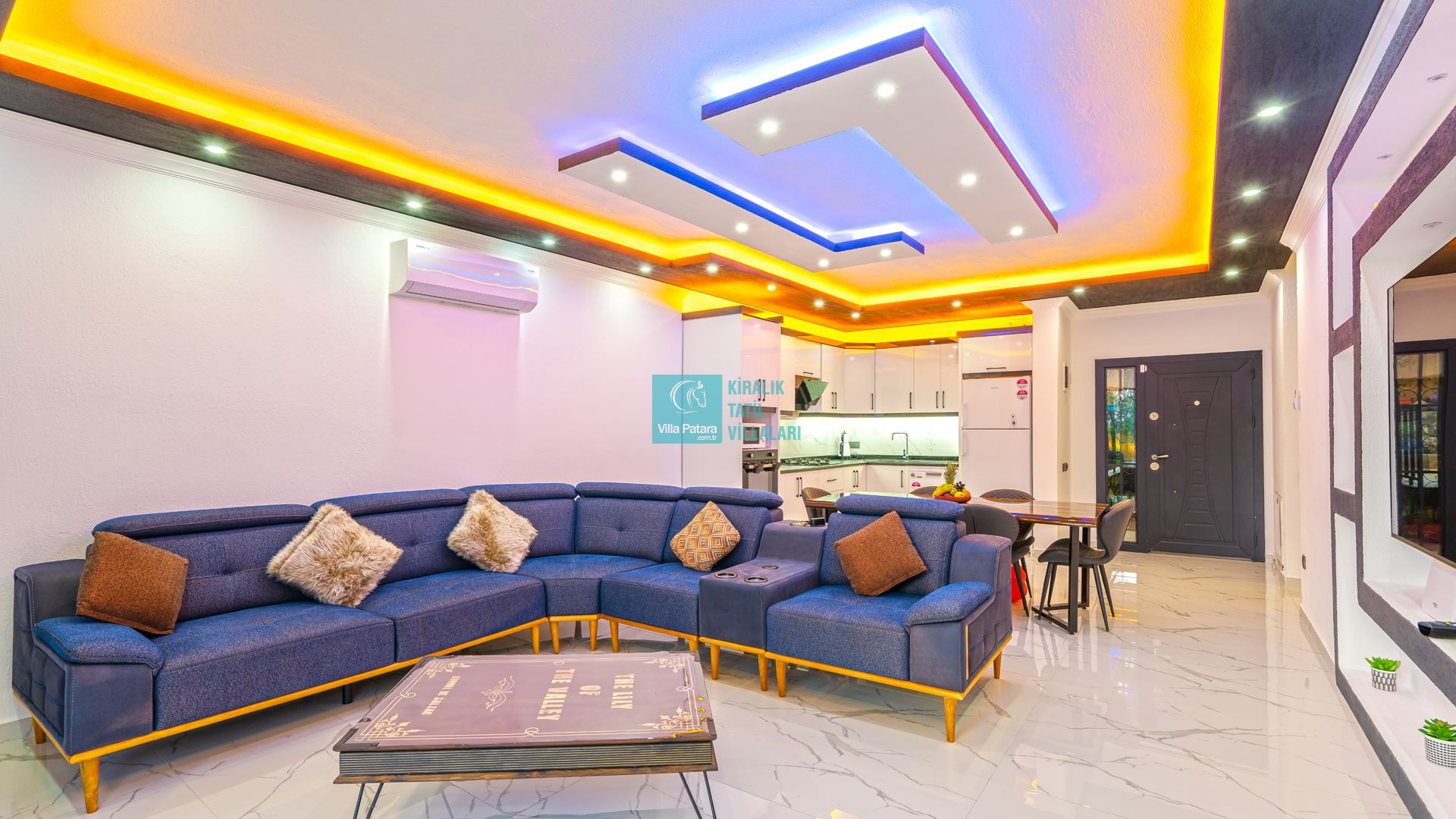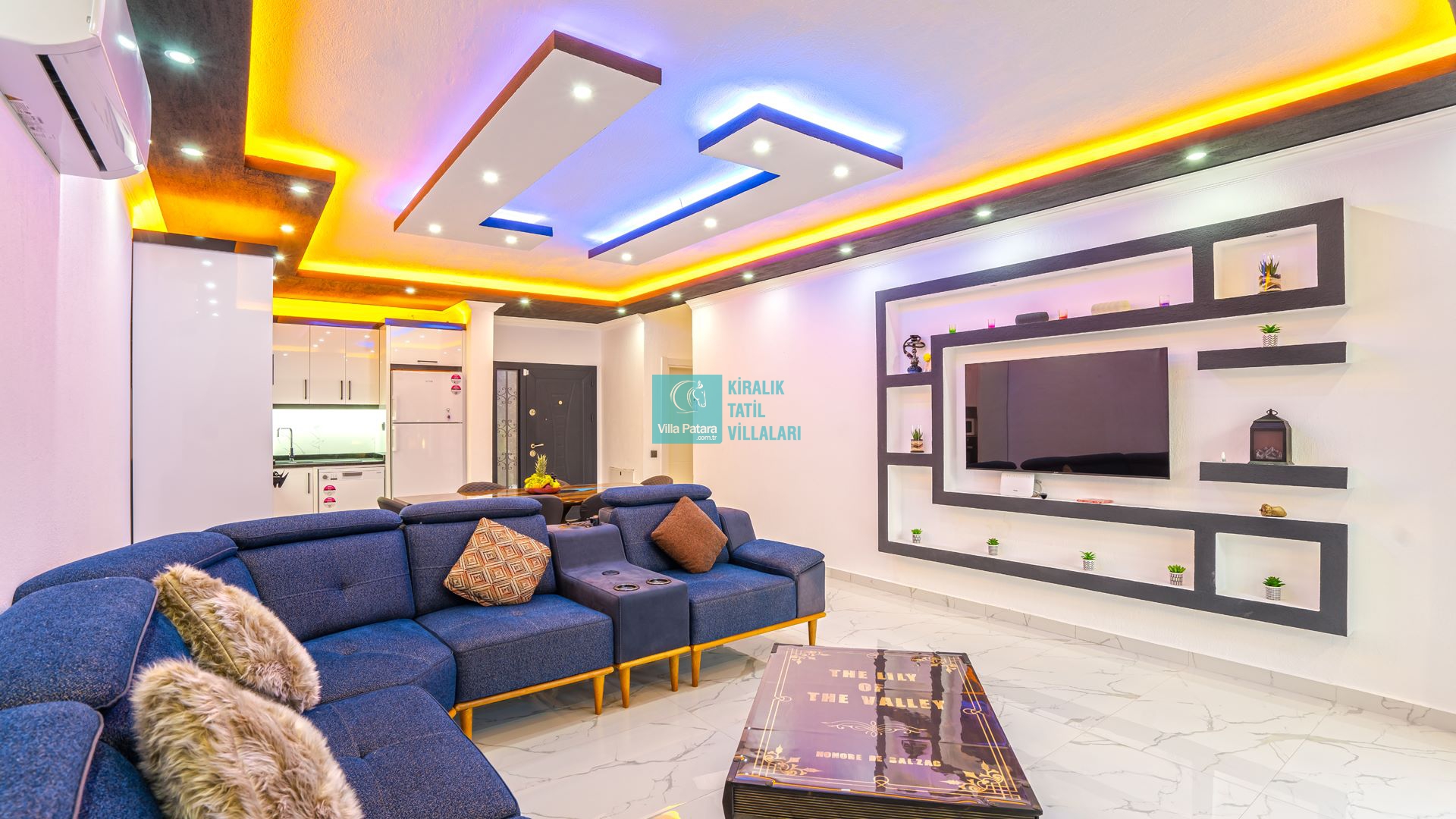 Salon Detayları: LCD TV, modern oturma grubu, yemek masası ve sandalyeler, kablosuz modem bulunmaktadır.