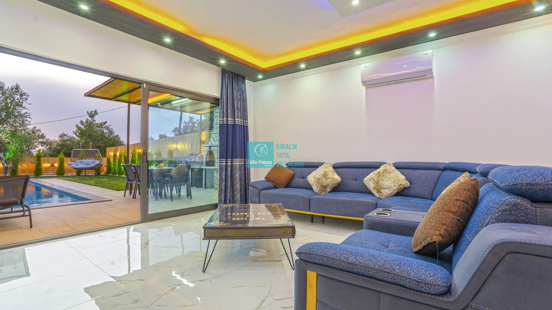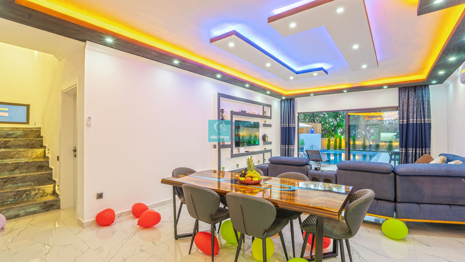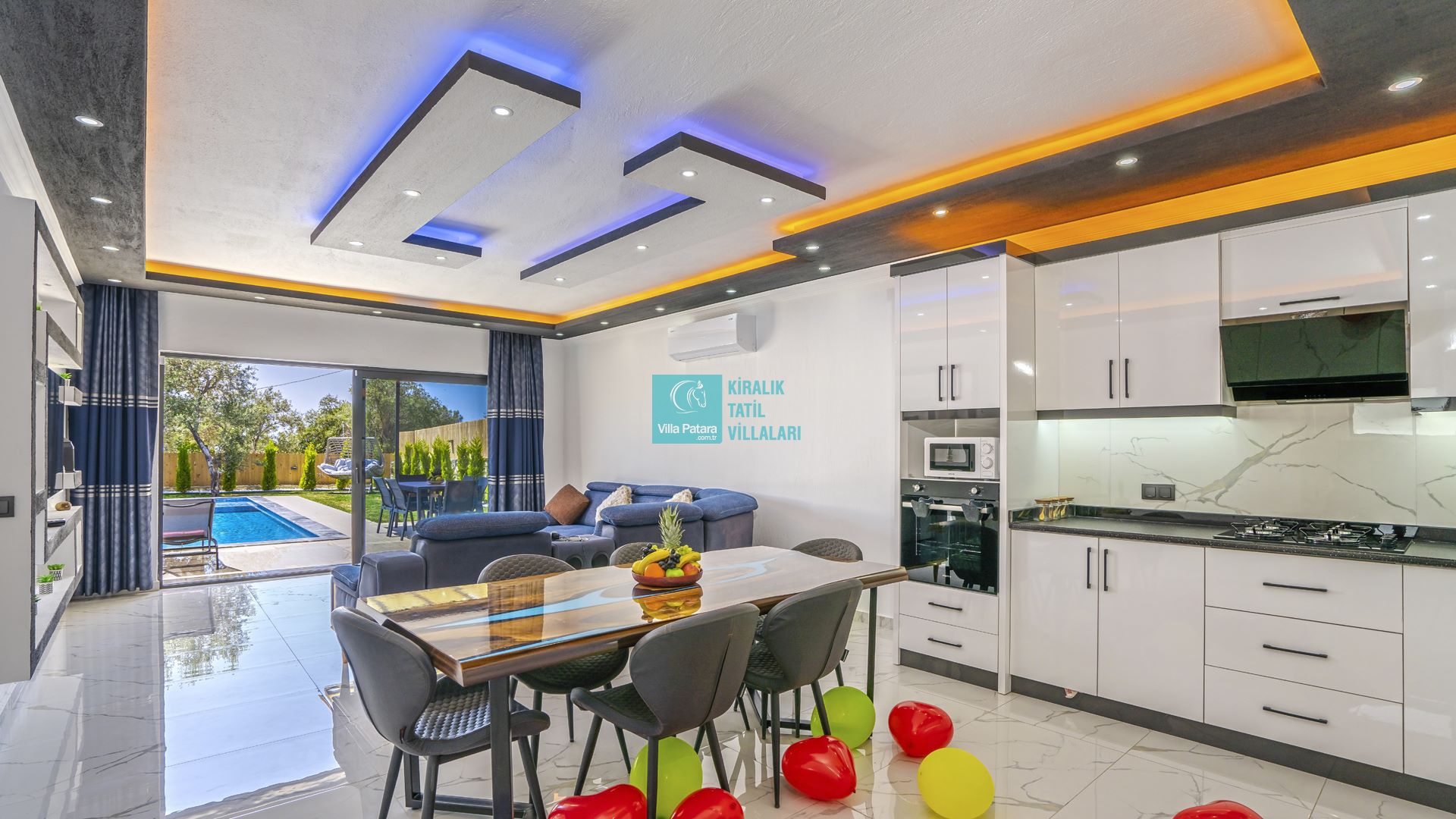 Salon Detayları: LCD TV, modern oturma grubu, yemek masası ve sandalyeler, kablosuz modem bulunmaktadır.