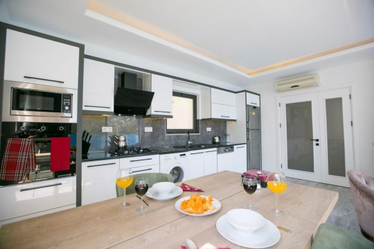 Mutfak : Ferah ve şık dizayn edilmiş Amerikan Mutfak , Buzdolabı , Bulaşık Makinesi , Çamaşır Makinesi , Fırın , Ocak , Mikrodalga Fırın , Elektrikli Su Isıtıcısı , Tava Tencere vb. Mutfak Ekipmanları