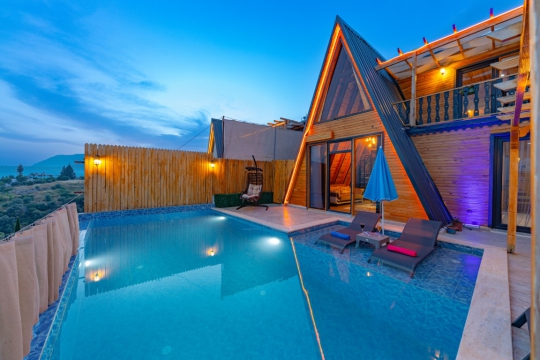Kaş Kalkan Kınık Mahallesi'nde konumlu Villa Nargisus, 2 yatak odalı ve 4 kişiye kadar konaklama kapasiteli, bungalov tarzı tatil villasıdır.
