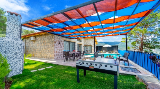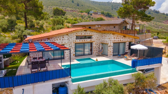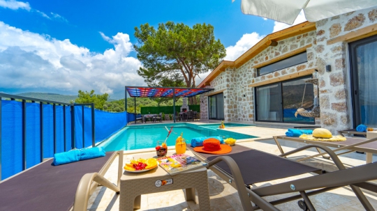 Kalkan Yeşilköy bölgesinde bulunan villamız konumu itibari ile doğa içinde olup sizlere doğa ile baş başa tatil imkanı sunmaktadır. 2 yatak odalı 4 kişilik kapasiteye sahiptir. Taş ve ahşap işçiliği kullanılmıştır. Muhafazakar aileler uygun özel yüzme havuzu ve havuz terası korunaklıdır. Balayı çiftlerine özel olarak süit yatak odasında jakuzi bulunmaktadır.