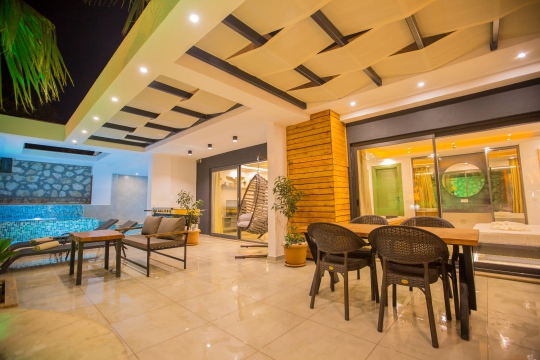 Villada bir adet yatak odası bulunmakta olup, bu odada konforunuz için çift kişilik kral yatak, jakuzi, sauna ve ebeveyn banyosu mevcuttur. Yatak odasından direkt olarak havuz terasına erişim sağlayabilirsiniz. Salon alanı modern bir şekilde dizayn edilmiş olup, açık Amerikan mutfak, yemek masası ve oturma grubu bulunmaktadır. Salondan hem dış havuz terasına hem de içeriden havuza erişim mümkündür.