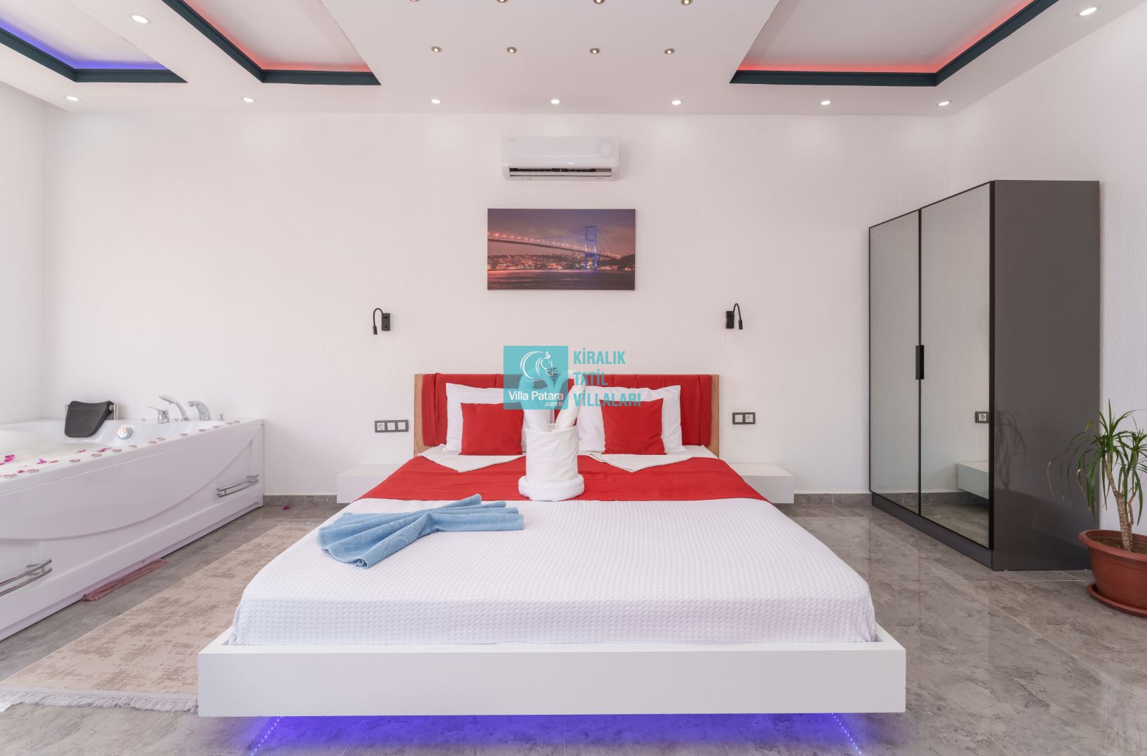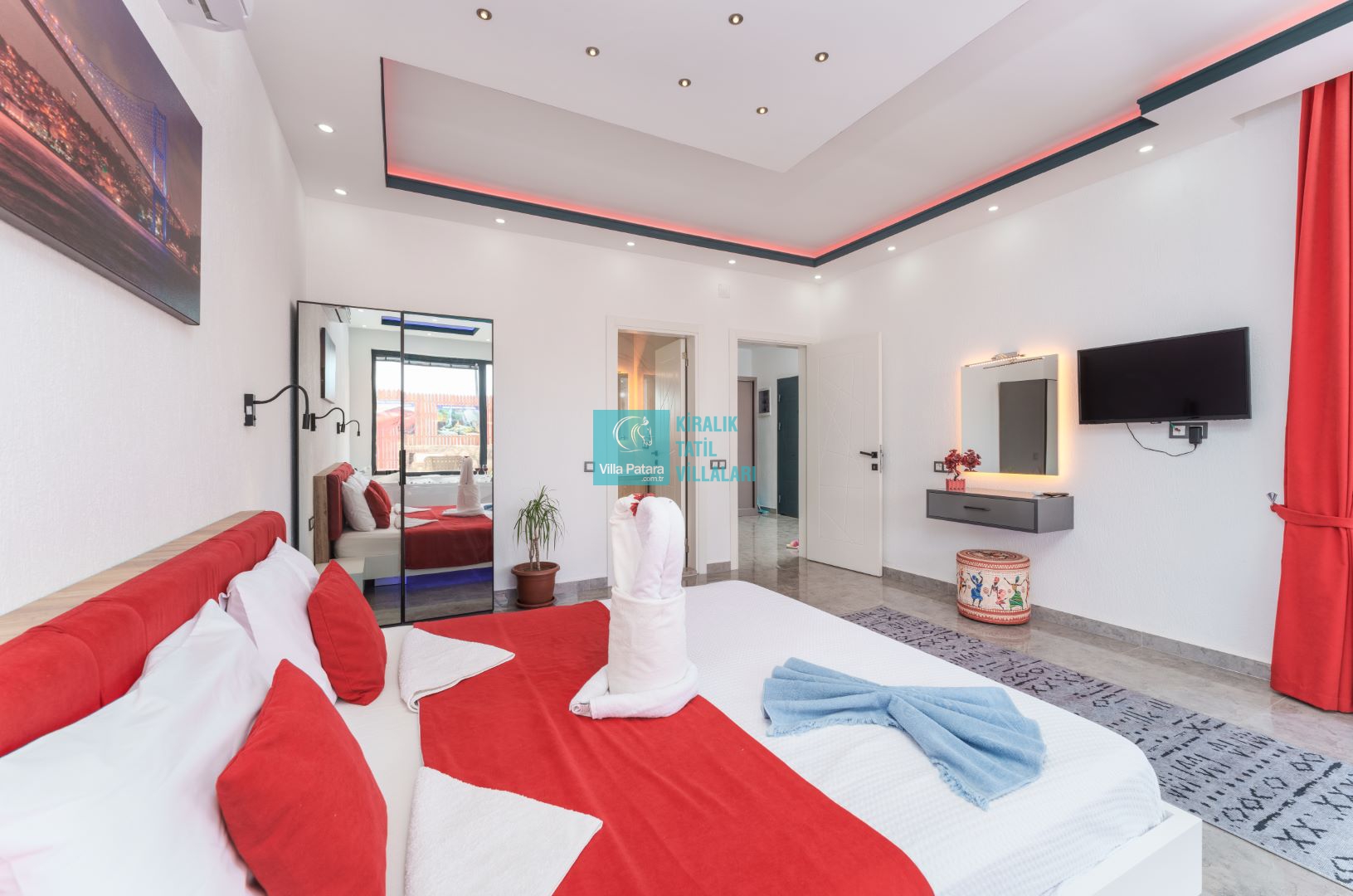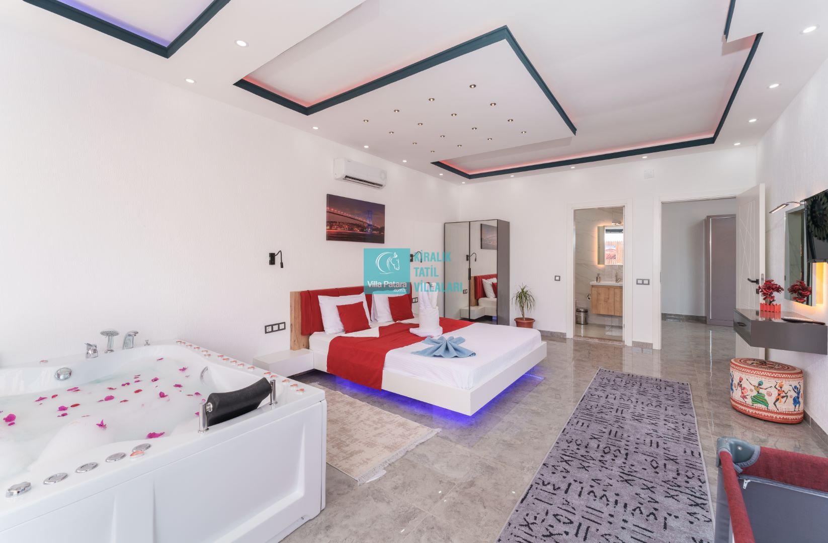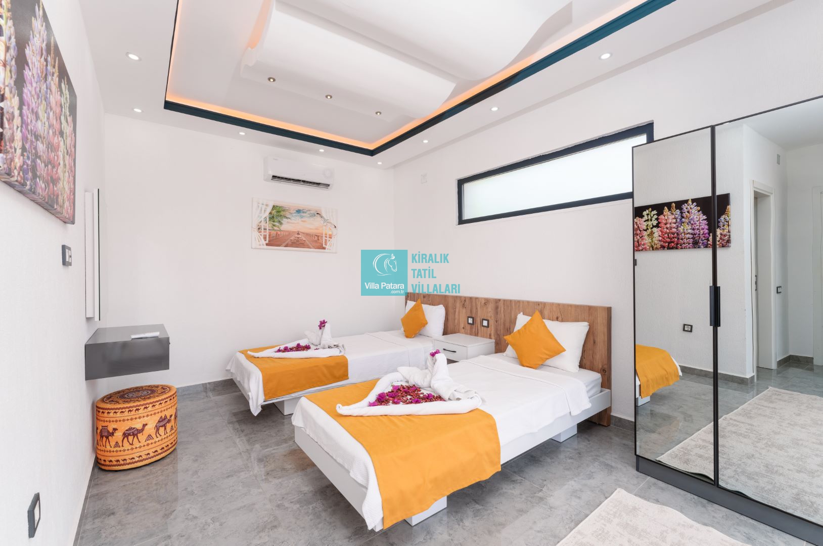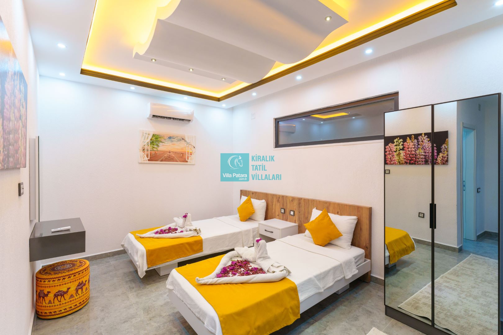Villamız iki yatak odalıdır. Birinci yatak odasında çift kişilik yatak, banyo, jakuzi, klima ve televizyon; İkinci yatak odası içerisinde iki tek kişilik yatak, banyo ve klima bulunmaktadır. Salon içerisinde mutfak, oturma grubu, tuvalet, klima ve televizyon yer almaktadır.