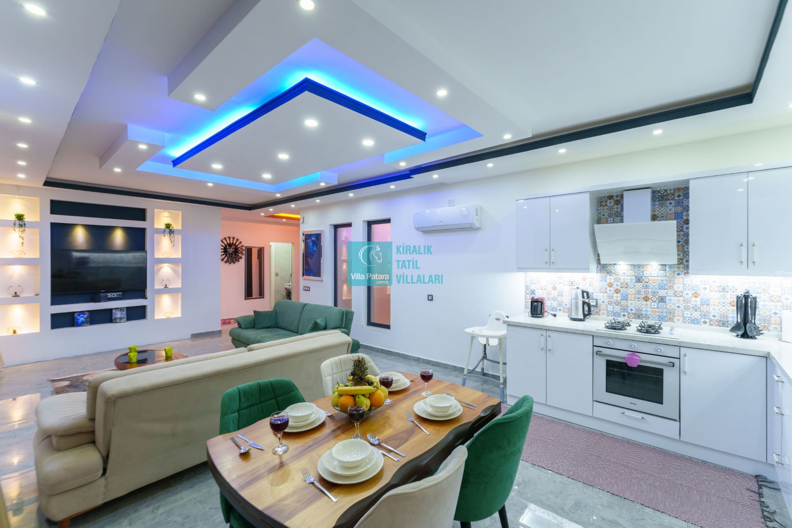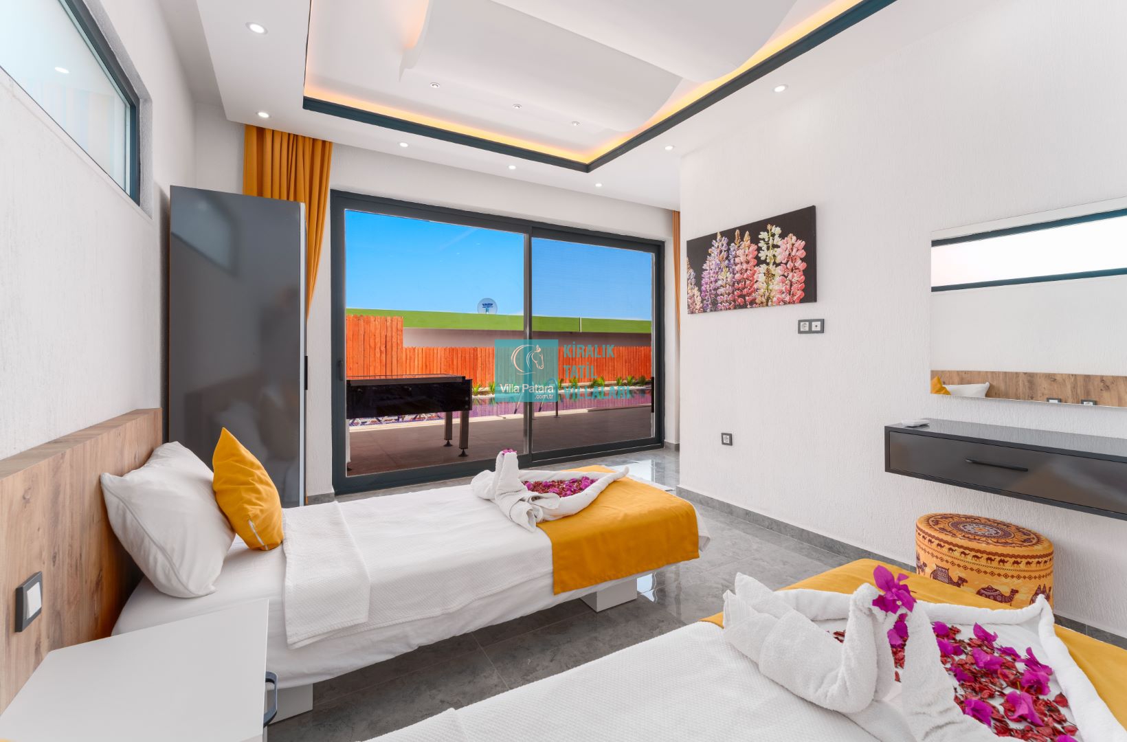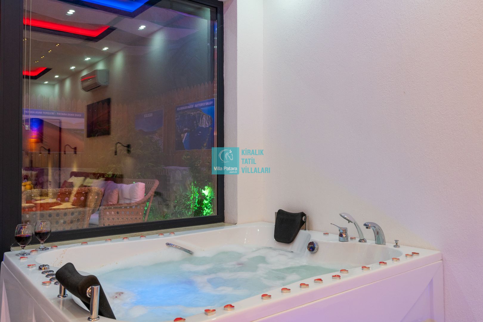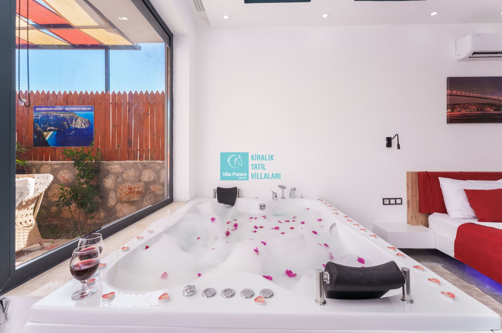 Villamız iki yatak odalıdır. Birinci yatak odasında çift kişilik yatak, banyo, jakuzi, klima ve televizyon; İkinci yatak odası içerisinde iki tek kişilik yatak, banyo ve klima bulunmaktadır. Salon içerisinde mutfak, oturma grubu, tuvalet, klima ve televizyon yer almaktadır.