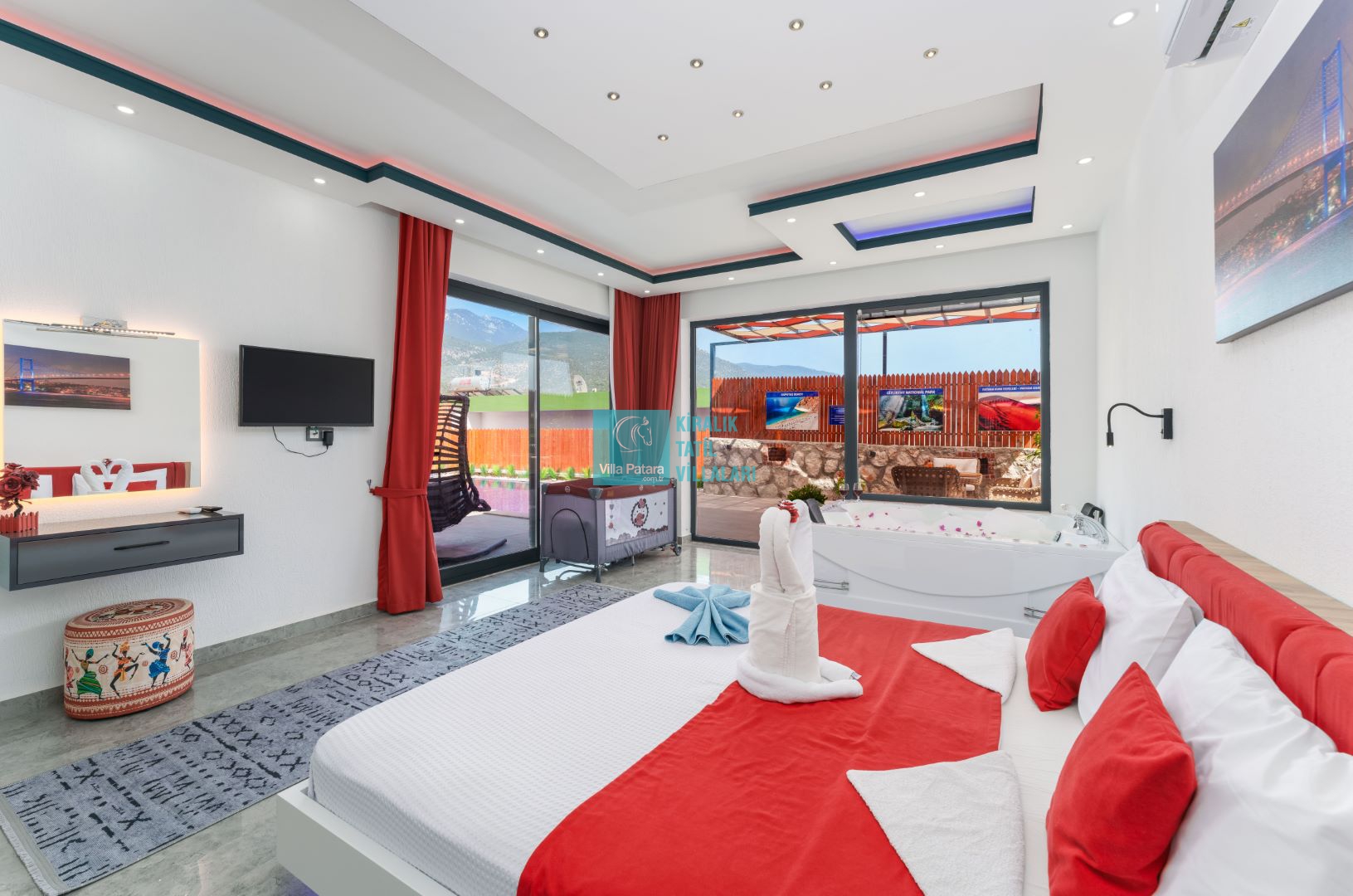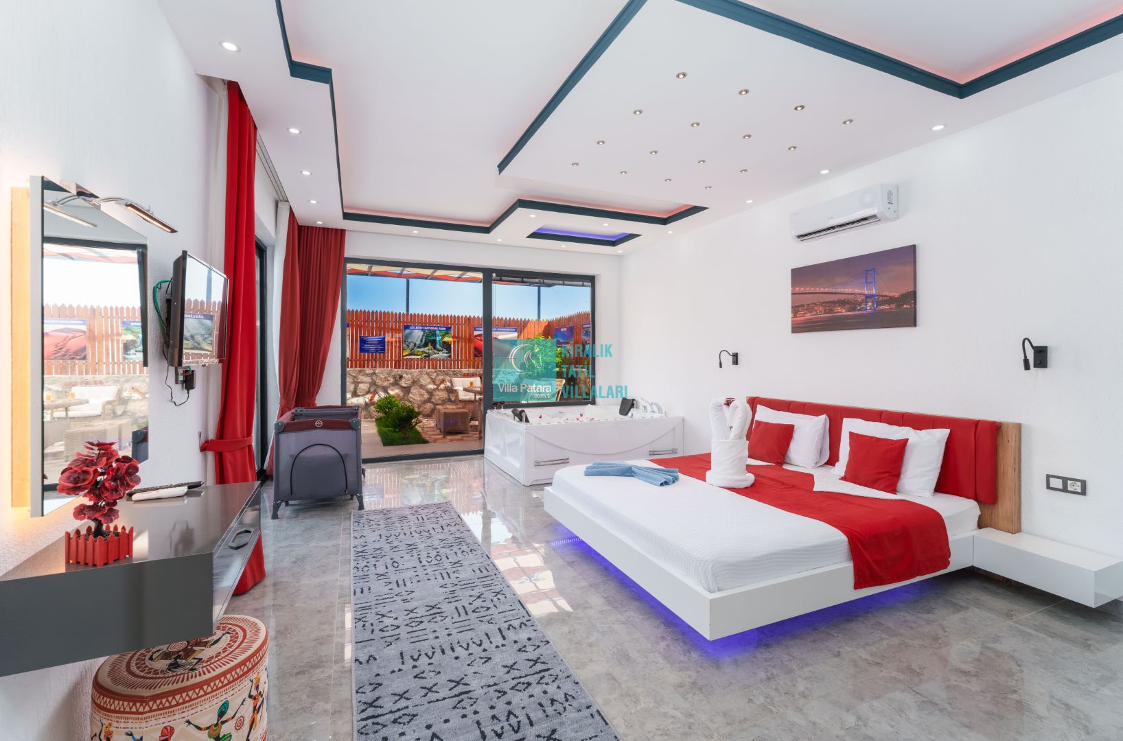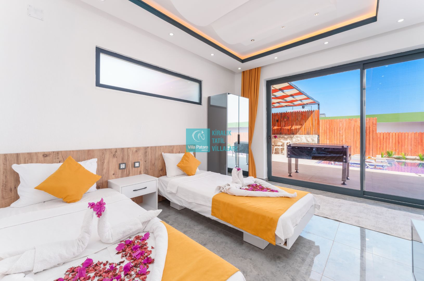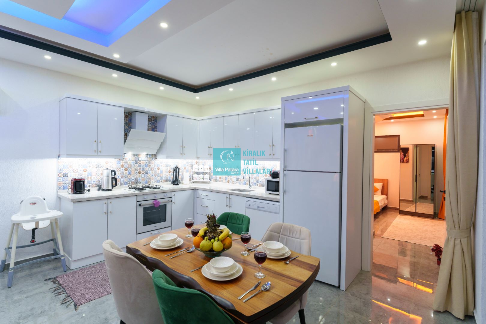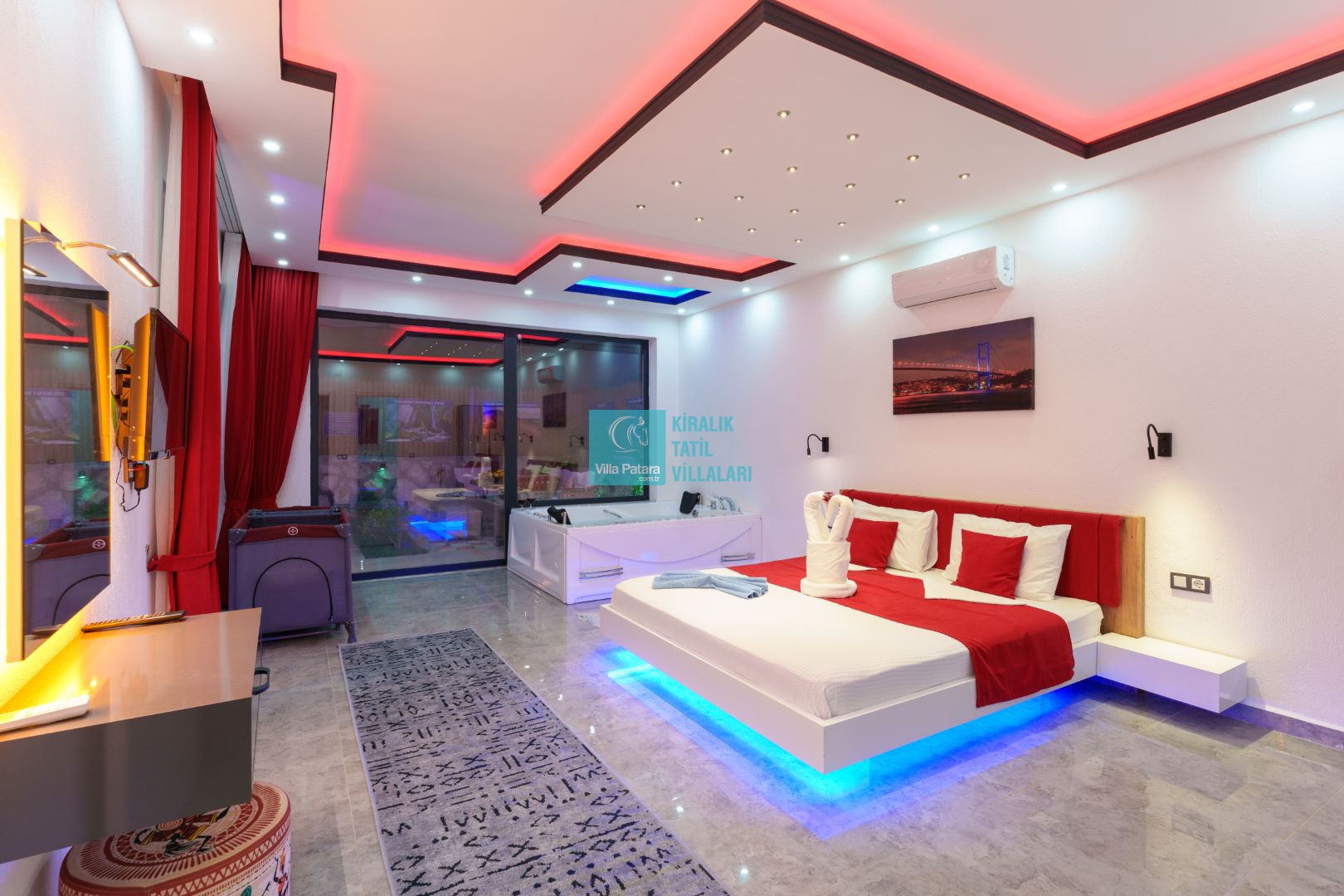 Villamız iki yatak odalıdır. Birinci yatak odasında çift kişilik yatak, banyo, jakuzi, klima ve televizyon; İkinci yatak odası içerisinde iki tek kişilik yatak, banyo ve klima bulunmaktadır. Salon içerisinde mutfak, oturma grubu, tuvalet, klima ve televizyon yer almaktadır.