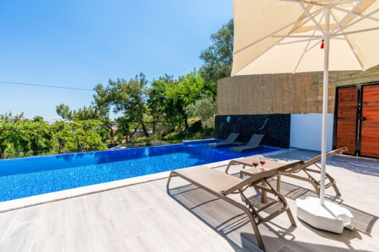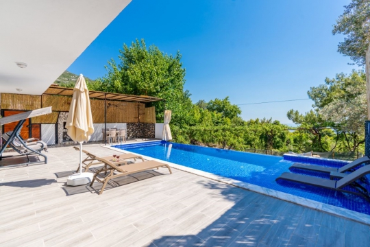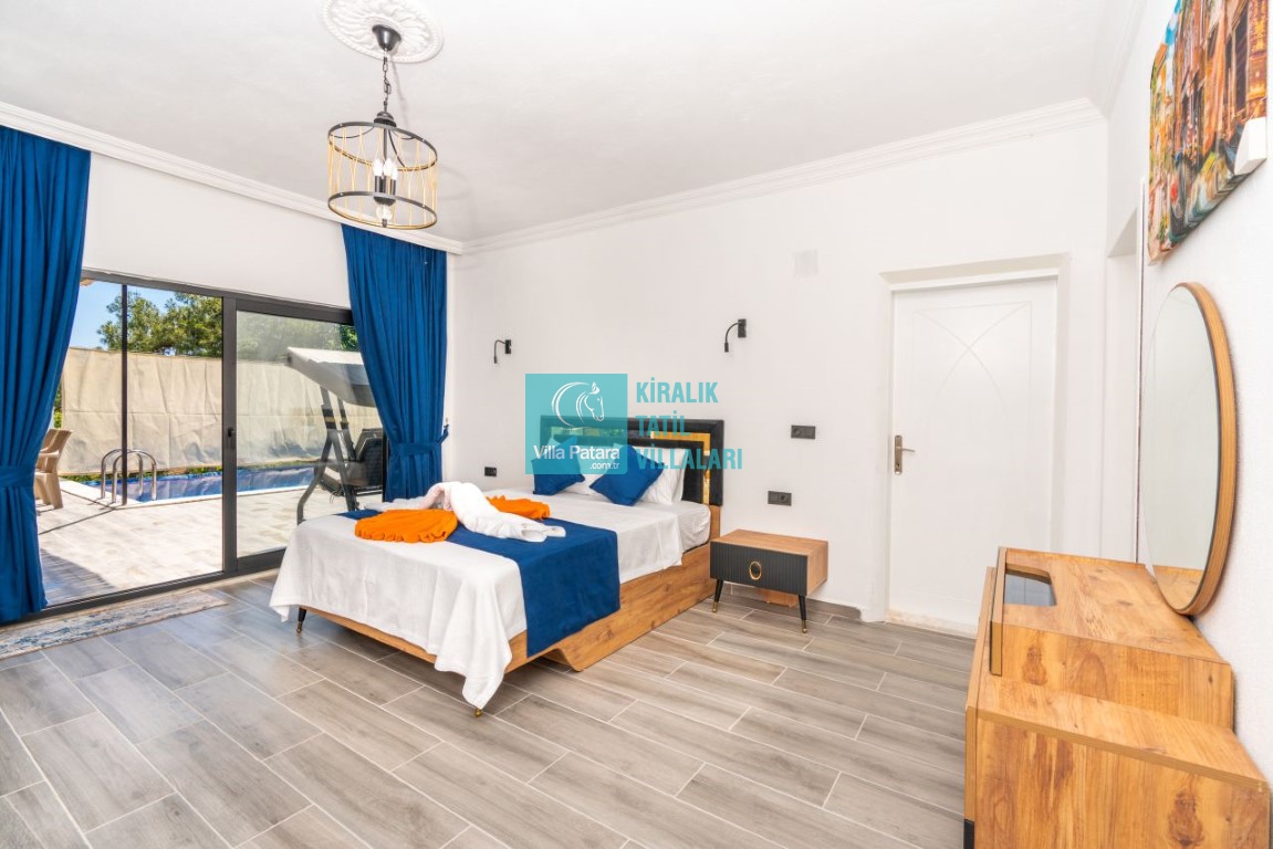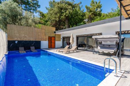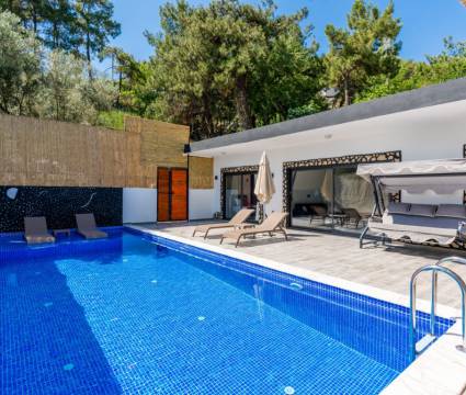Özel havuz, havuz terası, şezlong, yemek masası, salıncak, barbekü, güneş şemsiyesi bulunmaktadır.