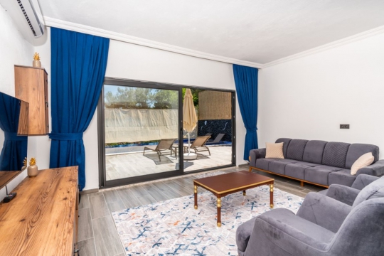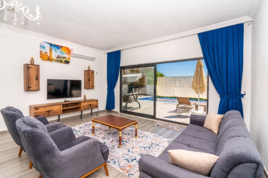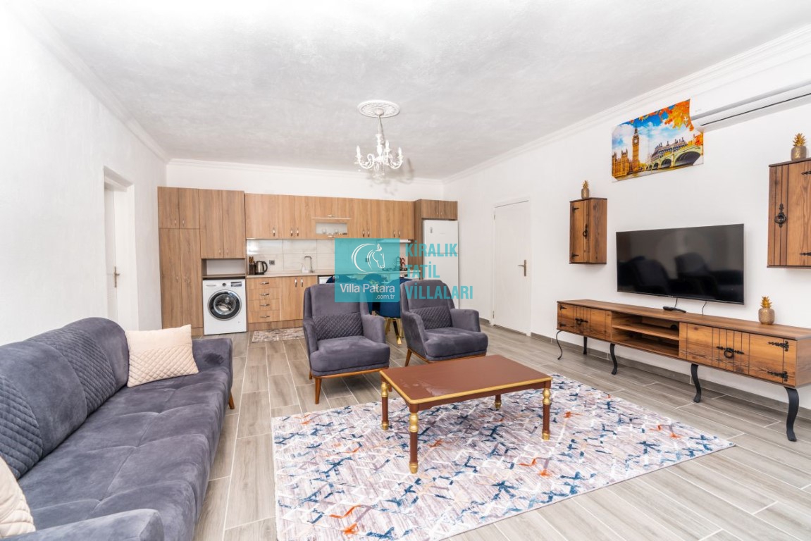 Salonda ; oturma grubu, TV, klima, sehpa, klima, ses sistemi, WİFİ, bulunmaktadır.