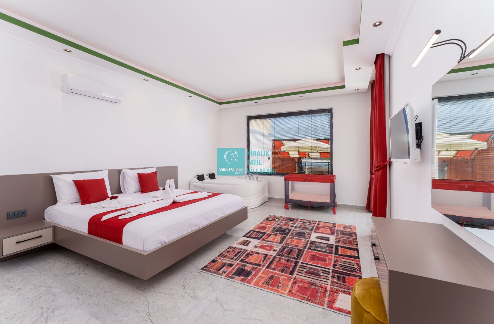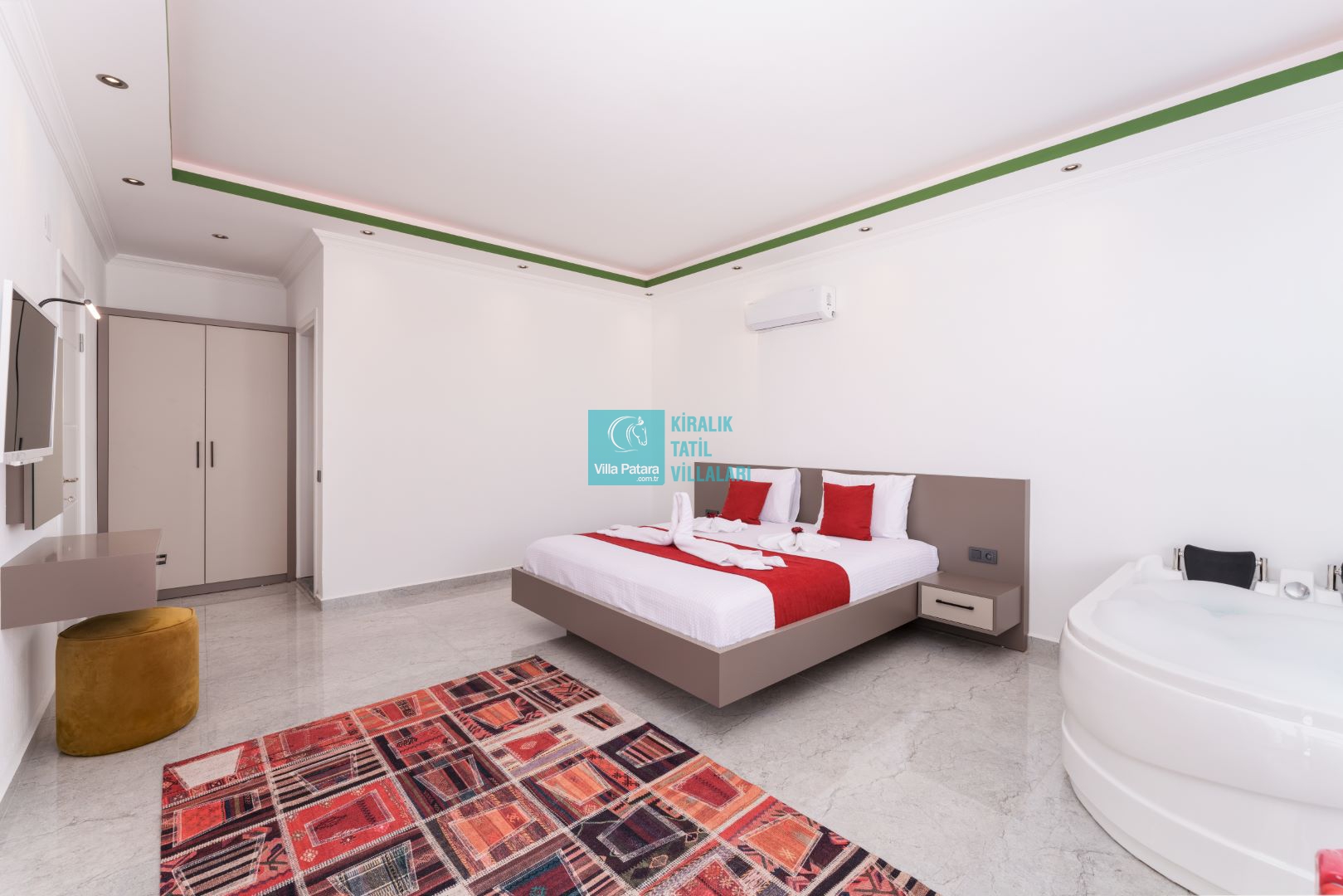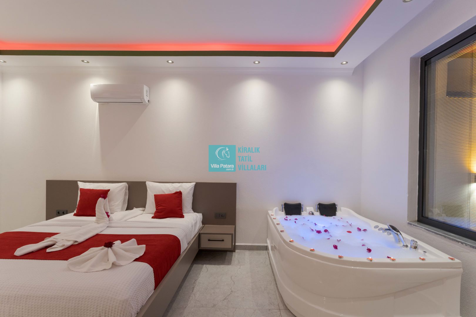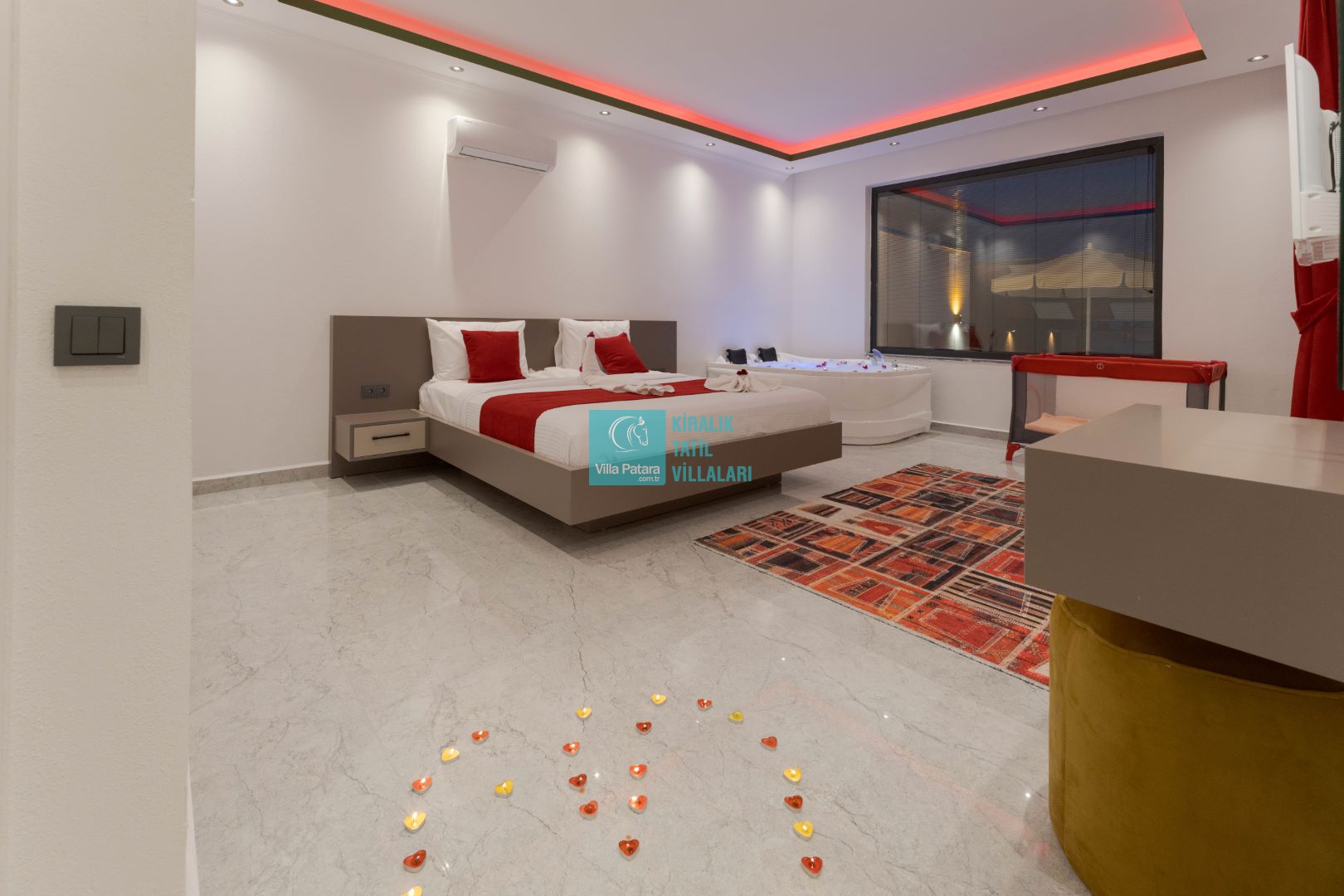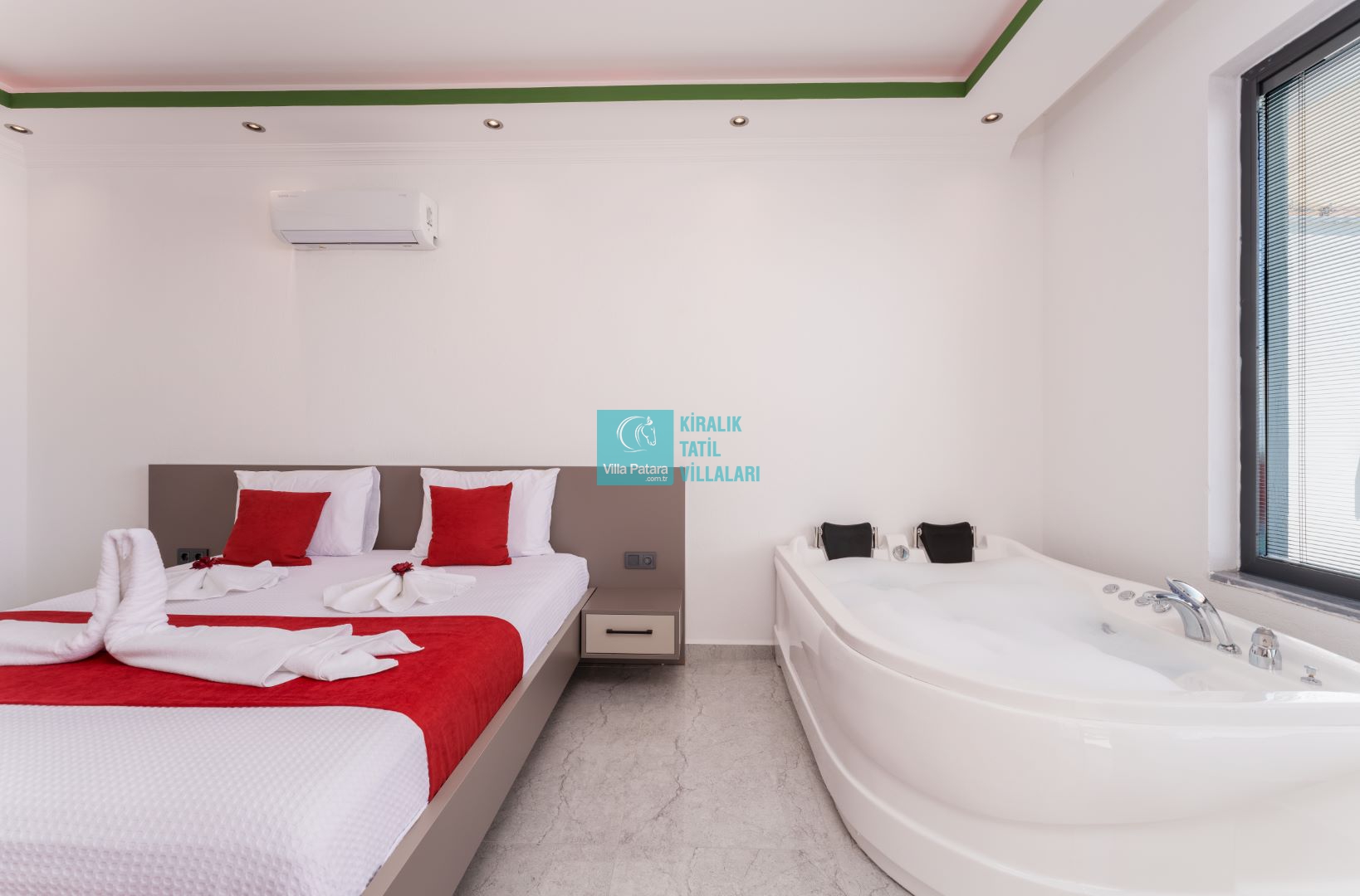 Villamızın iki adet yatak odası ve iki adet banyosu bulunmaktadır. Birinci yatak odası içerisinde bir adet çift kişilik yatak, banyo, jakuzi, klima ve televizyon; ikinci yatak odası içerisinde iki adet tek kişilik yatak, banyo ve klima yer almaktadır. Salon içerisinde mutfak, oturma grubu, televizyon ve klima yer almaktadır.