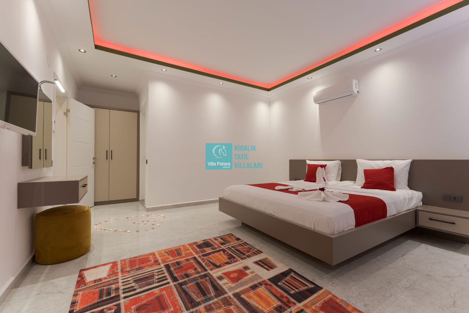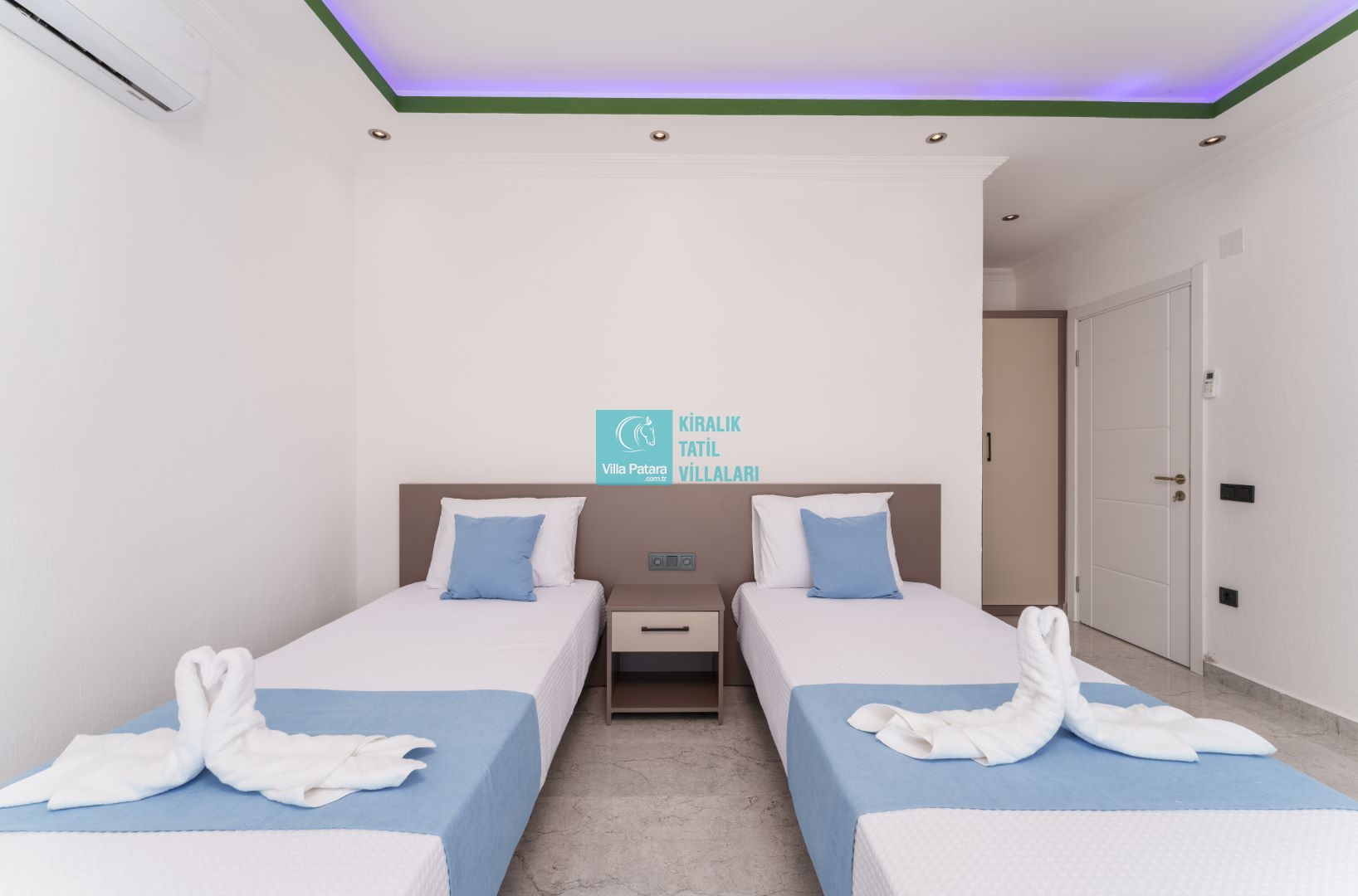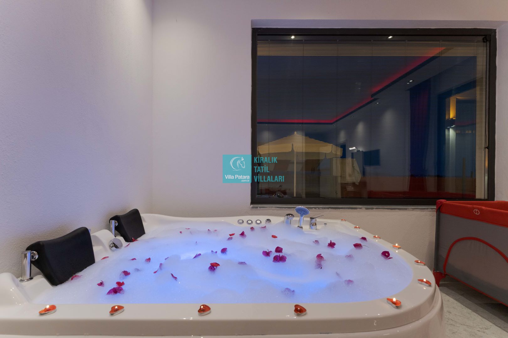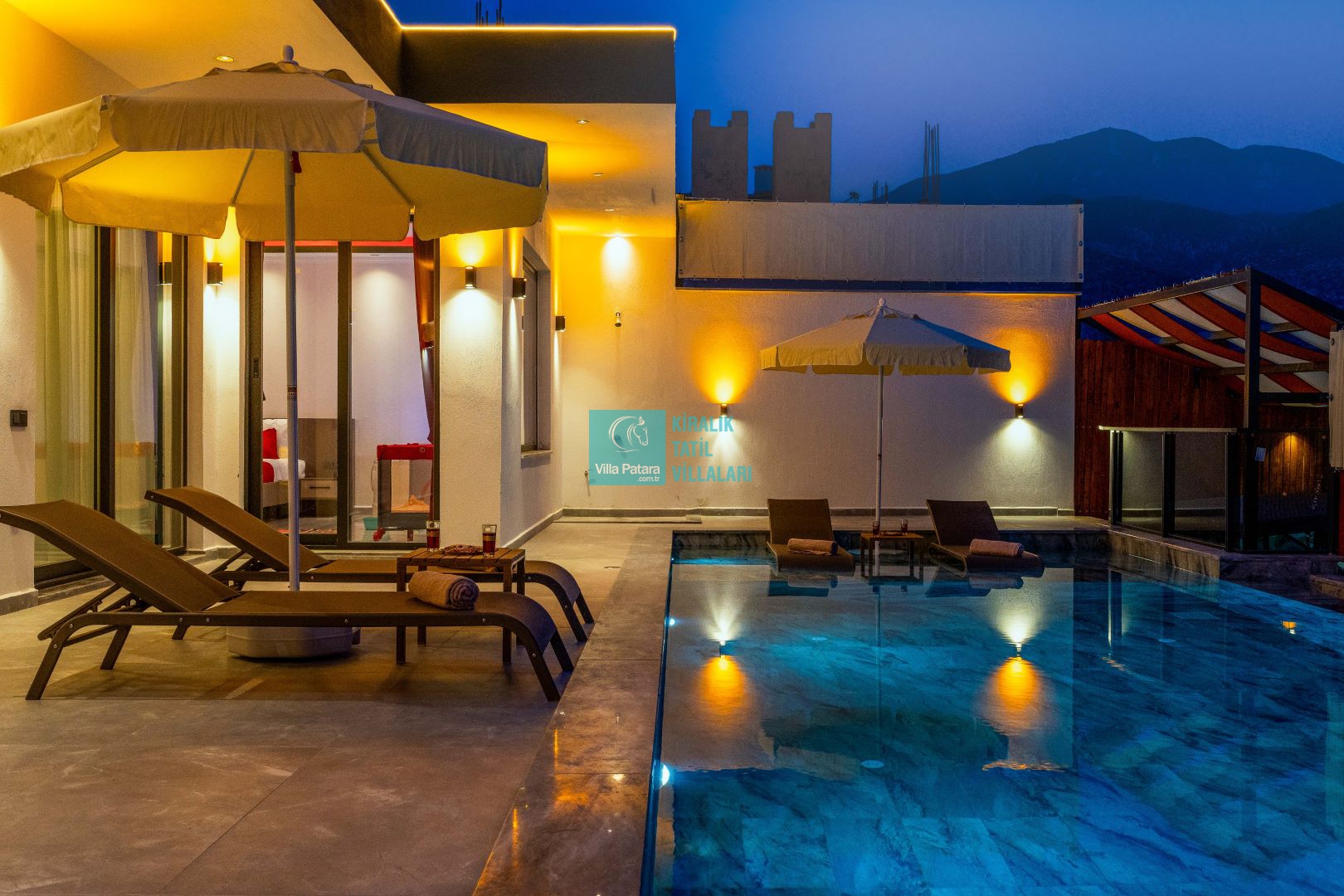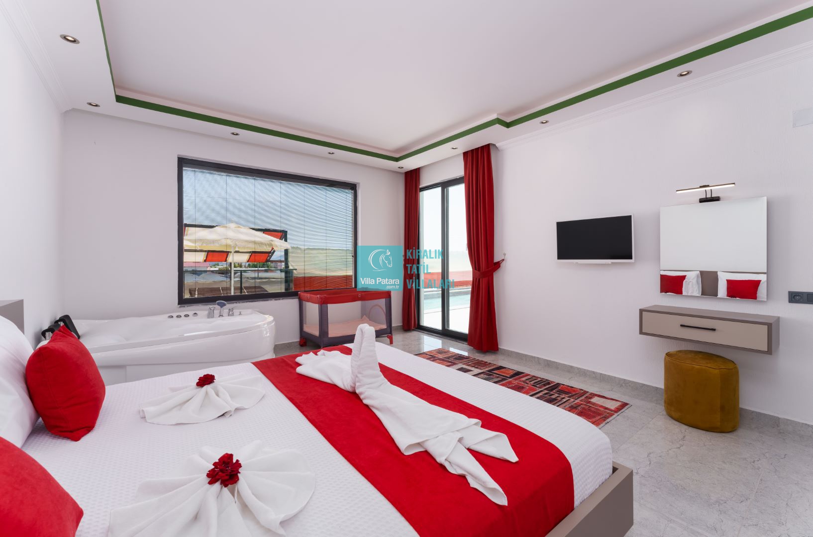 Villamızın iki adet yatak odası ve iki adet banyosu bulunmaktadır. Birinci yatak odası içerisinde bir adet çift kişilik yatak, banyo, jakuzi, klima ve televizyon; ikinci yatak odası içerisinde iki adet tek kişilik yatak, banyo ve klima yer almaktadır. Salon içerisinde mutfak, oturma grubu, televizyon ve klima yer almaktadır.