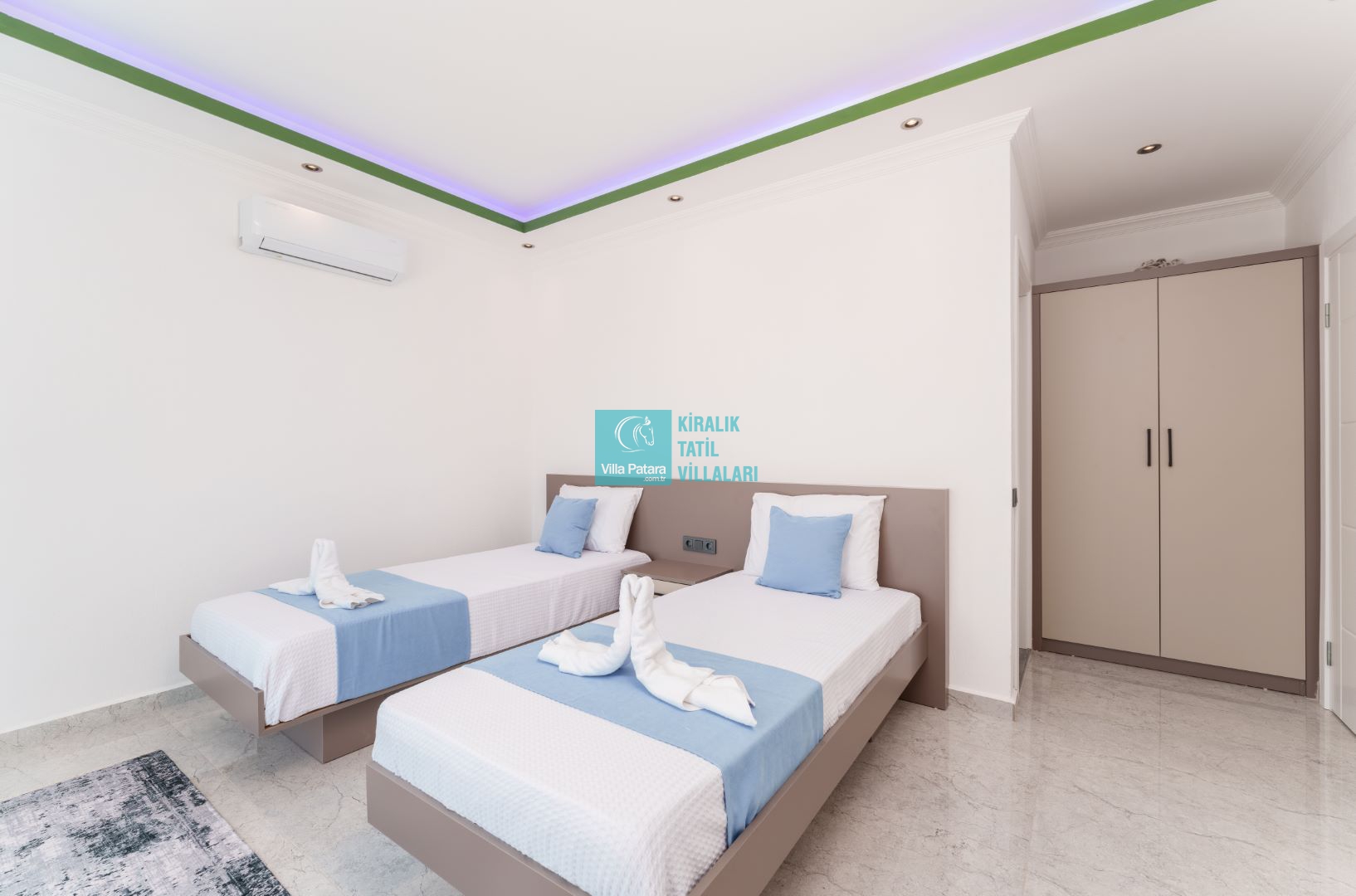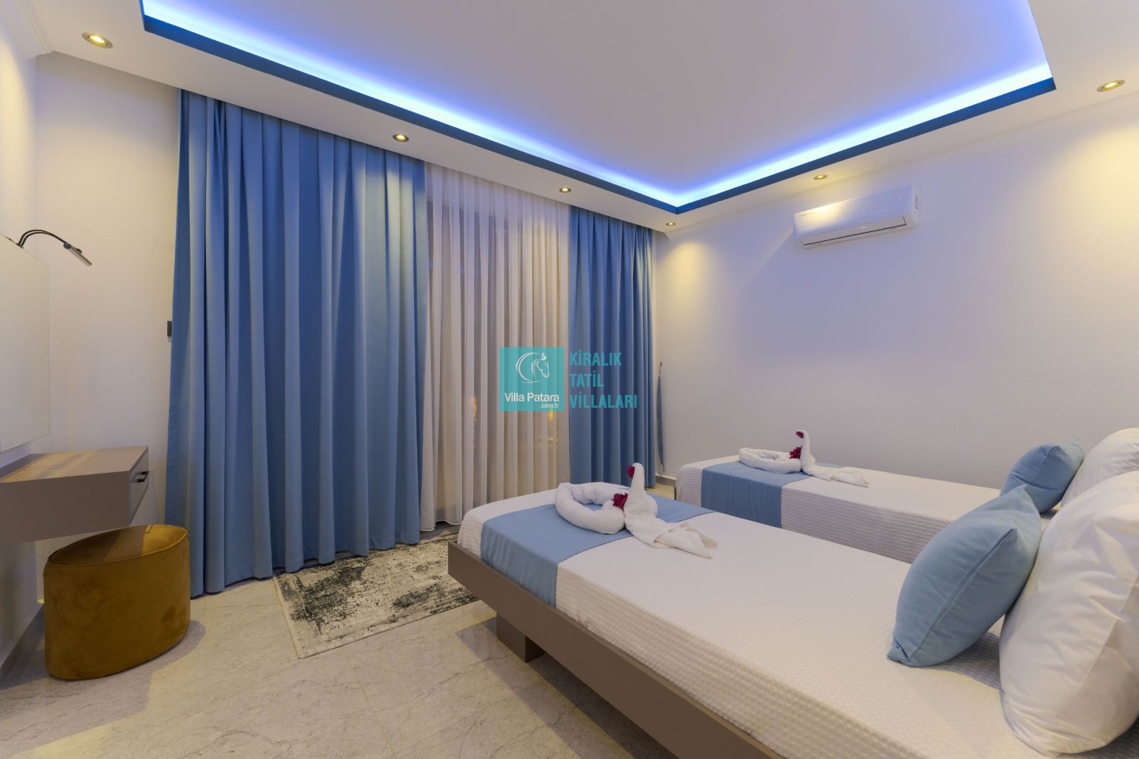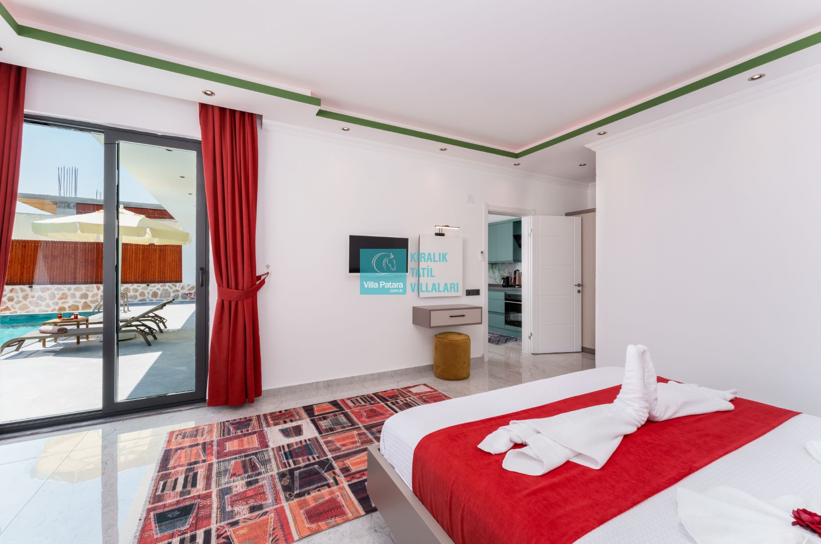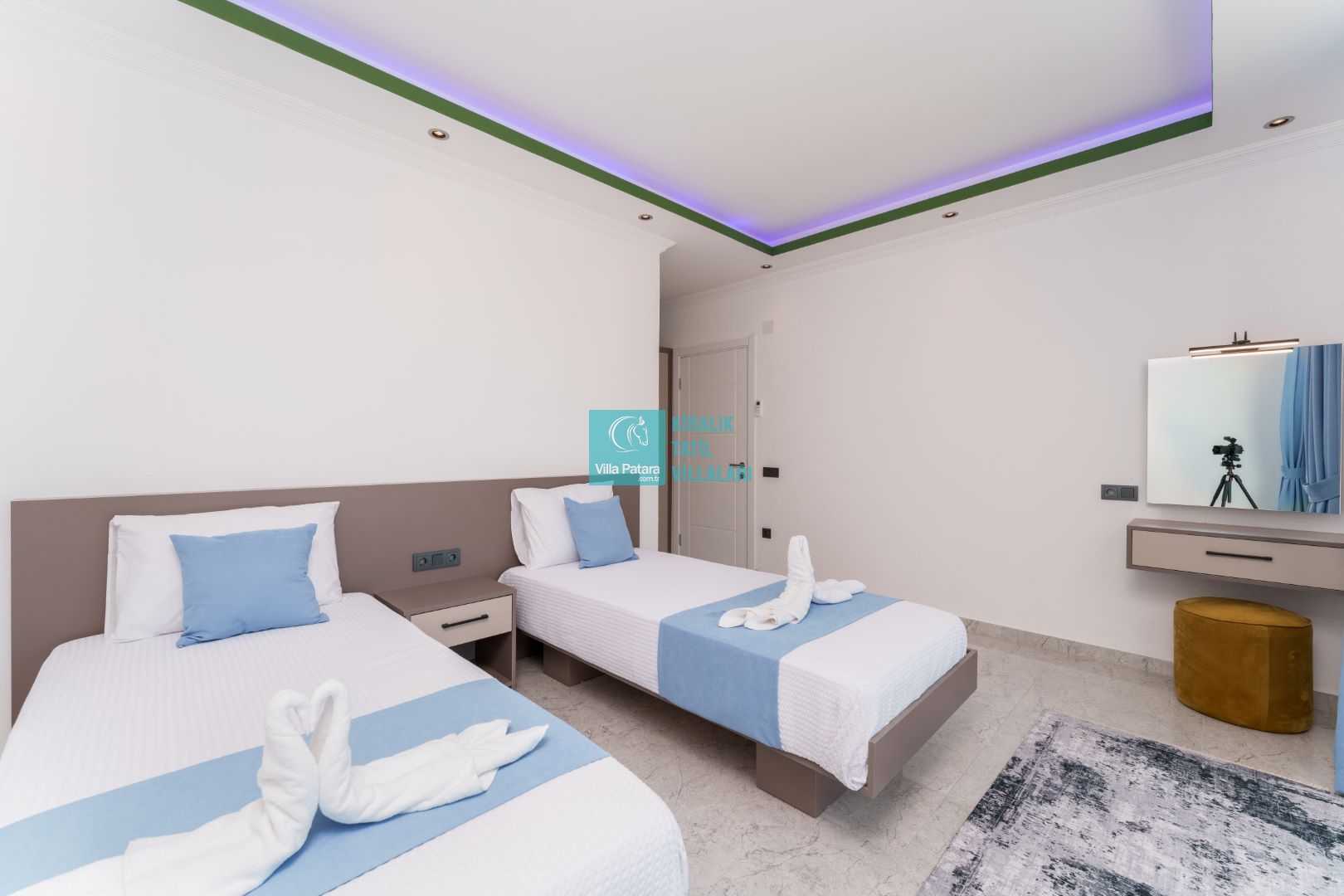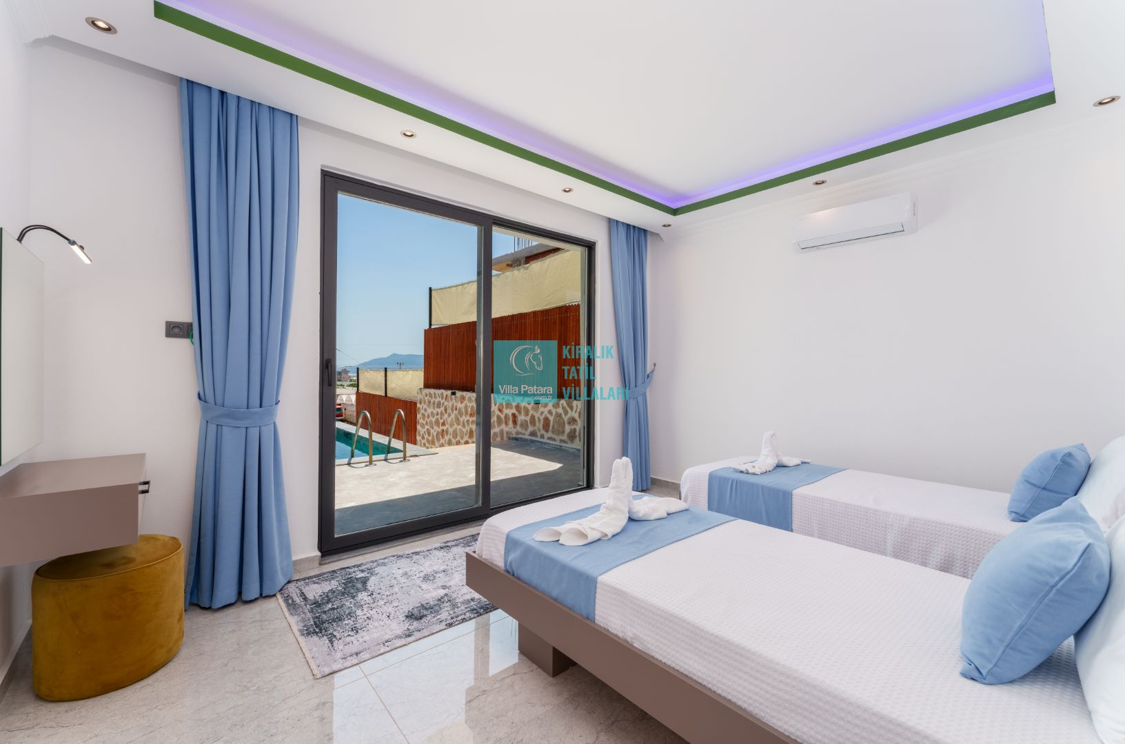 Villamızın iki adet yatak odası ve iki adet banyosu bulunmaktadır. Birinci yatak odası içerisinde bir adet çift kişilik yatak, banyo, jakuzi, klima ve televizyon; ikinci yatak odası içerisinde iki adet tek kişilik yatak, banyo ve klima yer almaktadır. Salon içerisinde mutfak, oturma grubu, televizyon ve klima yer almaktadır.