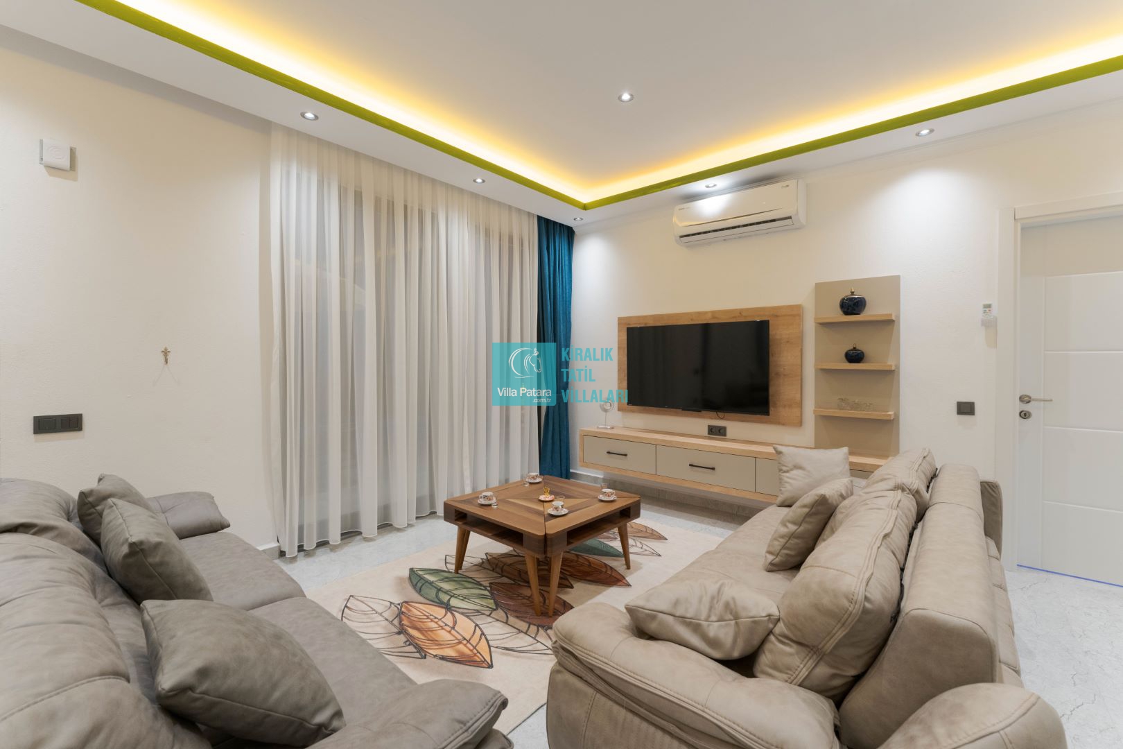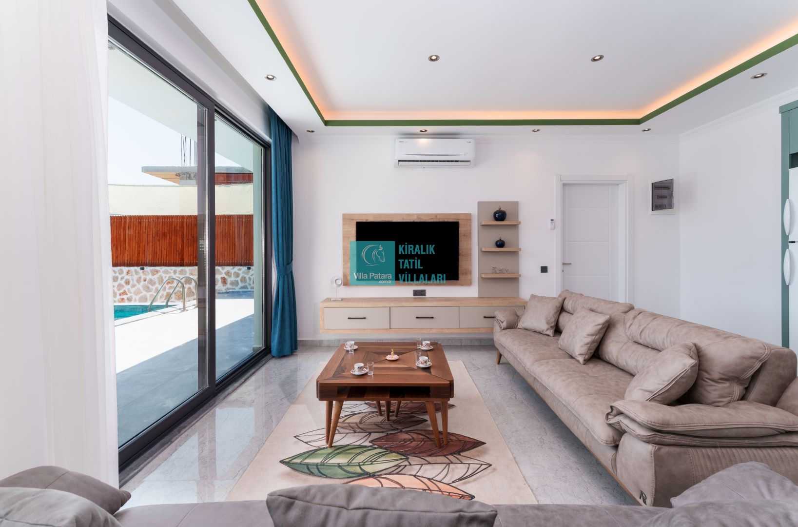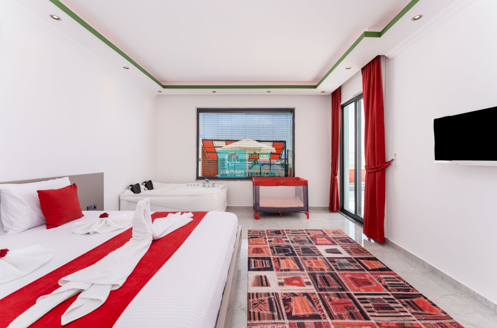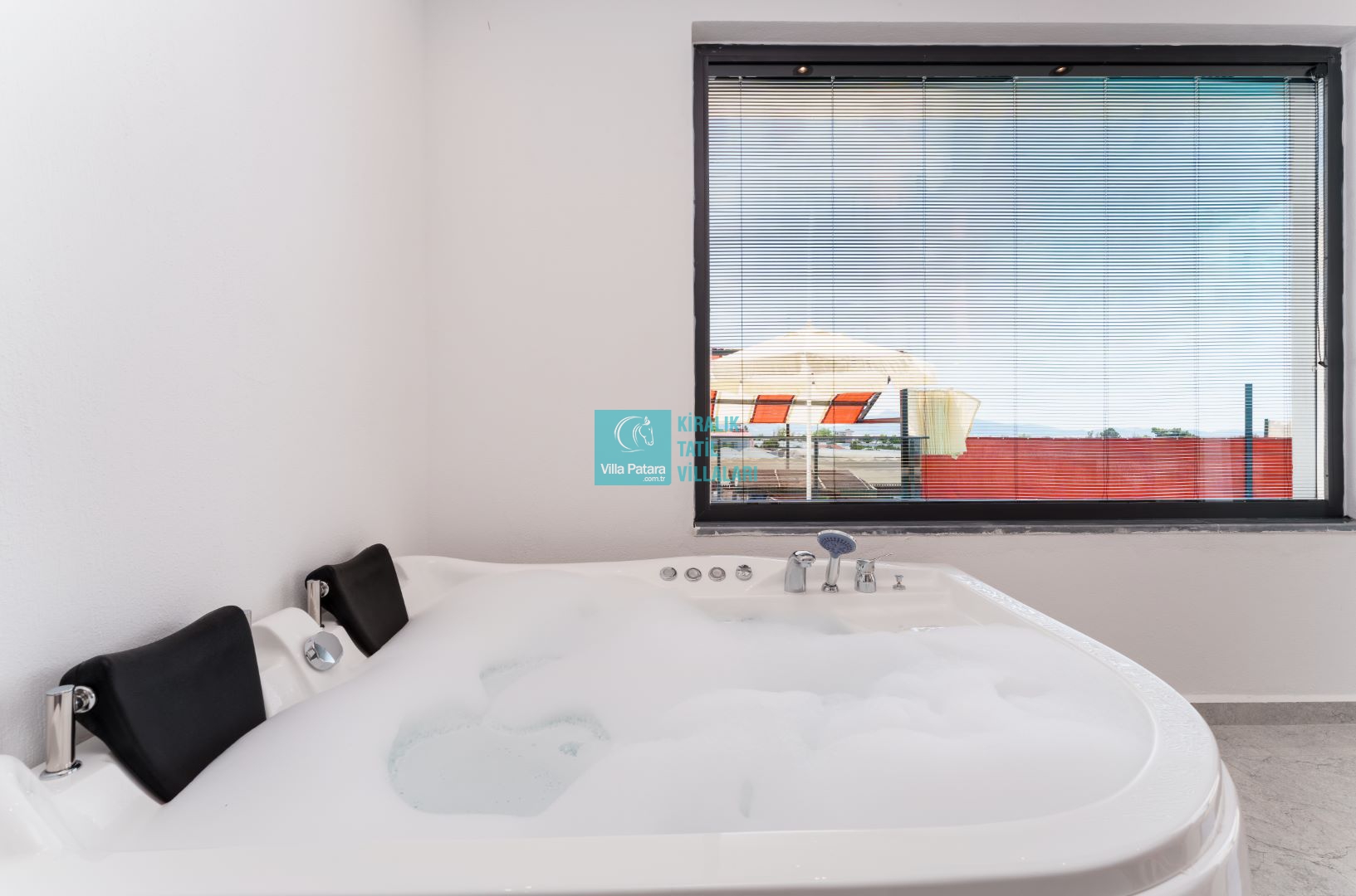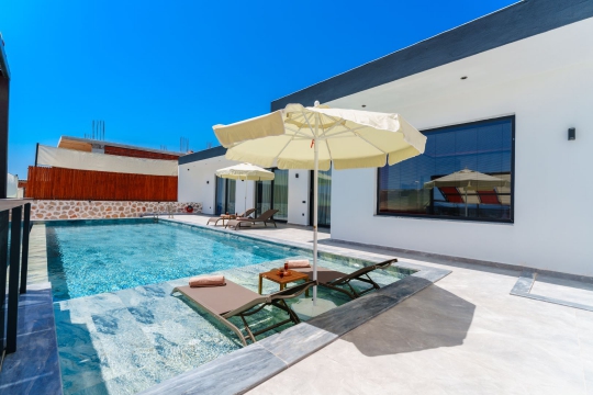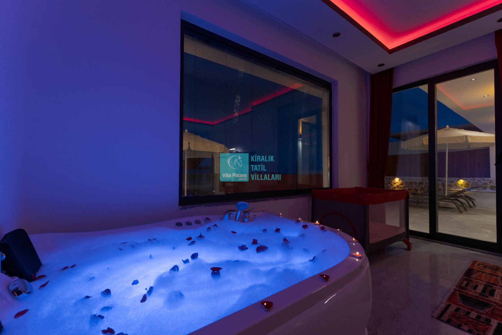 Villamızın iki adet yatak odası ve iki adet banyosu bulunmaktadır. Birinci yatak odası içerisinde bir adet çift kişilik yatak, banyo, jakuzi, klima ve televizyon; ikinci yatak odası içerisinde iki adet tek kişilik yatak, banyo ve klima yer almaktadır. Salon içerisinde mutfak, oturma grubu, televizyon ve klima yer almaktadır.