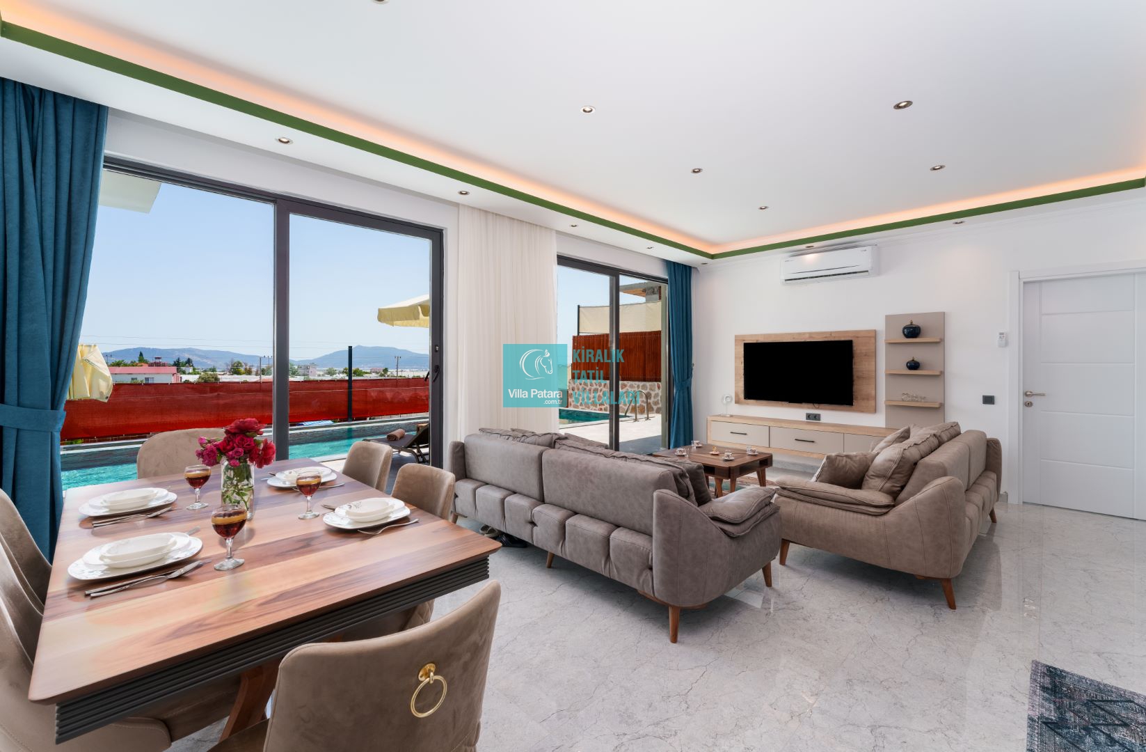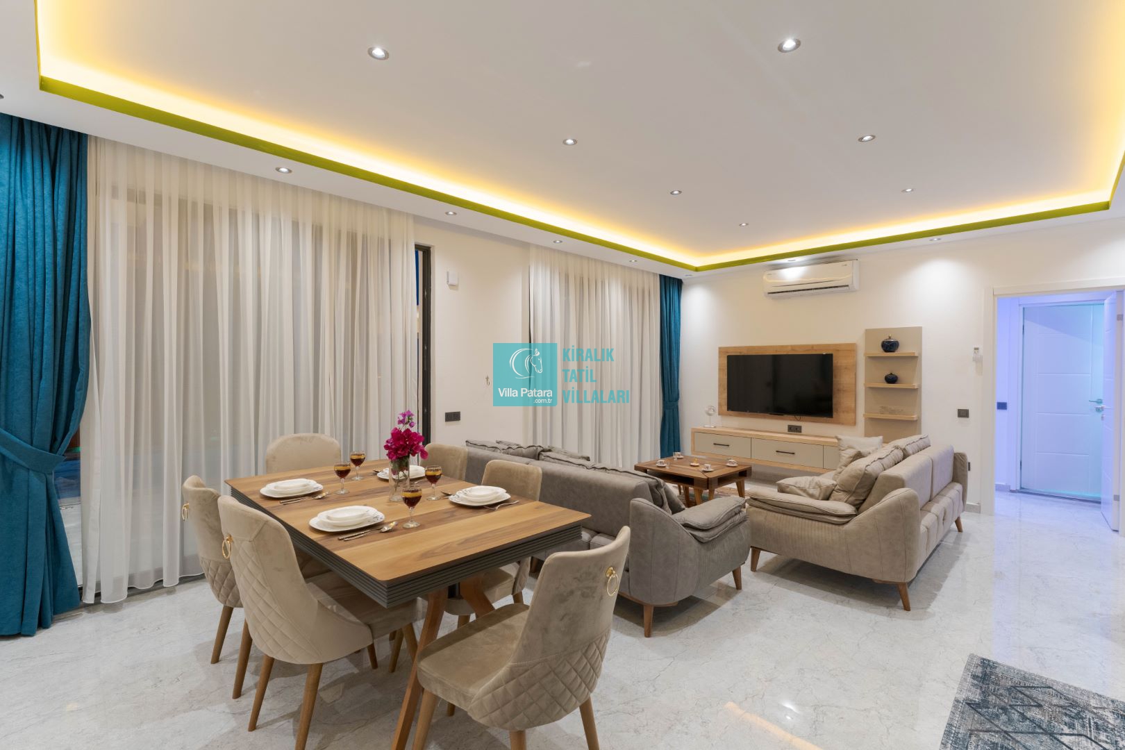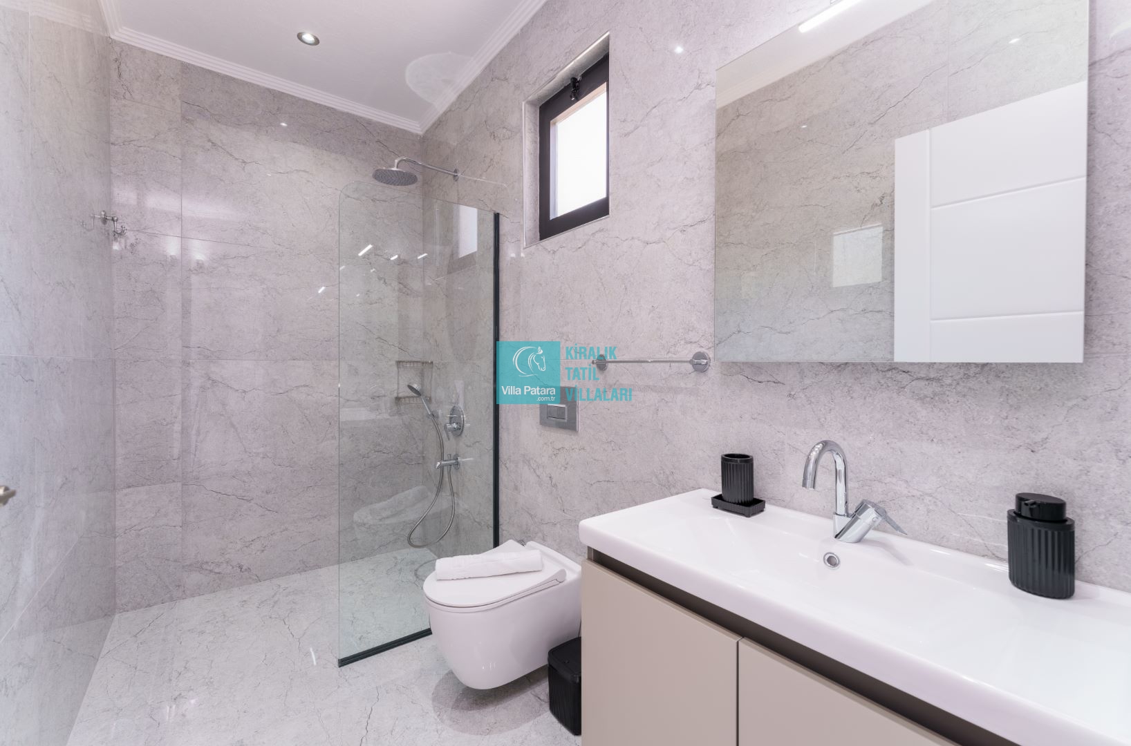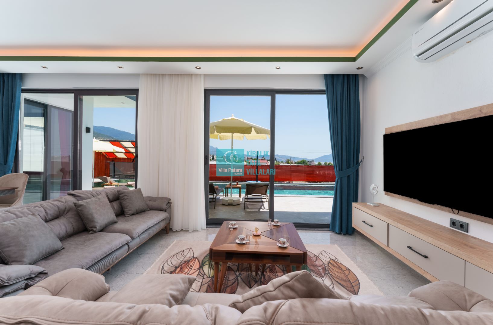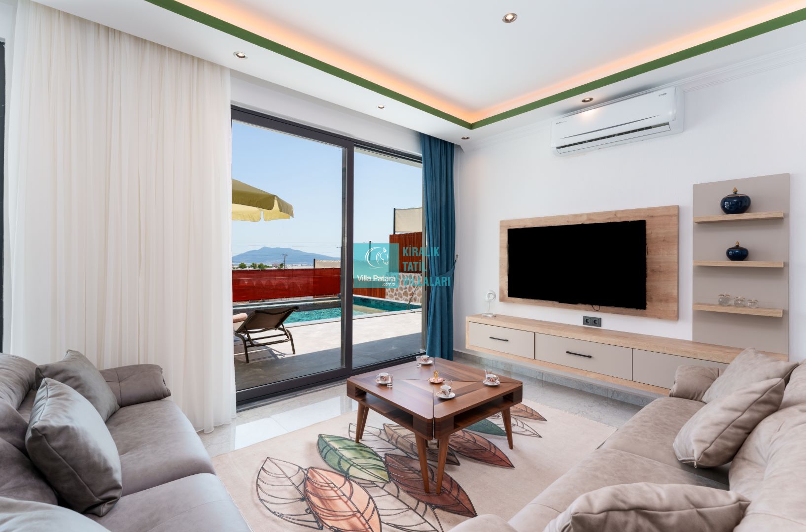 Villamızın iki adet yatak odası ve iki adet banyosu bulunmaktadır. Birinci yatak odası içerisinde bir adet çift kişilik yatak, banyo, jakuzi, klima ve televizyon; ikinci yatak odası içerisinde iki adet tek kişilik yatak, banyo ve klima yer almaktadır. Salon içerisinde mutfak, oturma grubu, televizyon ve klima yer almaktadır.