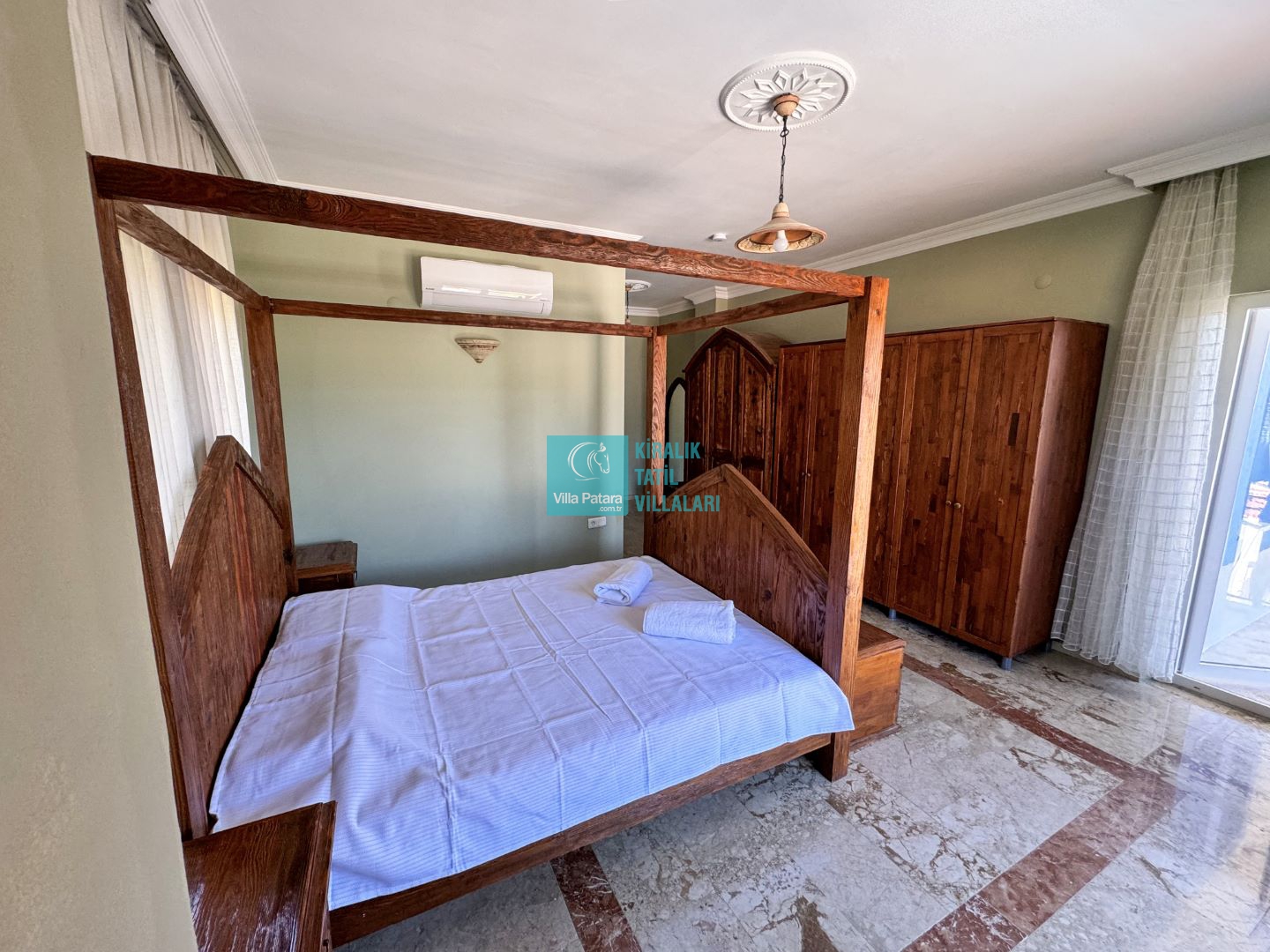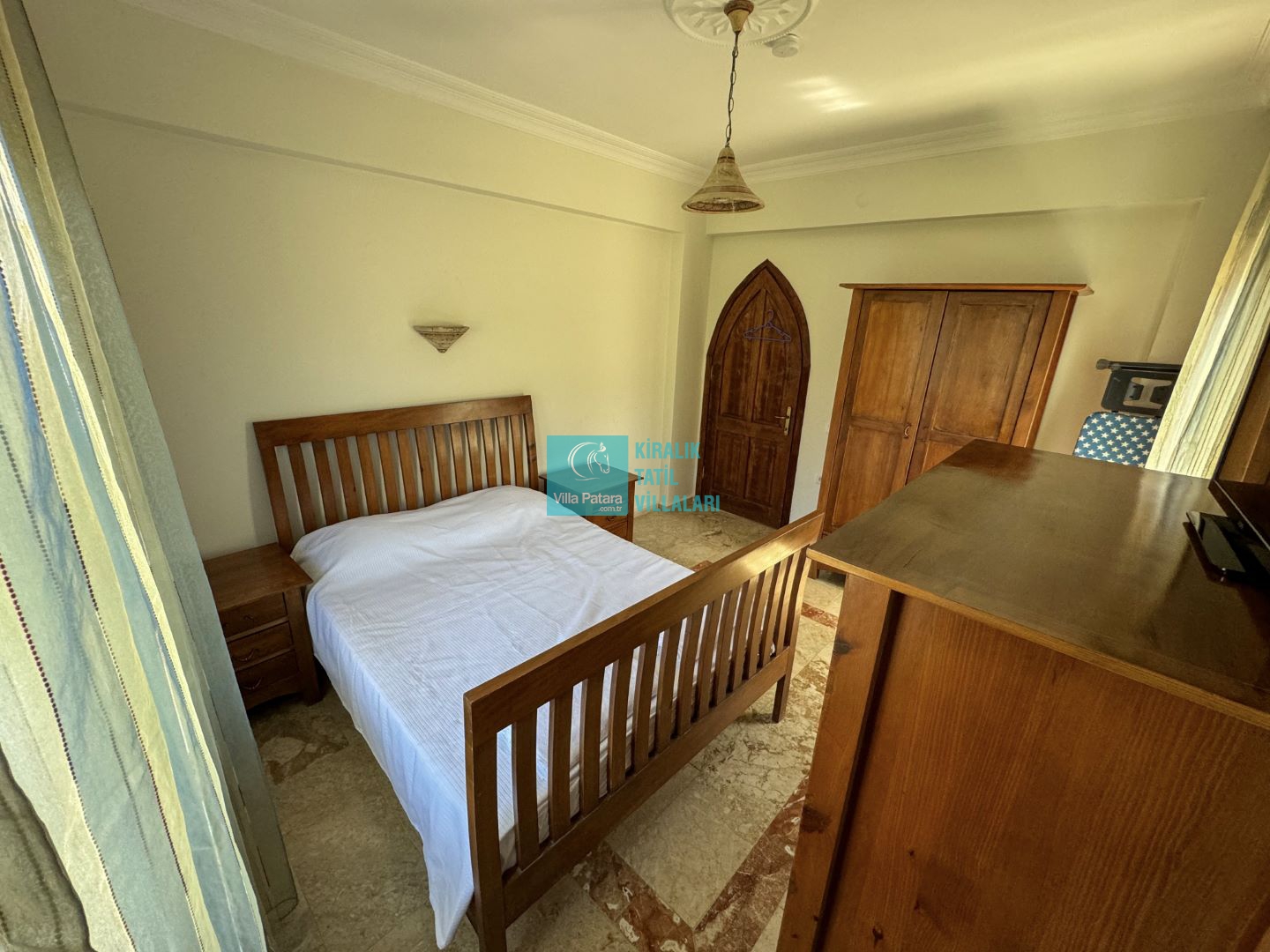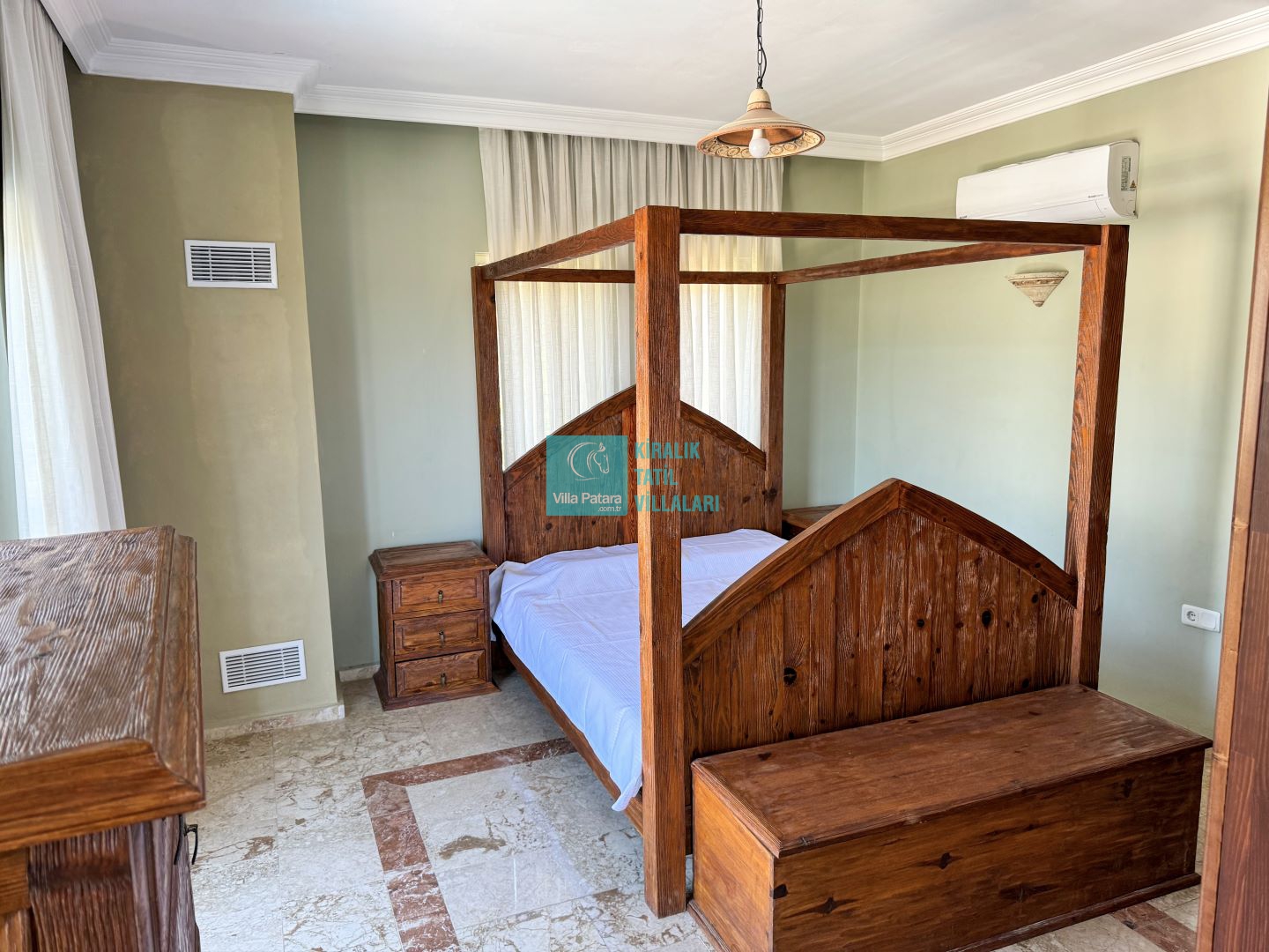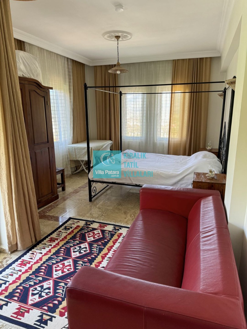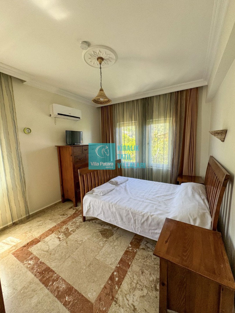 1.Yatak odası: Çift kişilik yatak, ebeveyn banyo, klima ve elbise dolabı bulunmaktadır.