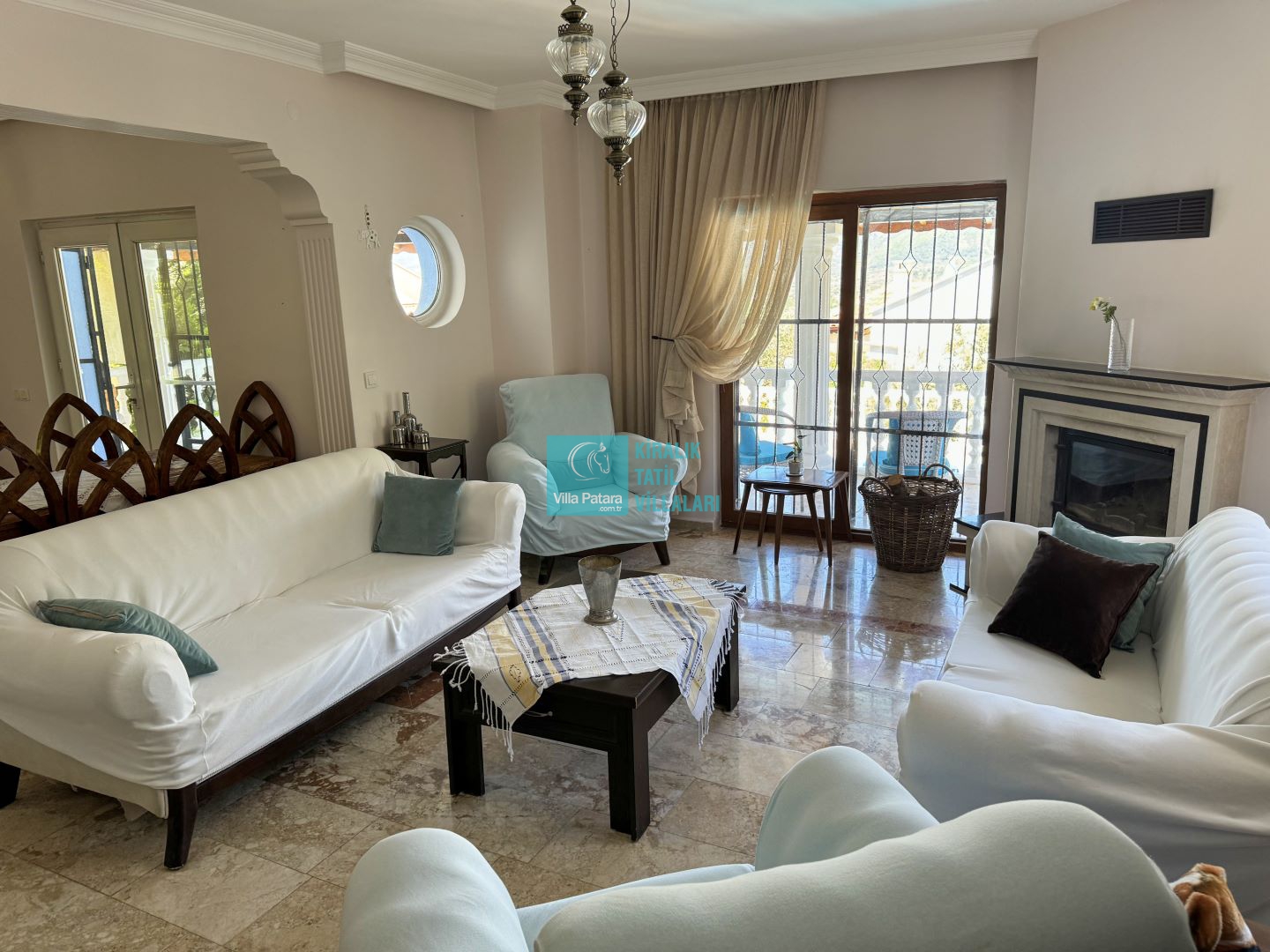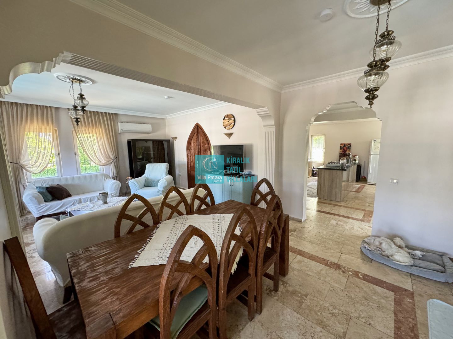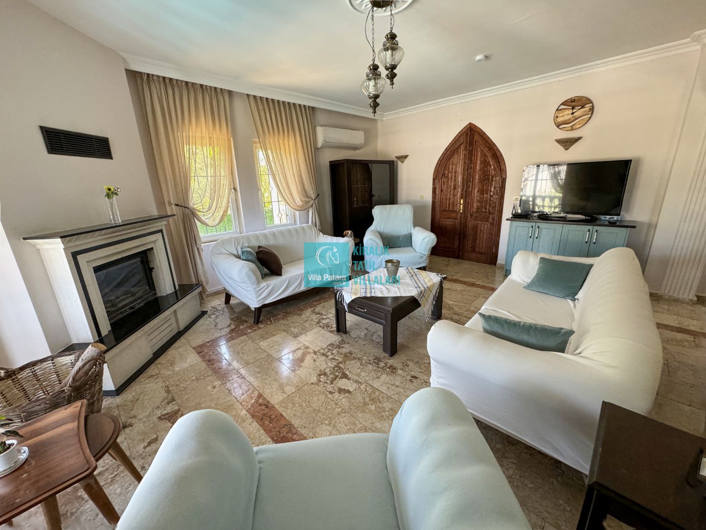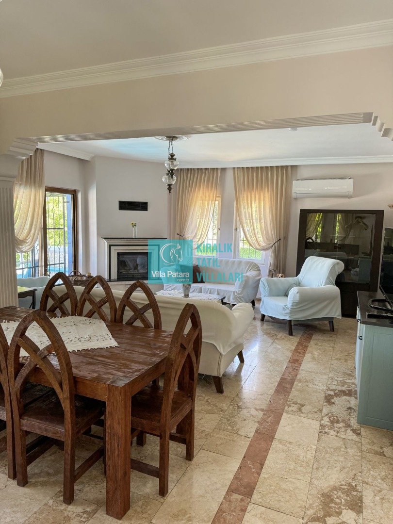 Salon: Özenle döşenmiş açık mutfaklı salon, modern koltuklar, yemek masası, Led tv, uydu alıcısı, dvd player ve klima bulunmaktadır.