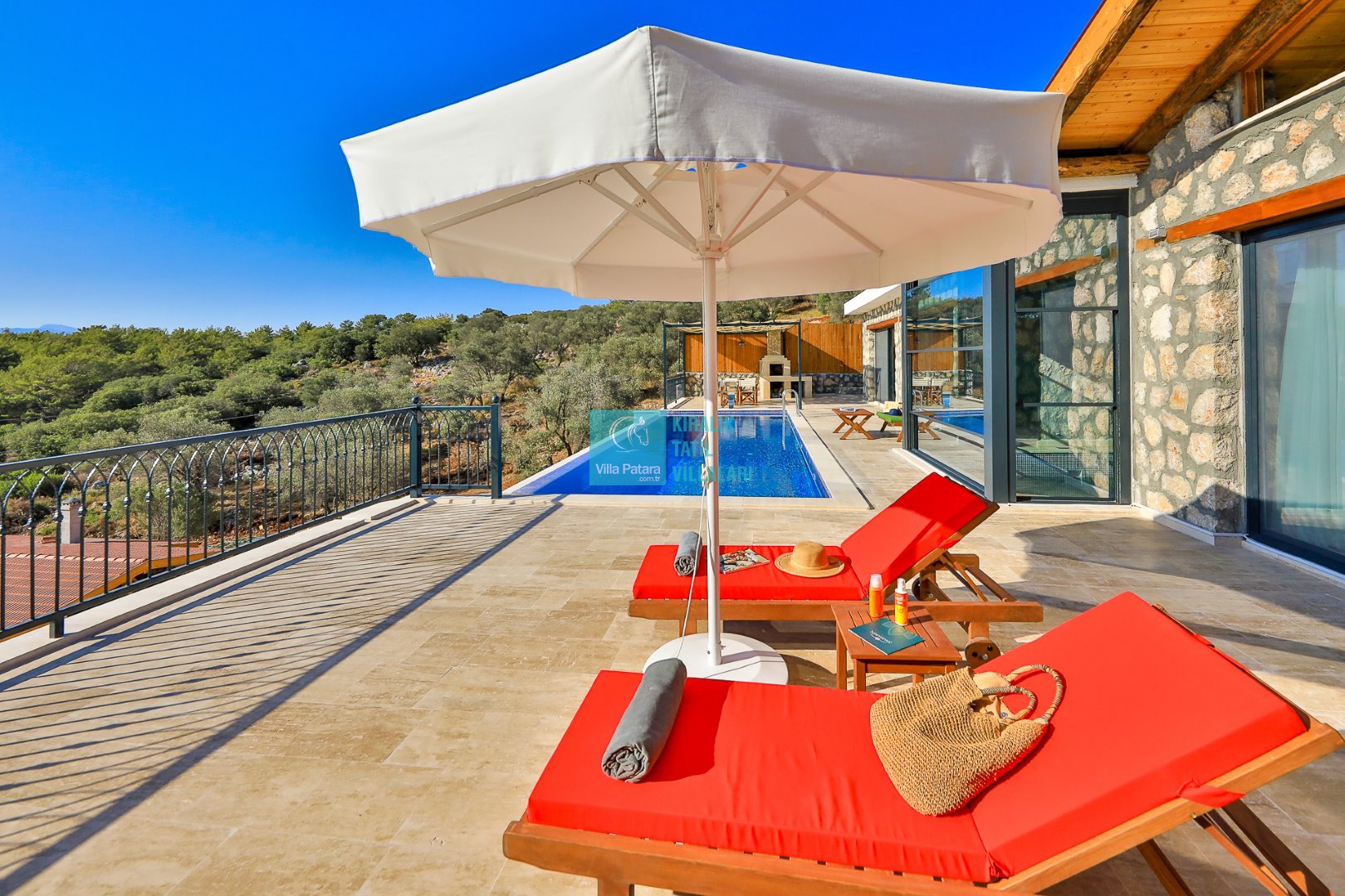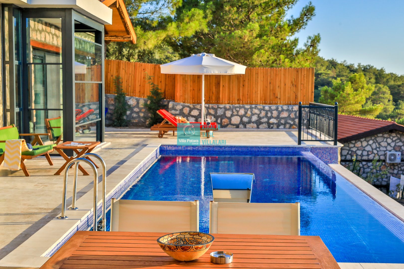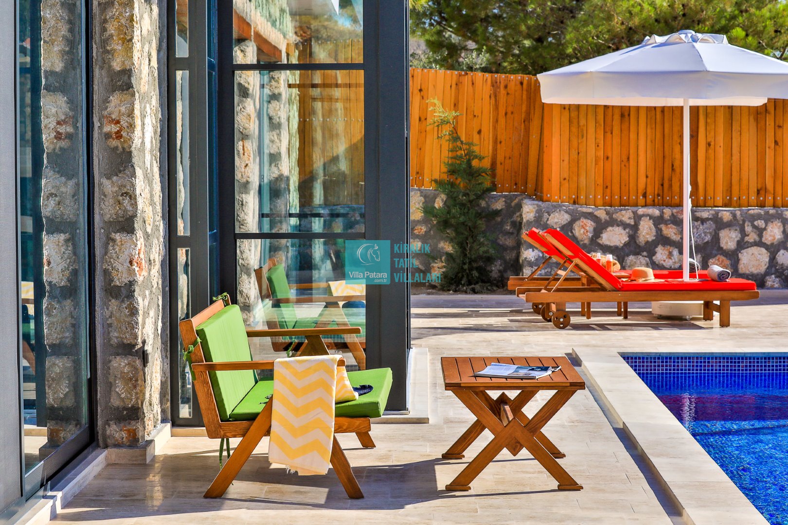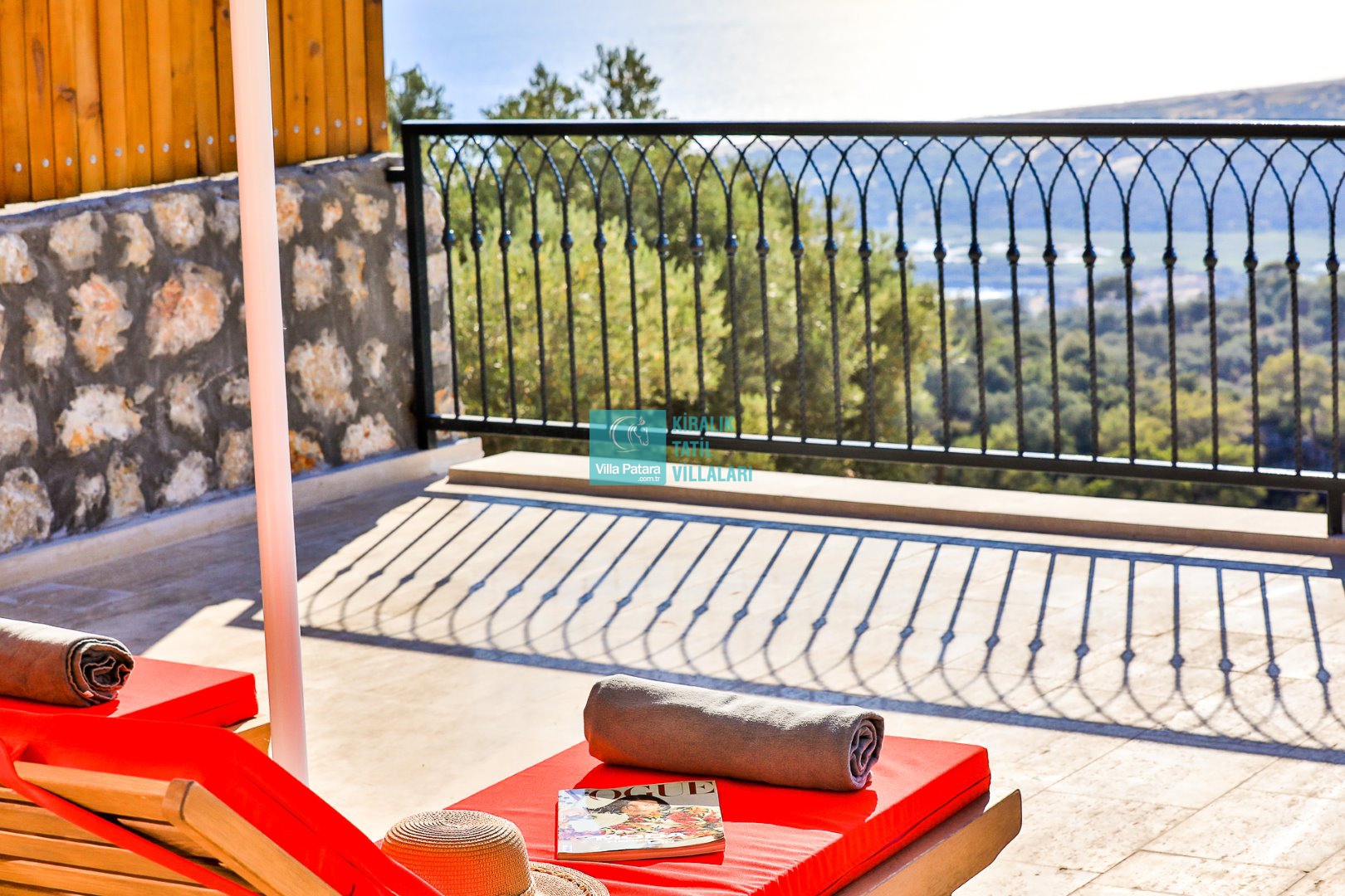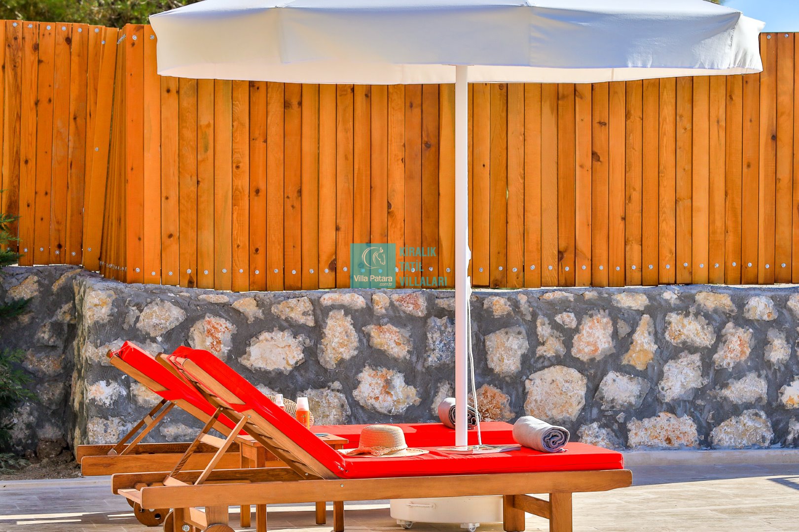 HAVUZ TERASI: Geniş havuz terası ve özel yüzme havuzunun bulunduğu bahçede; muhteşem Patara manzarasına karşı Spa Havuzu, şezlonglar, güneş şemsiyesi,4 kişilik yemek masası, mangal yeri bulunmaktadır.