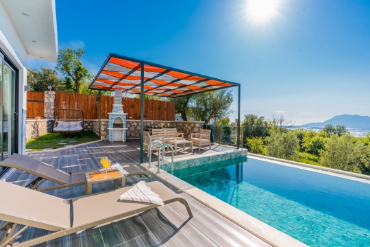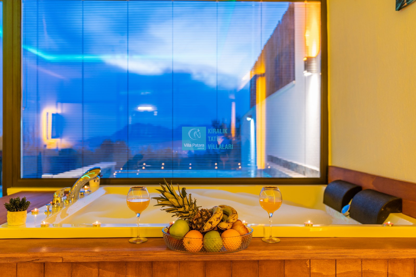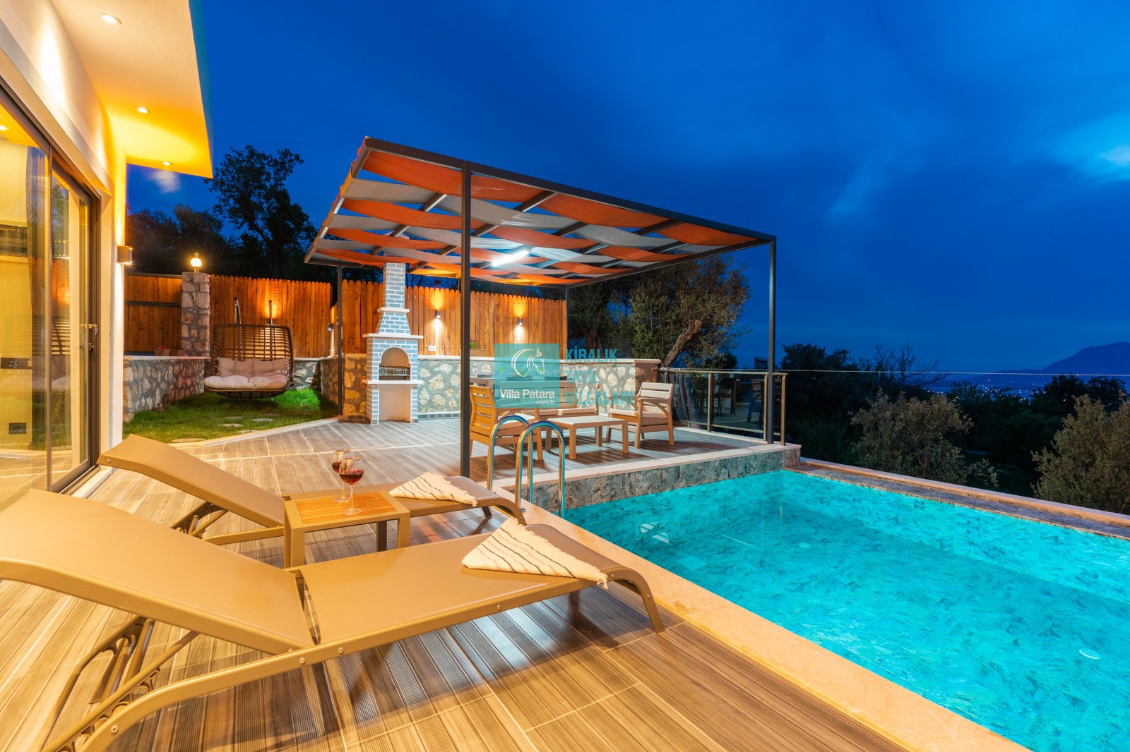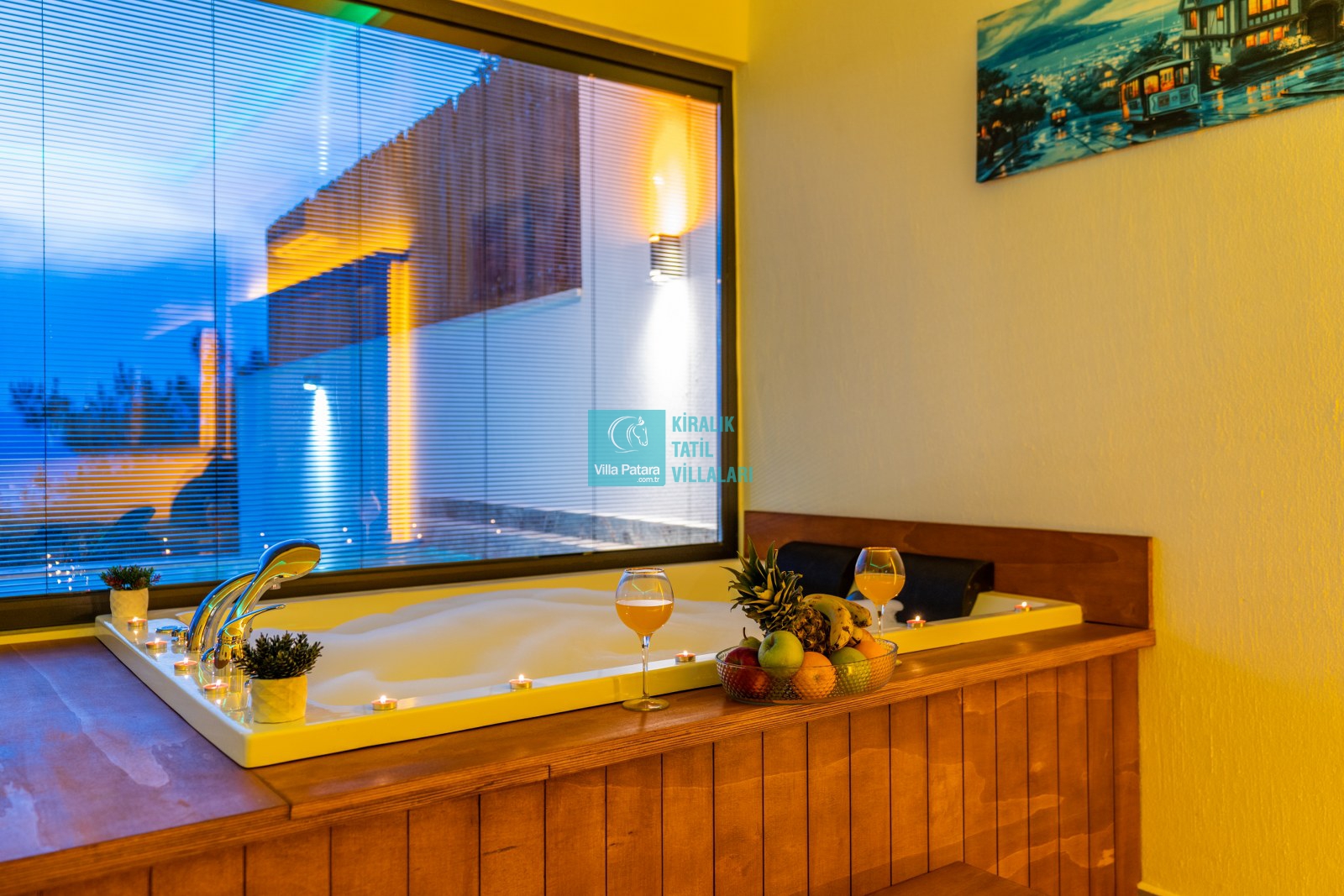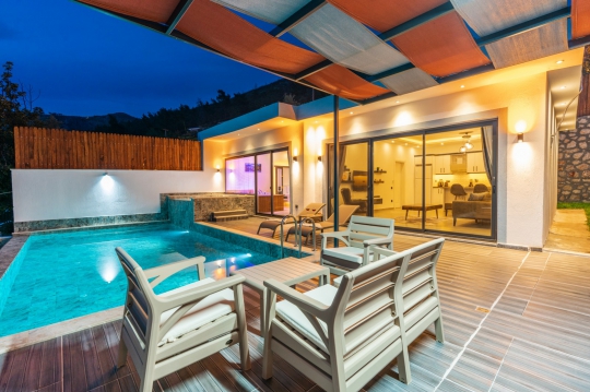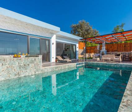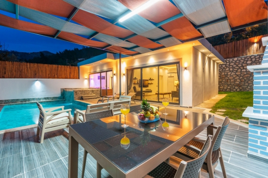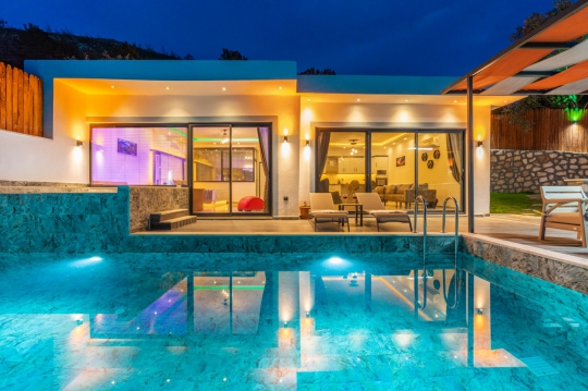 Kalkan Üzümlü mevkiinde bulunan villa, 1 yatak odasıyla 2 kişilik konaklama kapasitesi sunmaktadır. Muhteşem doğa manzarasına hakim olup balayı çiftleri için uygundur. Korunaklı havuz terasında kapasiteye uygun şezlong takımı, oturma grubu, salıncak ve barbekü alanı bulunan villanın, yine havuz terasına açılan oturma odası ve donanımlı açık mutfağı; yatak odasında çift kişilik yatak, ebeveyn banyosu ve jakuzi bulunmaktadır.