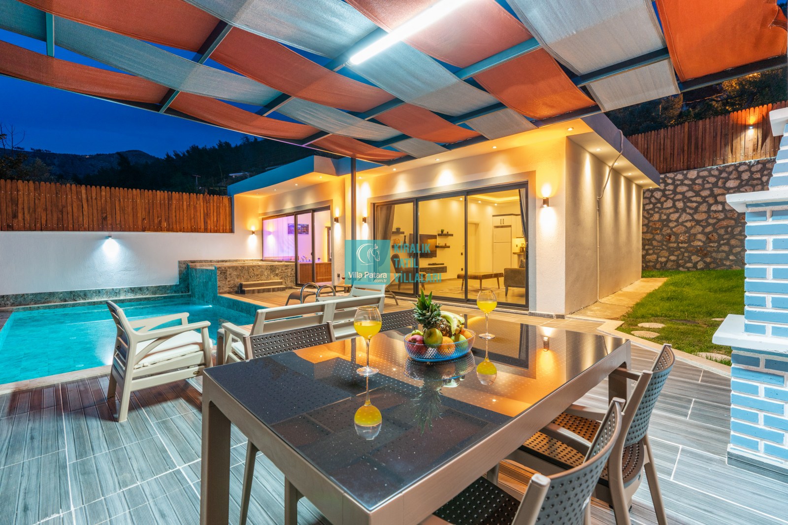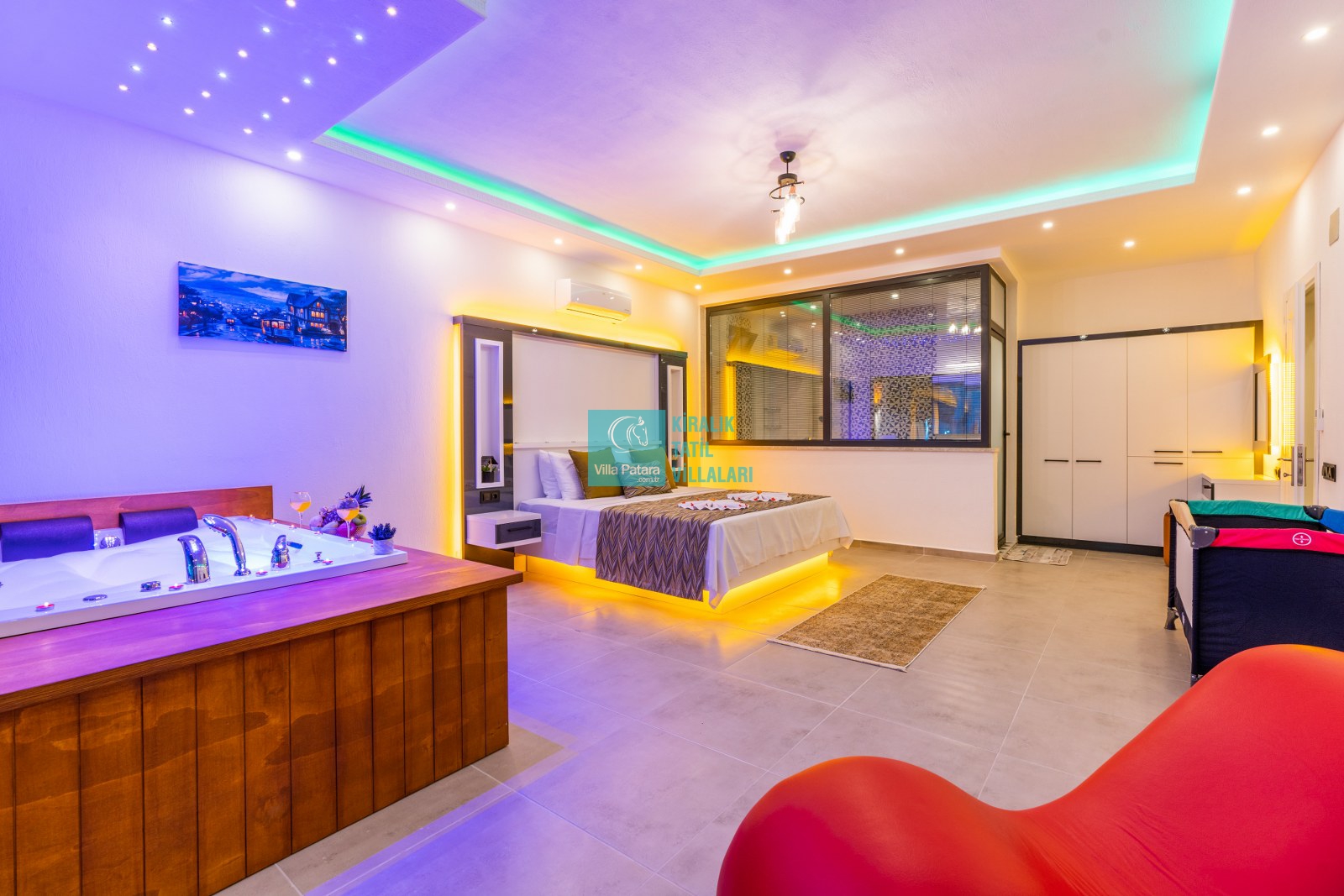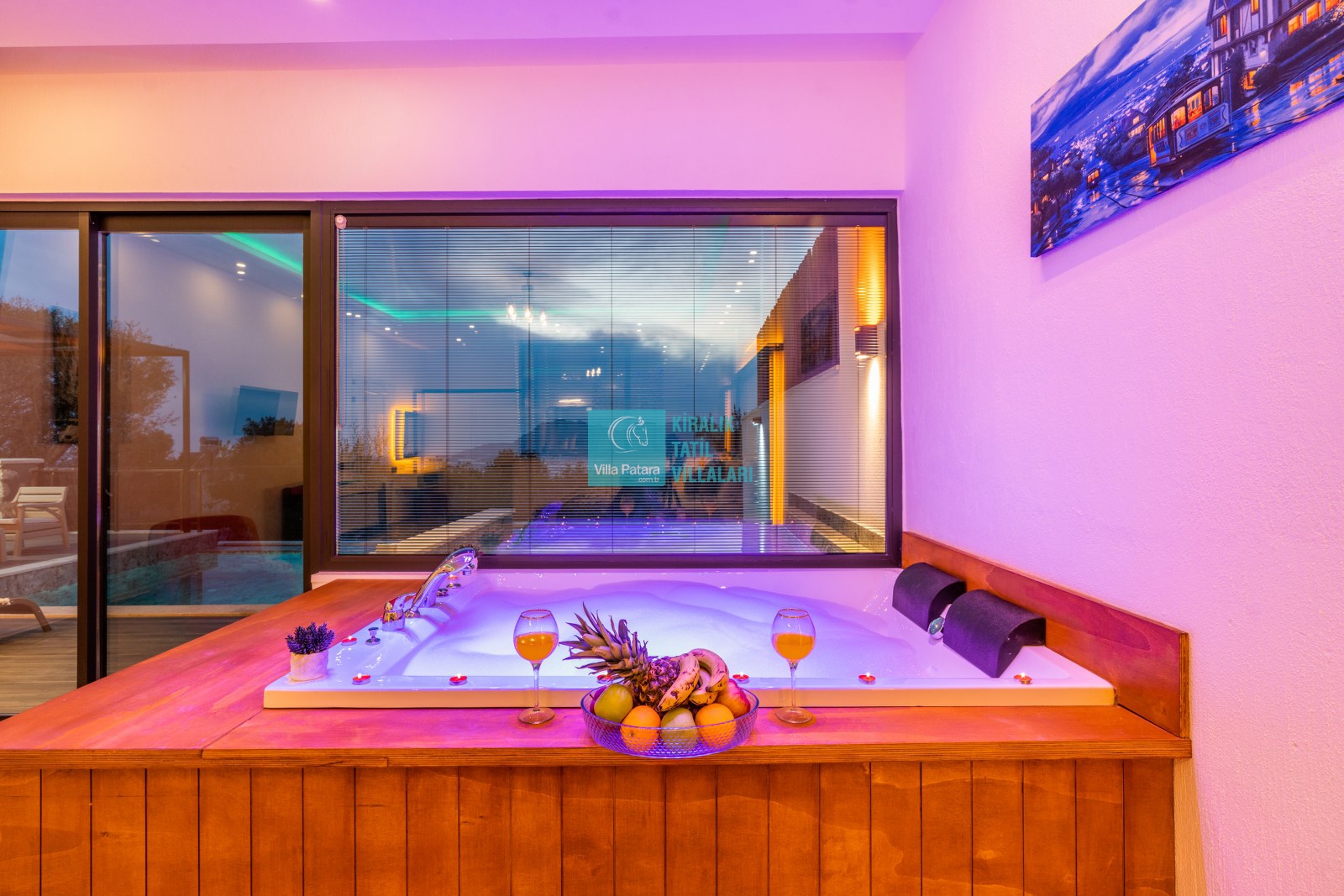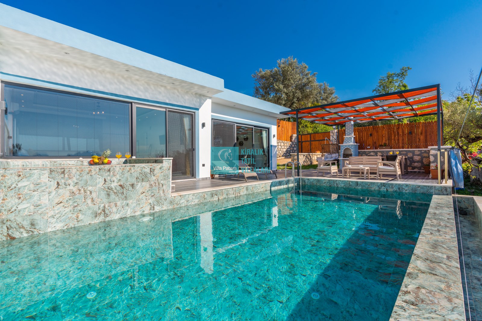 Kalkan Üzümlü mevkiinde bulunan villa, 1 yatak odasıyla 2 kişilik konaklama kapasitesi sunmaktadır. Muhteşem doğa manzarasına hakim olup balayı çiftleri için uygundur. Korunaklı havuz terasında kapasiteye uygun şezlong takımı, oturma grubu, salıncak ve barbekü alanı bulunan villanın, yine havuz terasına açılan oturma odası ve donanımlı açık mutfağı; yatak odasında çift kişilik yatak, ebeveyn banyosu ve jakuzi bulunmaktadır.