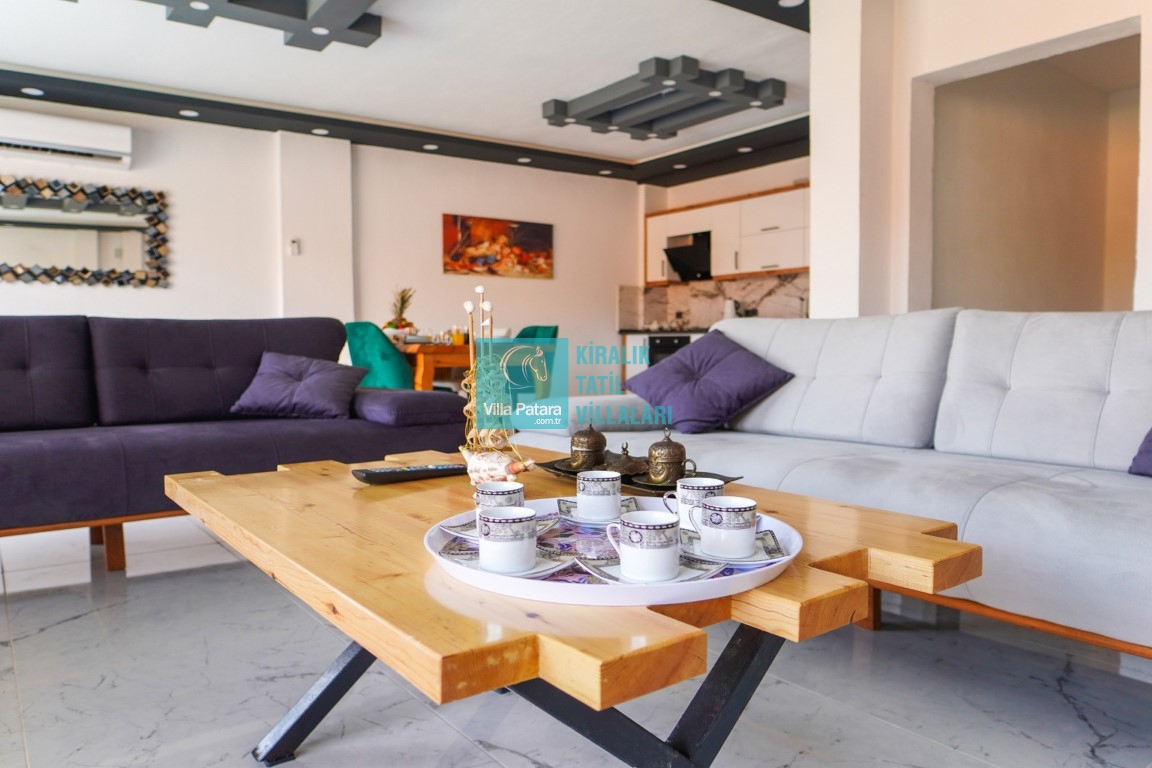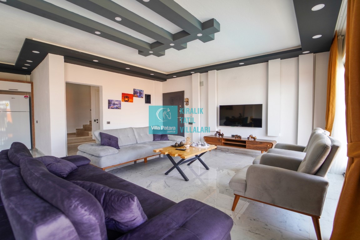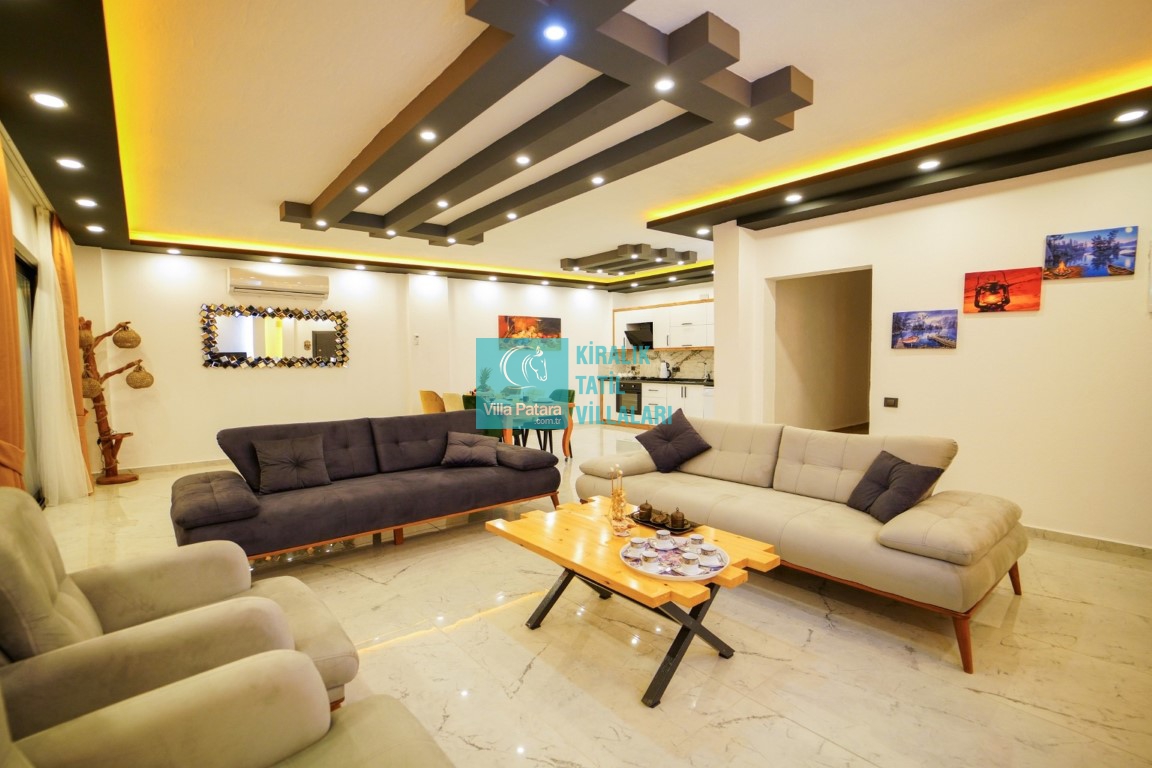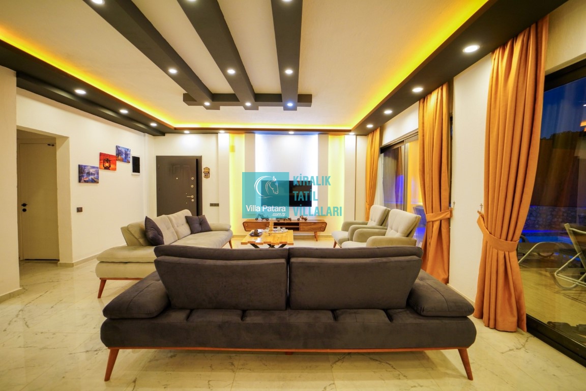 tatil imkanı sunmaktadır. Villamızın salonu modern ve şık mobilyalarla döşenmiş olup misafirlerimizin konforu sağlanmıştır.