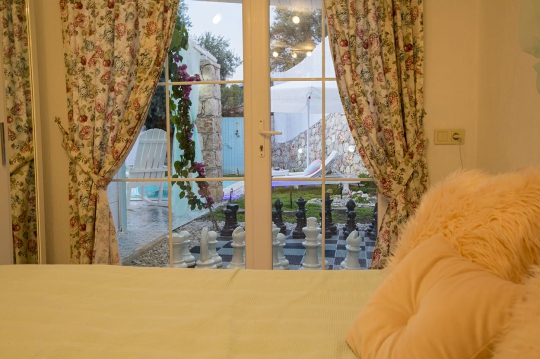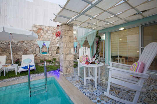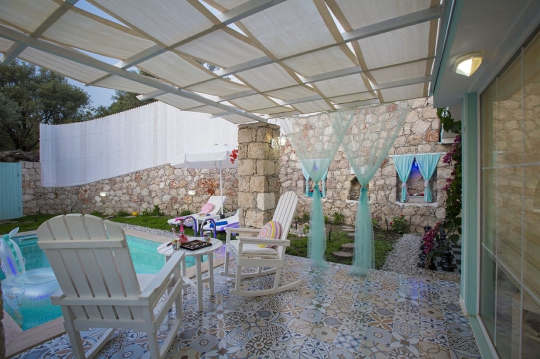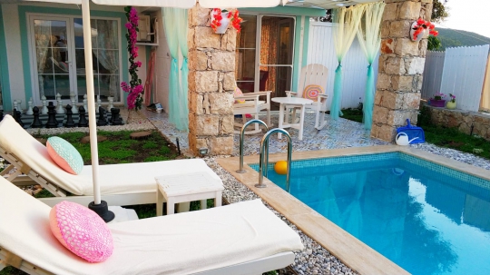 Kış aylarında da gelmeyi arzu ederseniz sıcacık ısıtılmış havuzuyla sizi kendine çeker. Kiralık villamızın bahçesinde kuş sesleri eşliğinde ister sallanır sandalyeniz de kitap okuyun , isterseniz şezlongunda bolca güneşlenin. Bu sıcacık villada içinizi bir huzur kaplar bu masal ortamında. Sevgililer her daim sevgili kalanlar için özel olarak döşenmiş villamızın iki kişilik jakuzisinde mutluluğun resmini artık siz çizebilirsiniz. Villamızın ön tarafında güzel bir orman ve Patara plajı manzarası vardır. Villamız korunaklı hale getirilmiş olup, havuzun önünde perde sistemi mevcuttur.